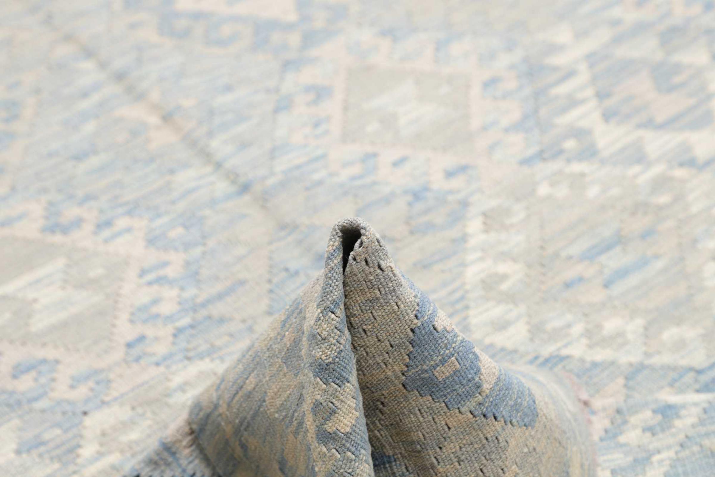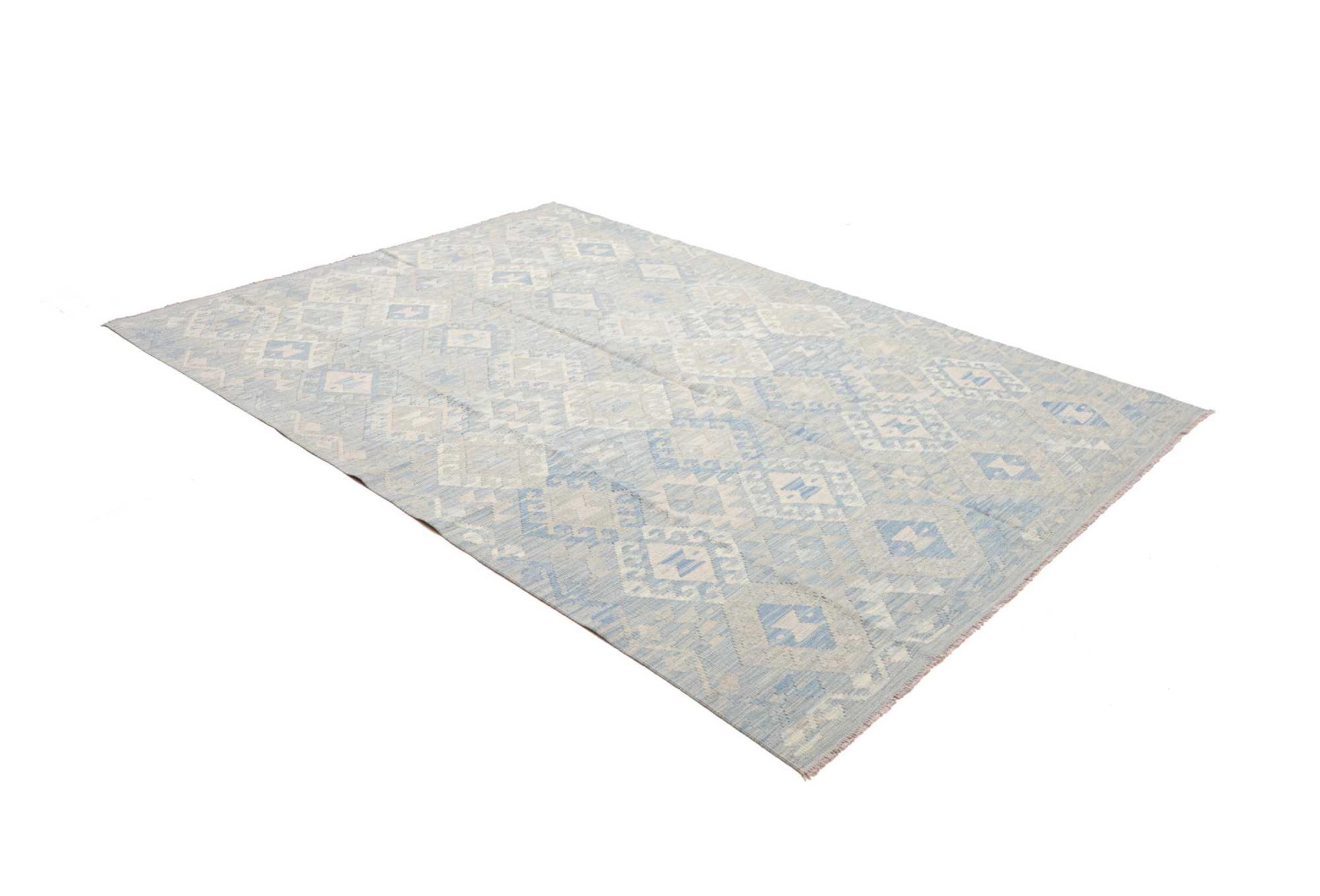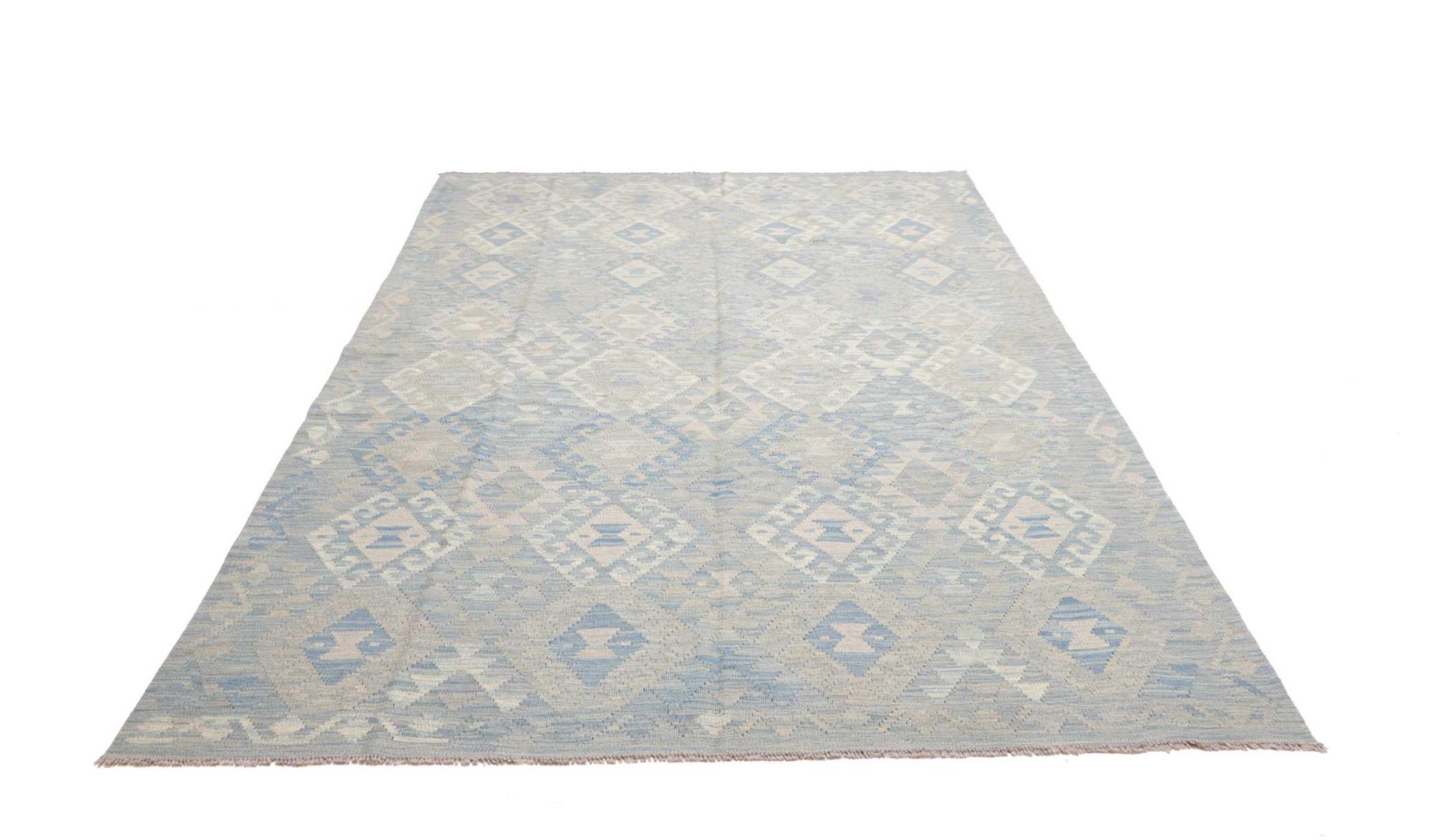 This rug was made as a flat weave by hand on a loom. Flatweave is the term used to describe rugs that have no pile. As the name promises, these rugs are woven and not knotted. This results in a flat rug with a structured surface. Flatweaves are not as soft and usually thinner than knotted rugs. At the same time they are much less complex to manufacture and can usually be laid out from both sides (front and back). Their patterns are usually geometric, which is determined by the fabric.