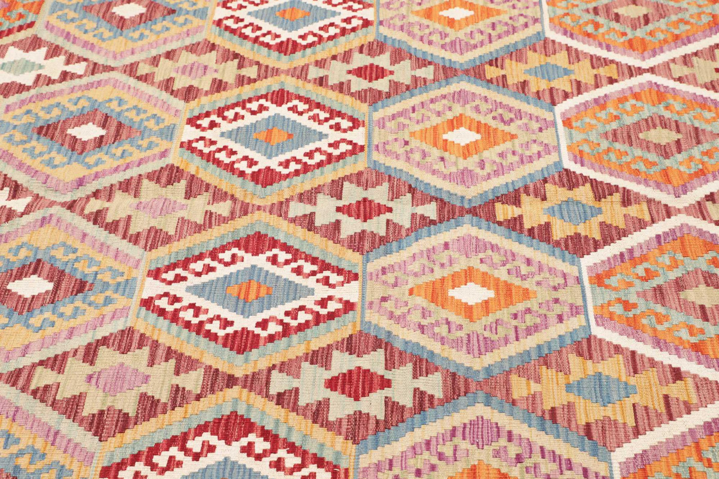 This rug was made as a flat weave by hand on a loom. Flatweave is the term used to describe rugs that have no pile. As the name promises, these rugs are woven and not knotted. This results in a flat rug with a structured surface. Flatweaves are not as soft and usually thinner than knotted rugs. At the same time they are much less complex to manufacture and can usually be laid out from both sides (front and back). Their patterns are usually geometric, which is determined by the fabric.