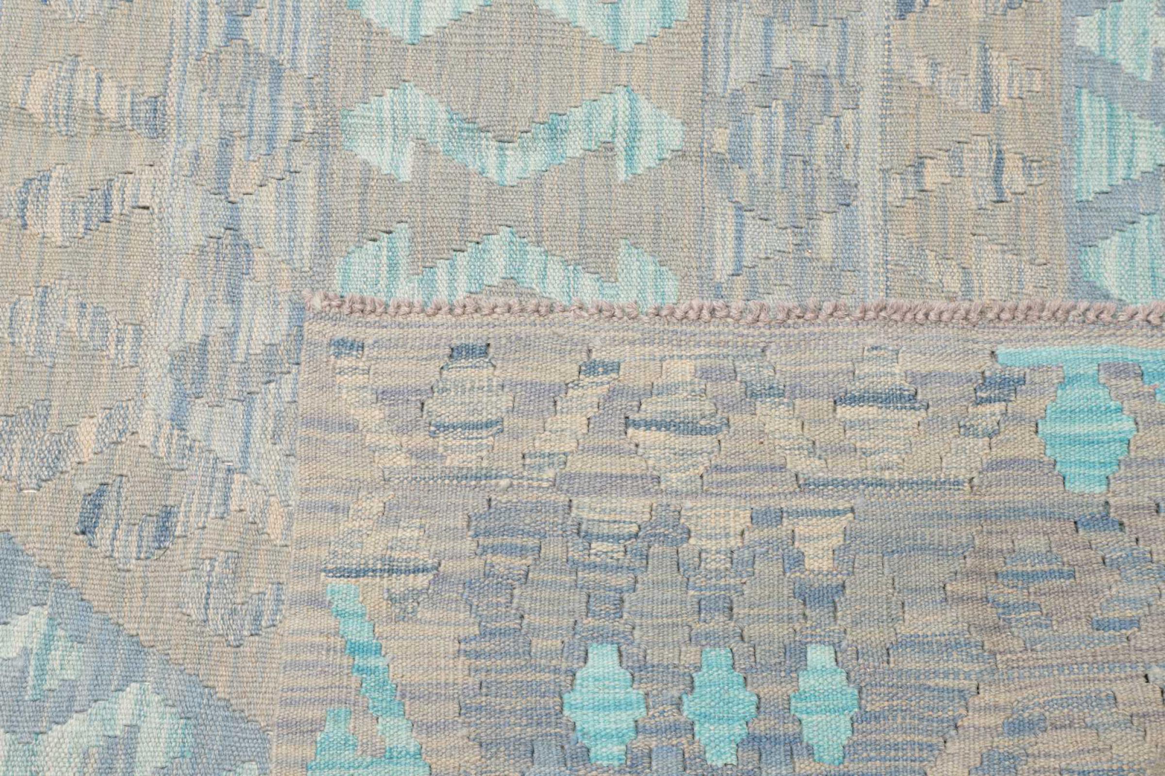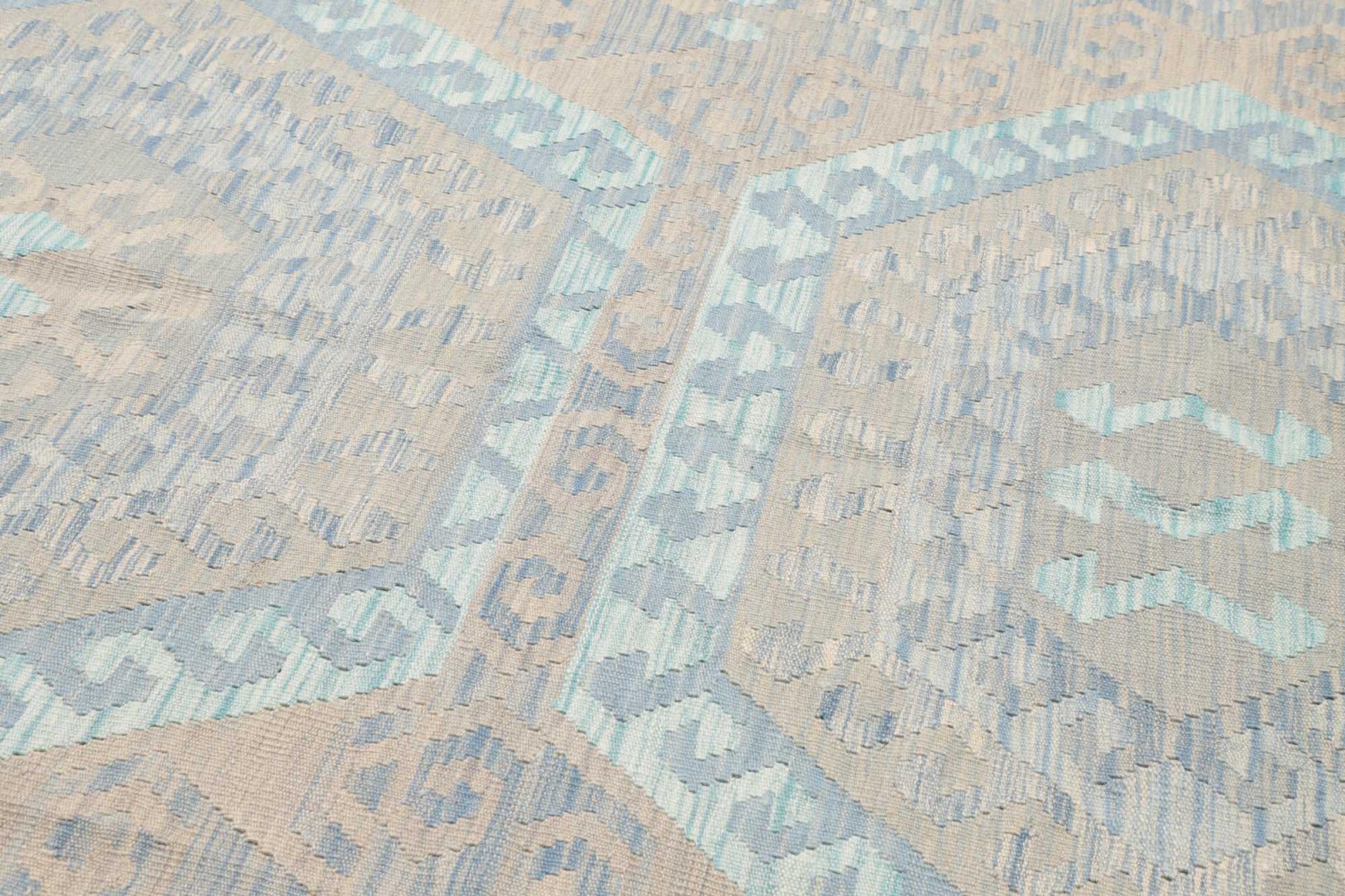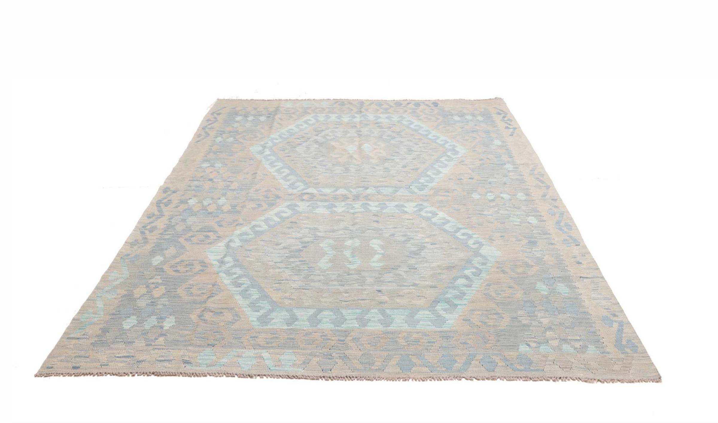 This rug was made as a flat weave by hand on a loom. Flatweave is the term used to describe rugs that have no pile. As the name promises, these rugs are woven and not knotted. This results in a flat rug with a structured surface. Flatweaves are not as soft and usually thinner than knotted rugs. At the same time they are much less complex to manufacture and can usually be laid out from both sides (front and back). Their patterns are usually geometric, which is determined by the fabric.
