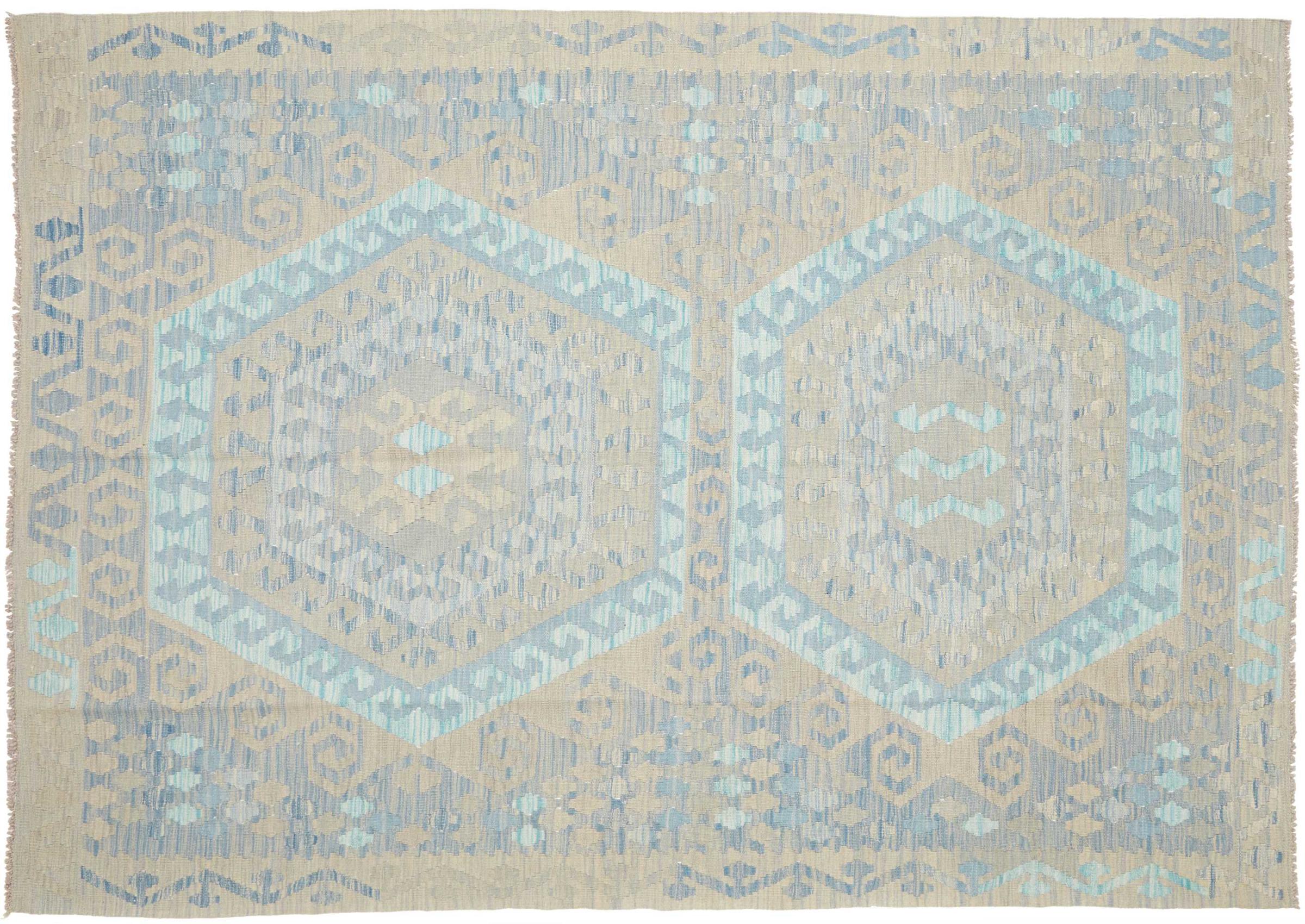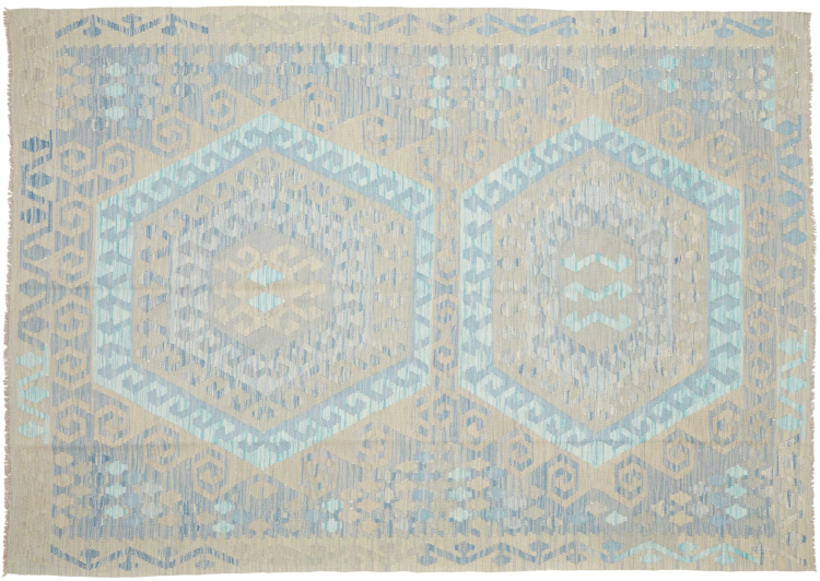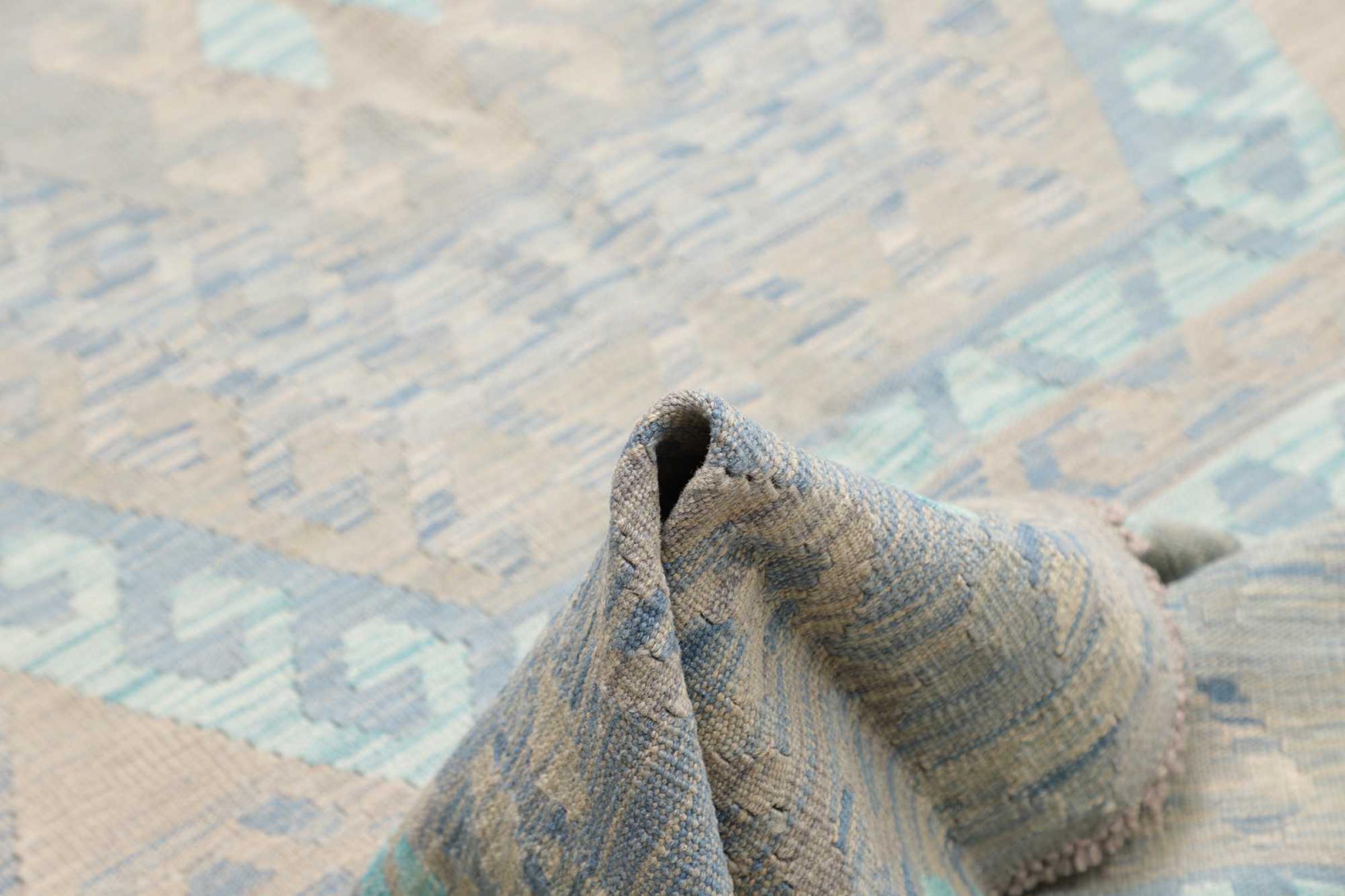 This rug was made as a flat weave by hand on a loom. Flatweave is the term used to describe rugs that have no pile. As the name promises, these rugs are woven and not knotted. This results in a flat rug with a structured surface. Flatweaves are not as soft and usually thinner than knotted rugs. At the same time they are much less complex to manufacture and can usually be laid out from both sides (front and back). Their patterns are usually geometric, which is determined by the fabric.