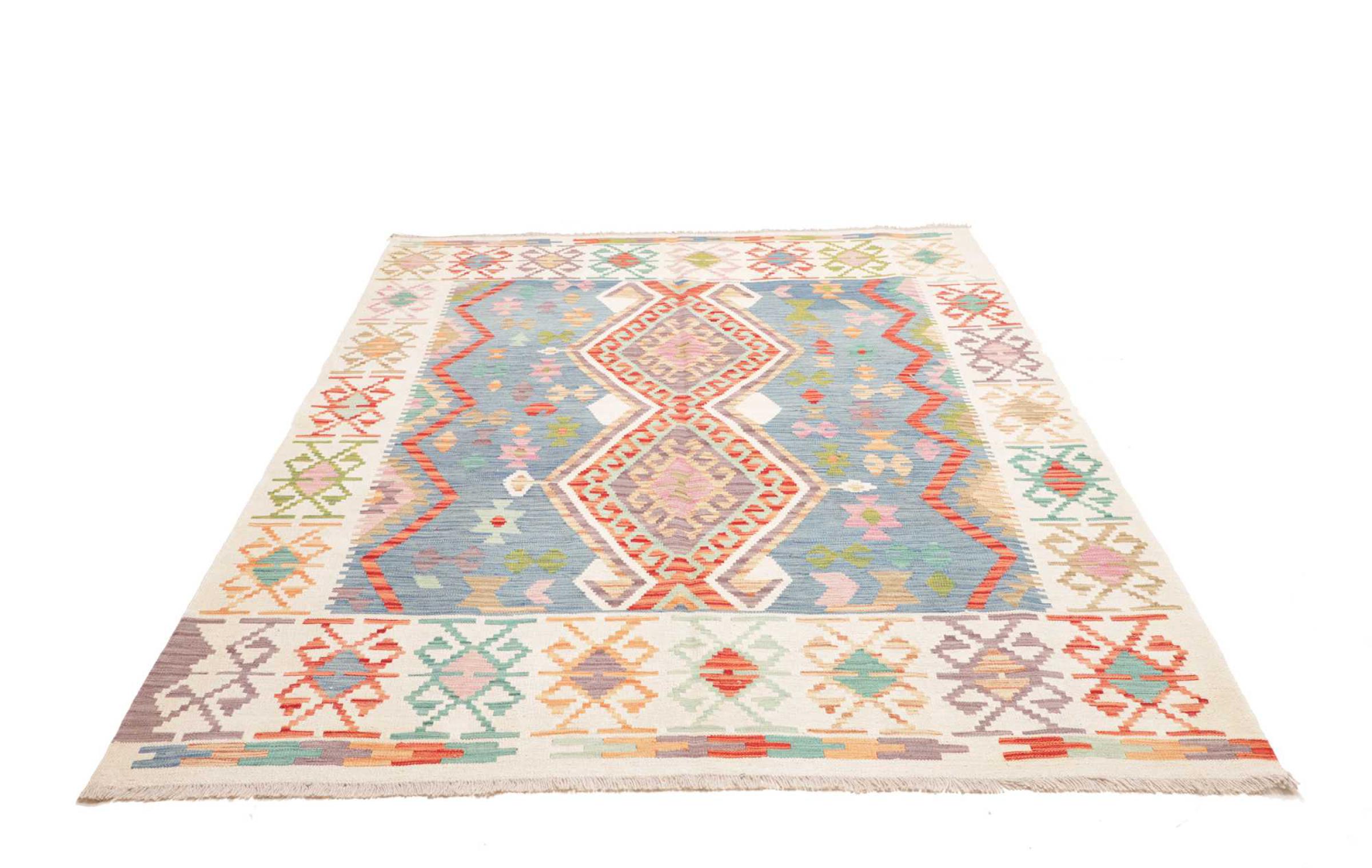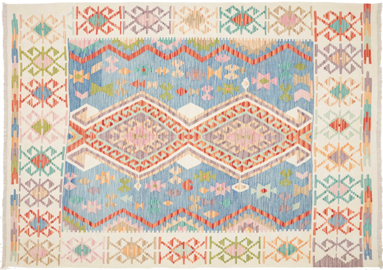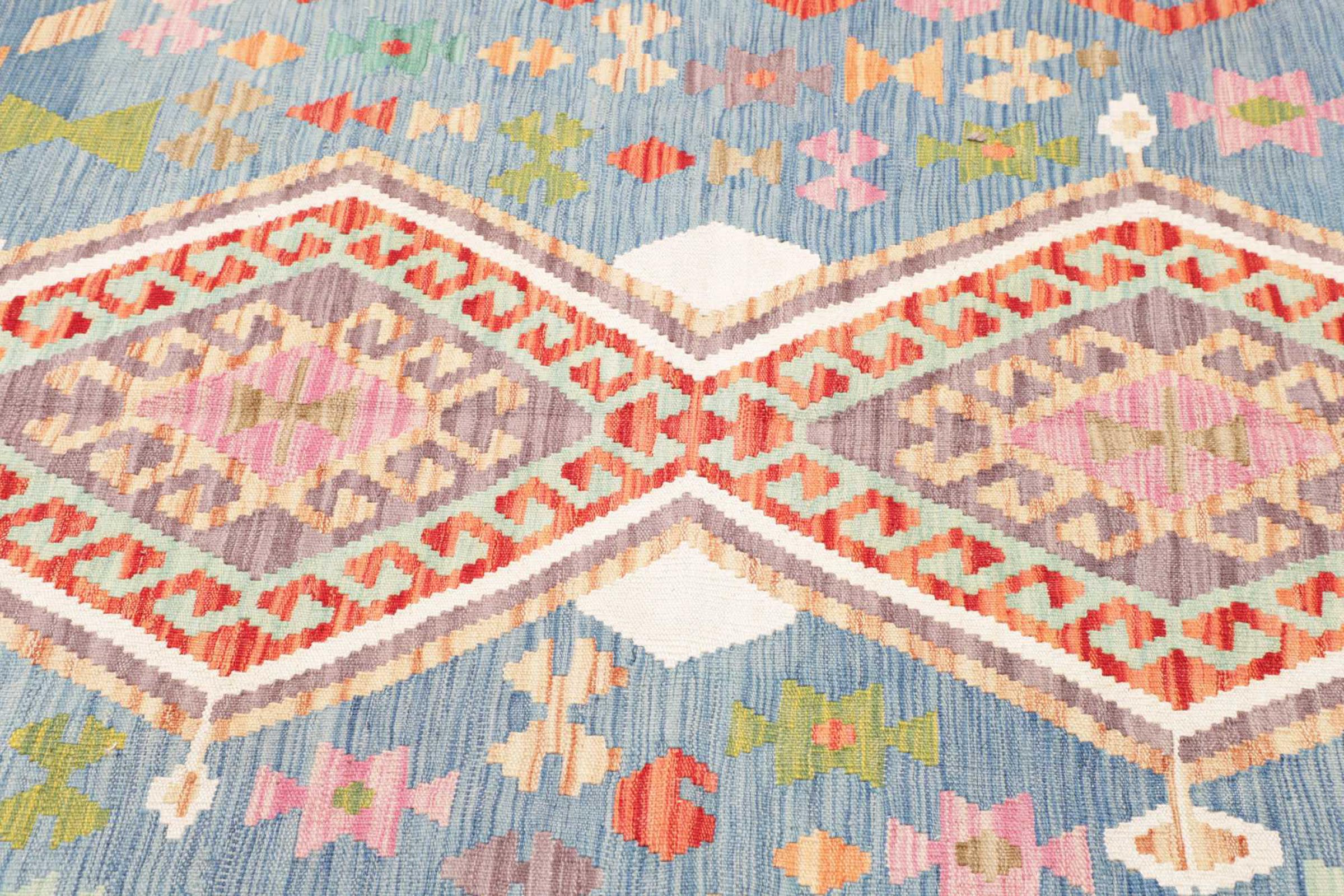 This rug was made as a flat weave by hand on a loom. Flatweave is the term used to describe rugs that have no pile. As the name promises, these rugs are woven and not knotted. This results in a flat rug with a structured surface. Flatweaves are not as soft and usually thinner than knotted rugs. At the same time they are much less complex to manufacture and can usually be laid out from both sides (front and back). Their patterns are usually geometric, which is determined by the fabric.