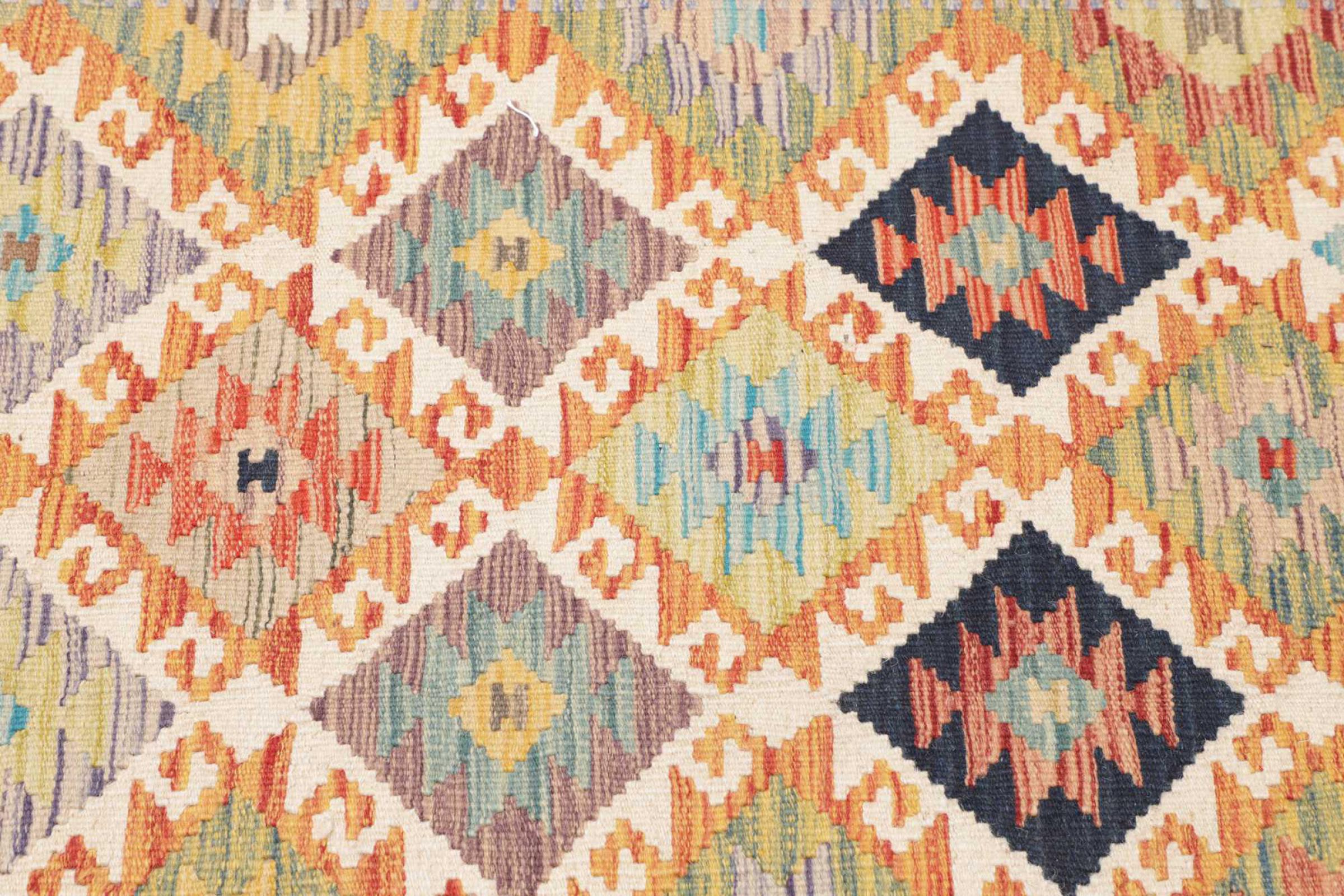 This rug was made as a flat weave by hand on a loom. Flatweave is the term used to describe rugs that have no pile. As the name promises, these rugs are woven and not knotted. This results in a flat rug with a structured surface. Flatweaves are not as soft and usually thinner than knotted rugs. At the same time they are much less complex to manufacture and can usually be laid out from both sides (front and back). Their patterns are usually geometric, which is determined by the fabric.