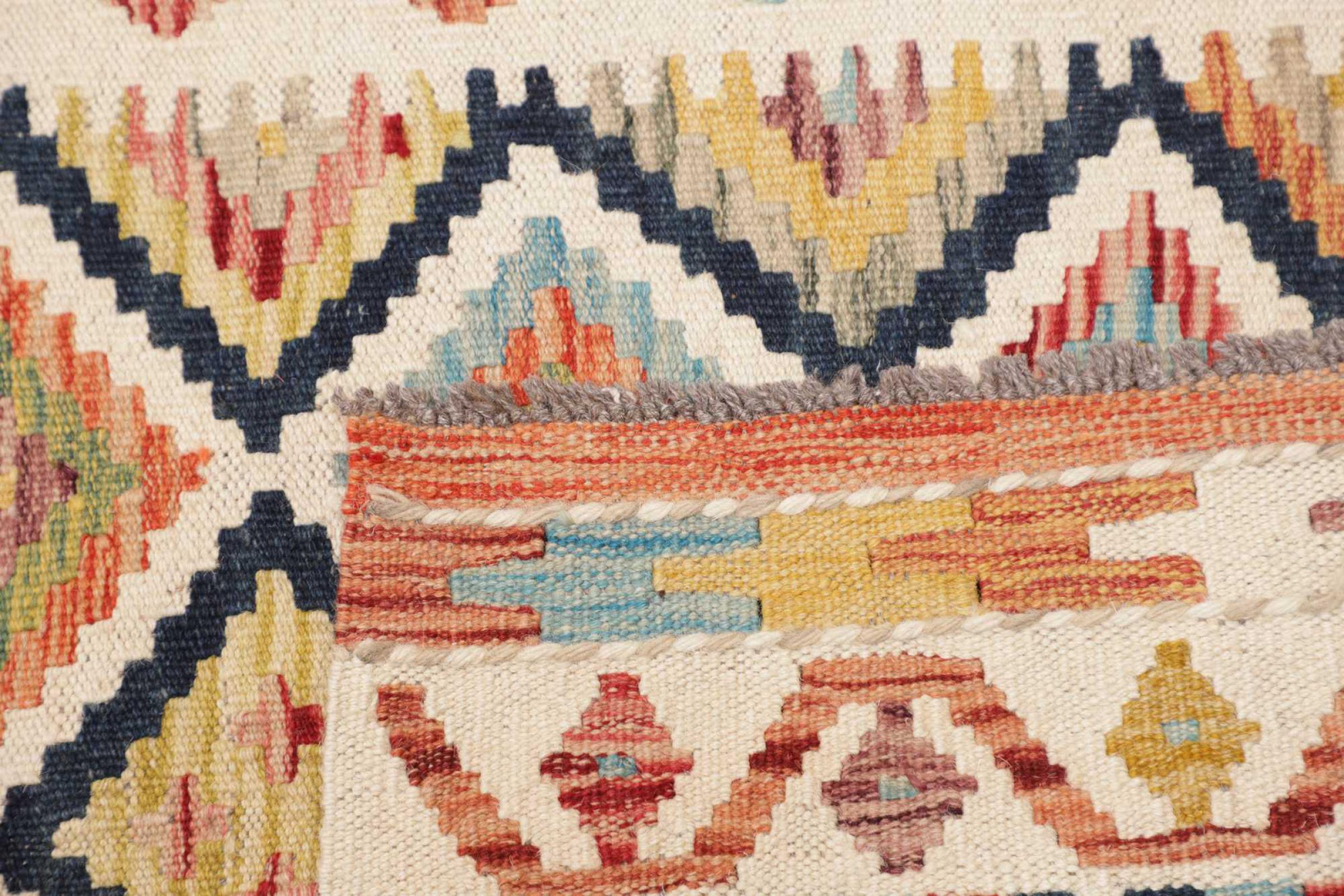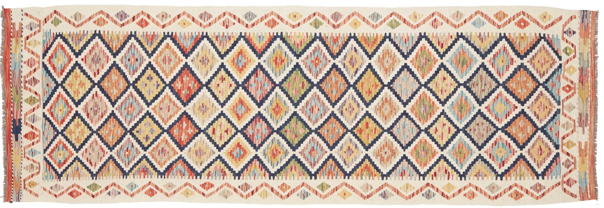 This handwoven Kilim Afghan is a wonderful and unique piece of art. Hard to believe that these modern colours and patterns have already been used centuries ago. This carpet has been woven by hand in old tradition in Afghanistan. It delivers a portion of contemporary history, which you won't find in this specific design a second time. It consists of high-grade natural wool and gives your home a personalised touch.