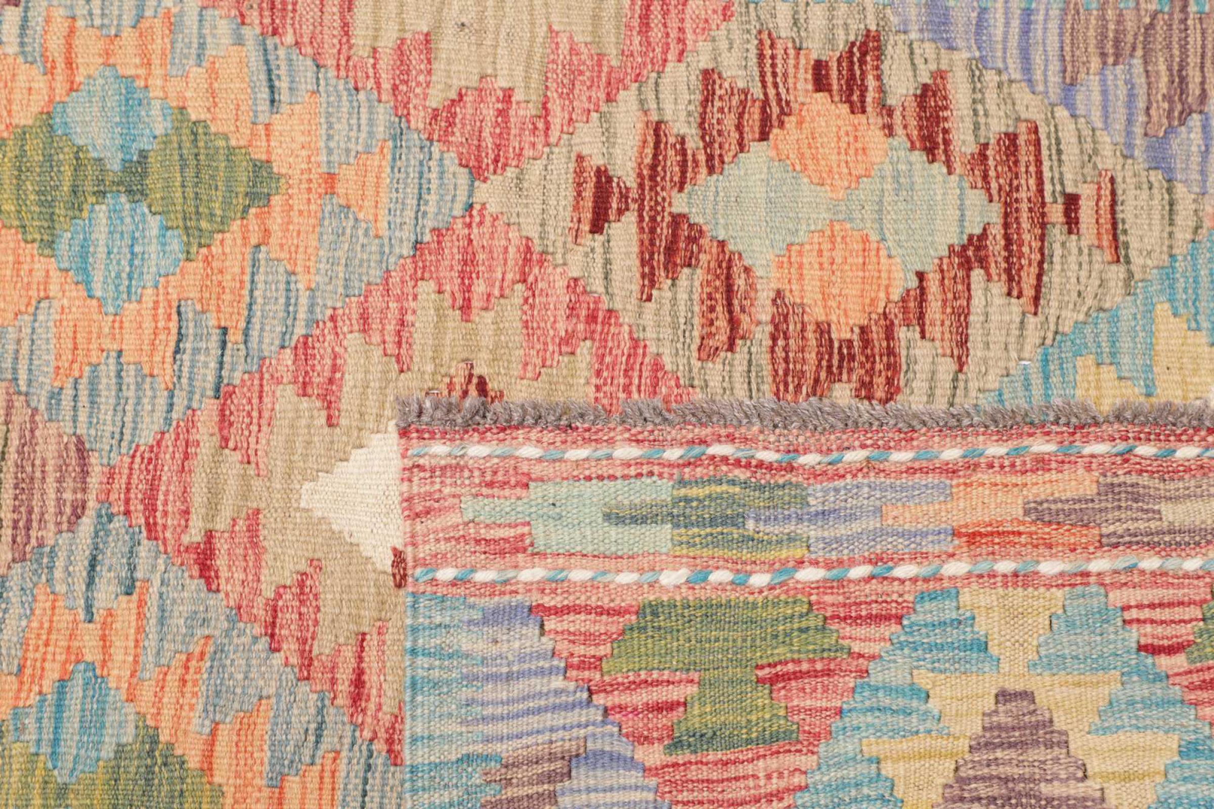 This rug was made as a flat weave by hand on a loom. Flatweave is the term used to describe rugs that have no pile. As the name promises, these rugs are woven and not knotted. This results in a flat rug with a structured surface. Flatweaves are not as soft and usually thinner than knotted rugs. At the same time they are much less complex to manufacture and can usually be laid out from both sides (front and back). Their patterns are usually geometric, which is determined by the fabric.