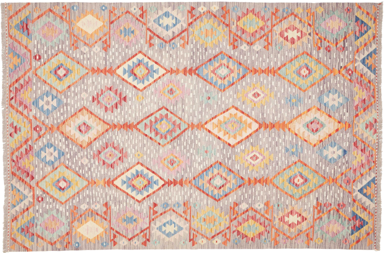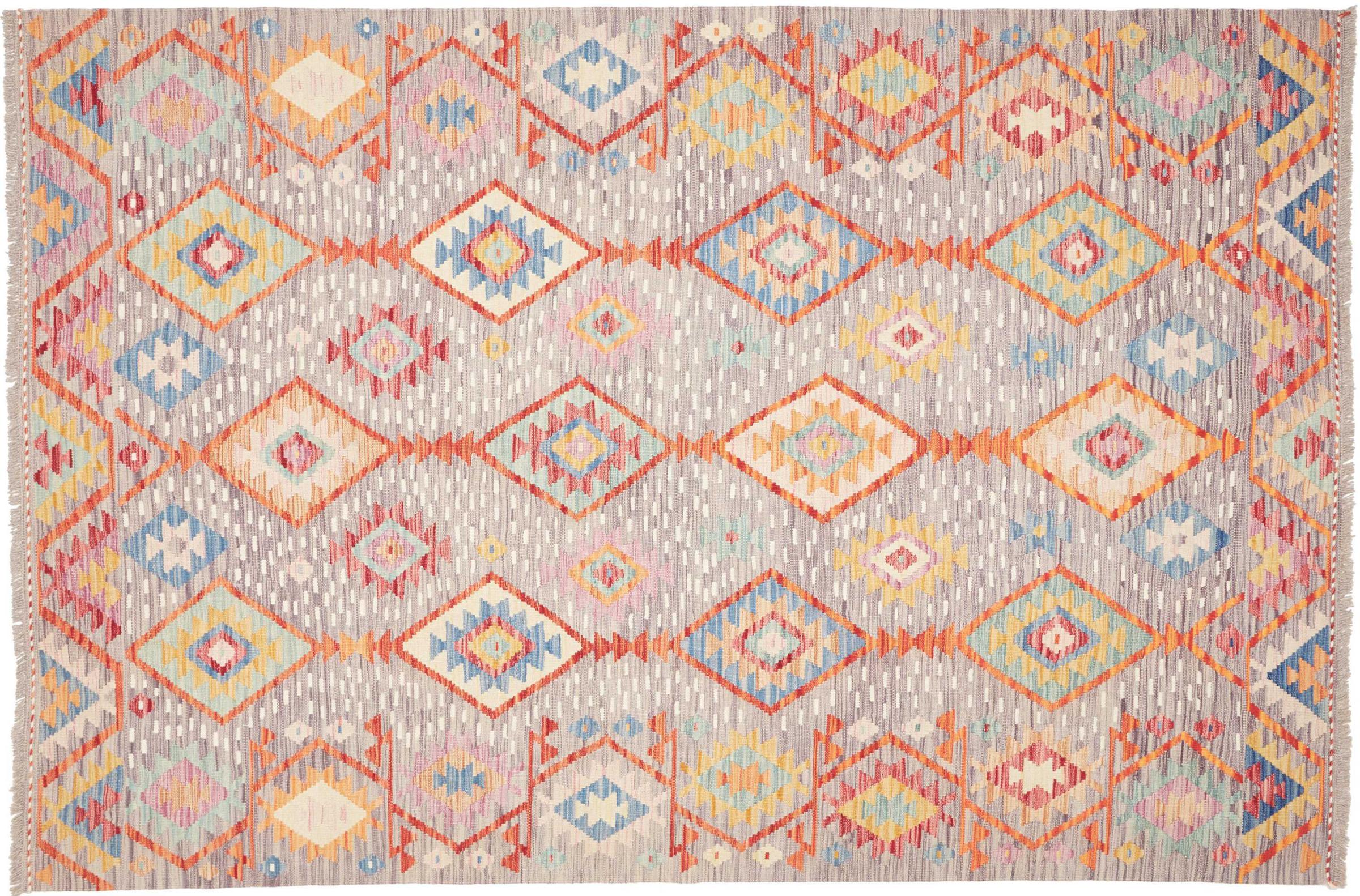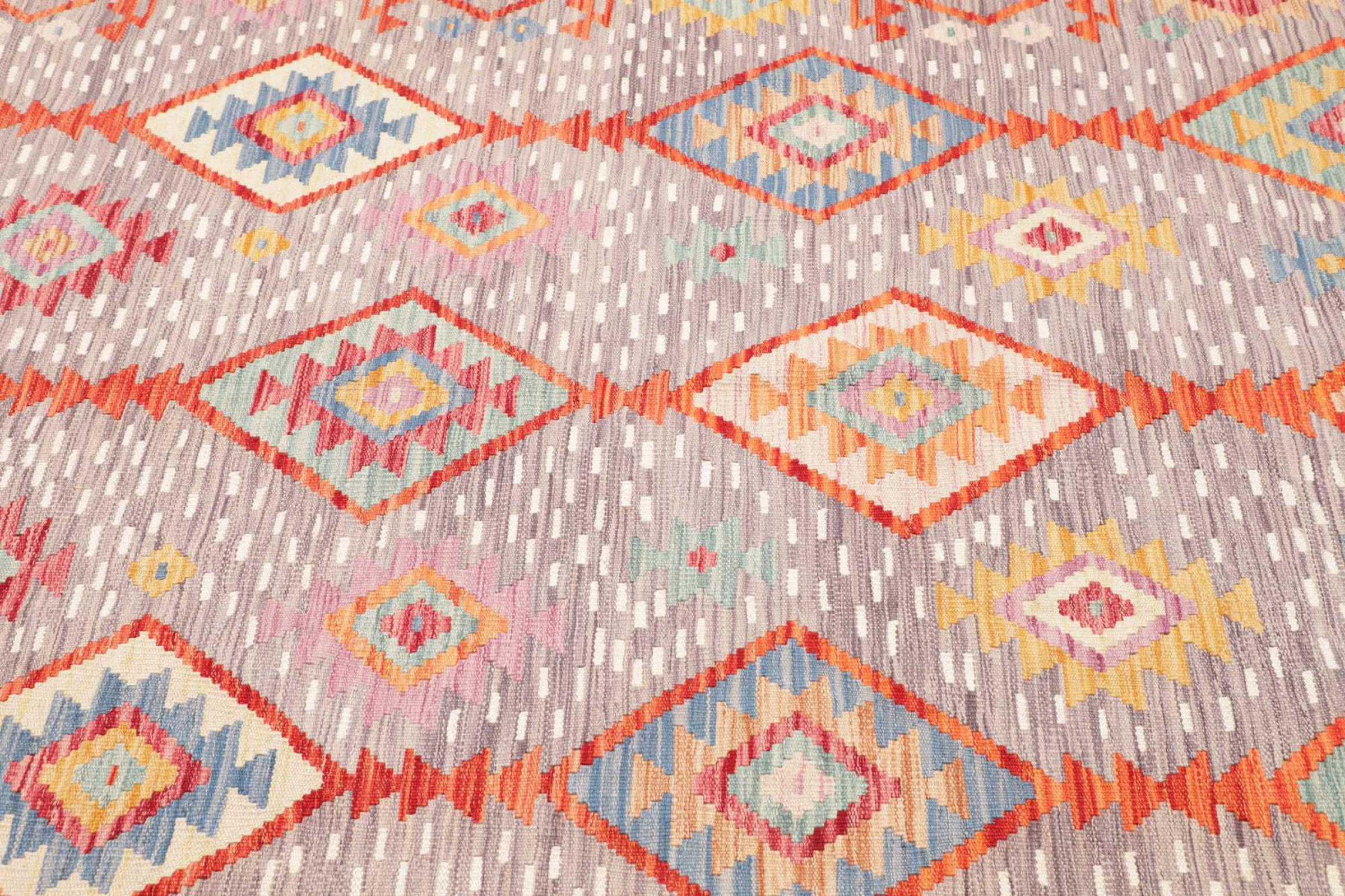 This rug was made as a flat weave by hand on a loom. Flatweave is the term used to describe rugs that have no pile. As the name promises, these rugs are woven and not knotted. This results in a flat rug with a structured surface. Flatweaves are not as soft and usually thinner than knotted rugs. At the same time they are much less complex to manufacture and can usually be laid out from both sides (front and back). Their patterns are usually geometric, which is determined by the fabric.