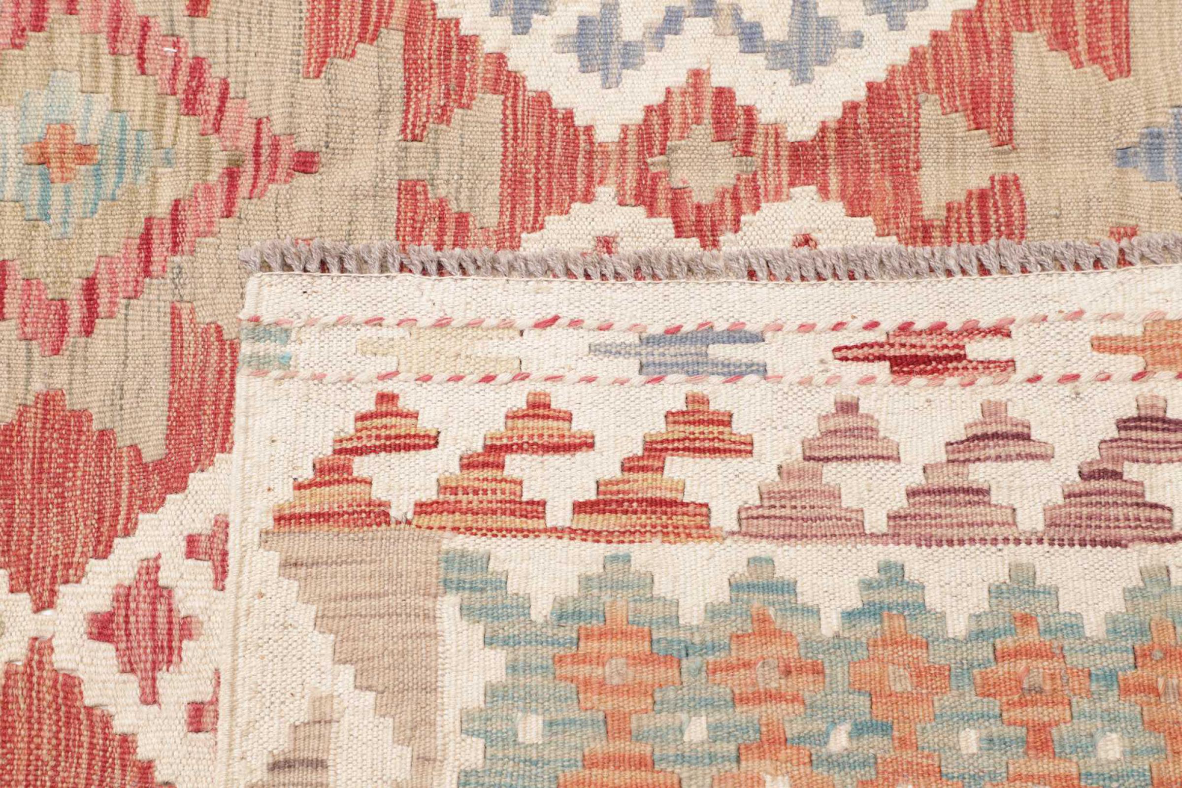 This rug was made as a flat weave by hand on a loom. Flatweave is the term used to describe rugs that have no pile. As the name promises, these rugs are woven and not knotted. This results in a flat rug with a structured surface. Flatweaves are not as soft and usually thinner than knotted rugs. At the same time they are much less complex to manufacture and can usually be laid out from both sides (front and back). Their patterns are usually geometric, which is determined by the fabric.