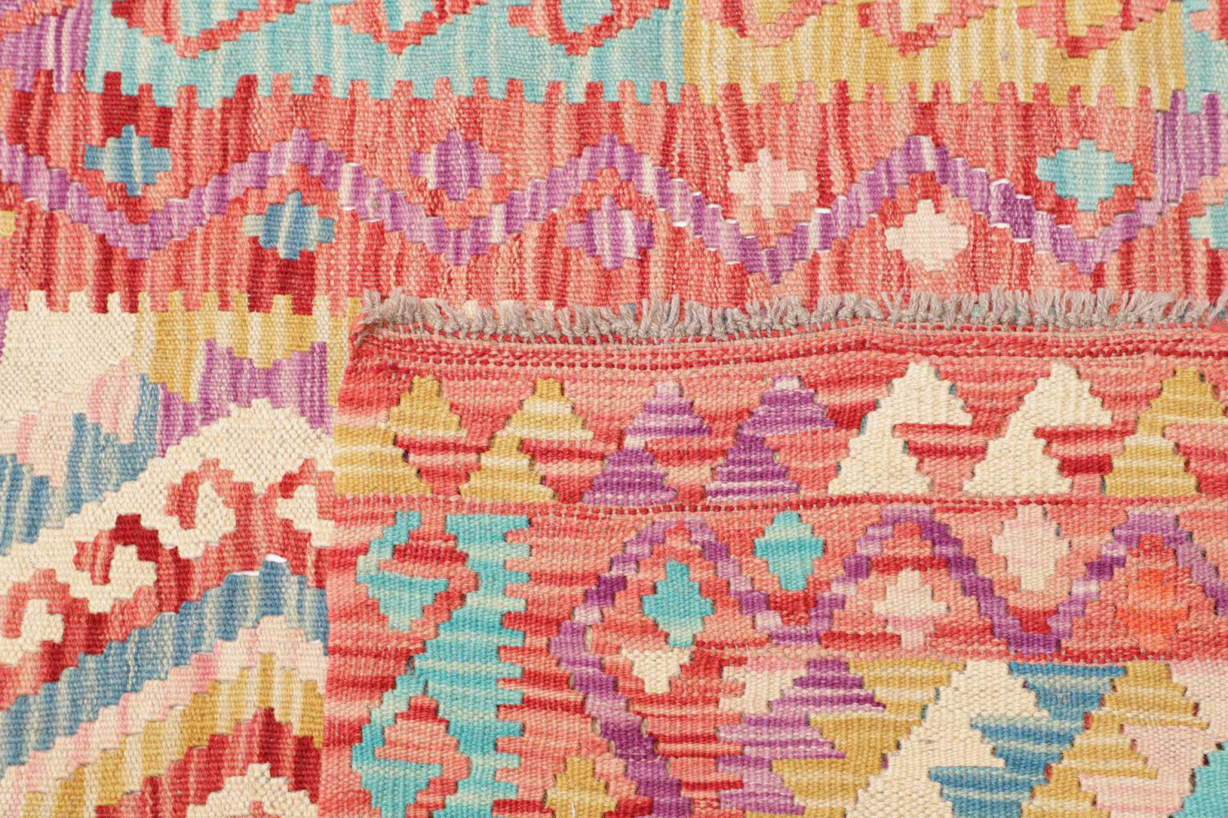 This rug was made as a flat weave by hand on a loom. Flatweave is the term used to describe rugs that have no pile. As the name promises, these rugs are woven and not knotted. This results in a flat rug with a structured surface. Flatweaves are not as soft and usually thinner than knotted rugs. At the same time they are much less complex to manufacture and can usually be laid out from both sides (front and back). Their patterns are usually geometric, which is determined by the fabric.