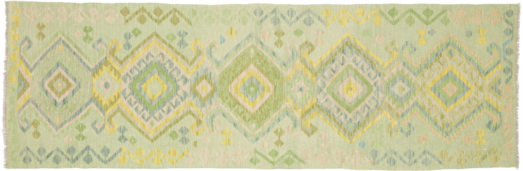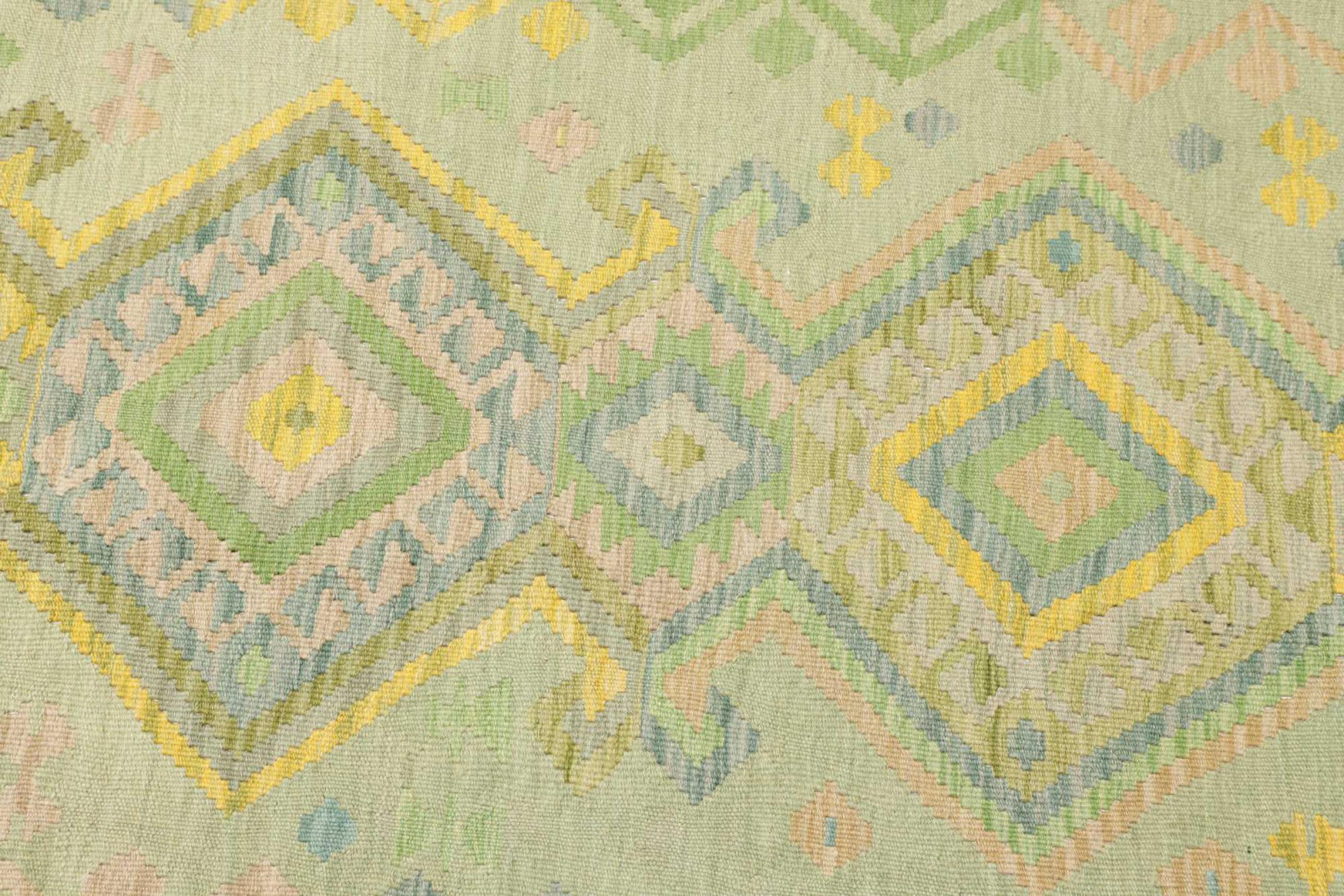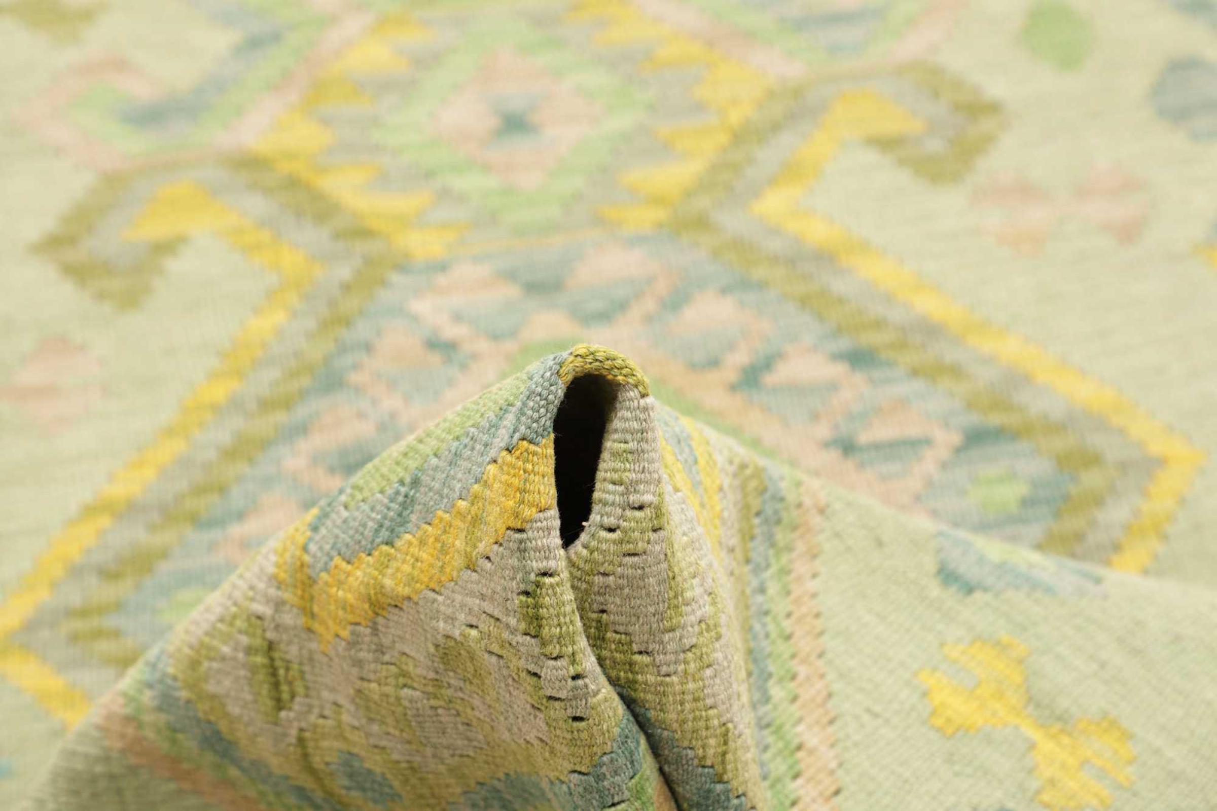 This rug was made as a flat weave by hand on a loom. Flatweave is the term used to describe rugs that have no pile. As the name promises, these rugs are woven and not knotted. This results in a flat rug with a structured surface. Flatweaves are not as soft and usually thinner than knotted rugs. At the same time they are much less complex to manufacture and can usually be laid out from both sides (front and back). Their patterns are usually geometric, which is determined by the fabric.