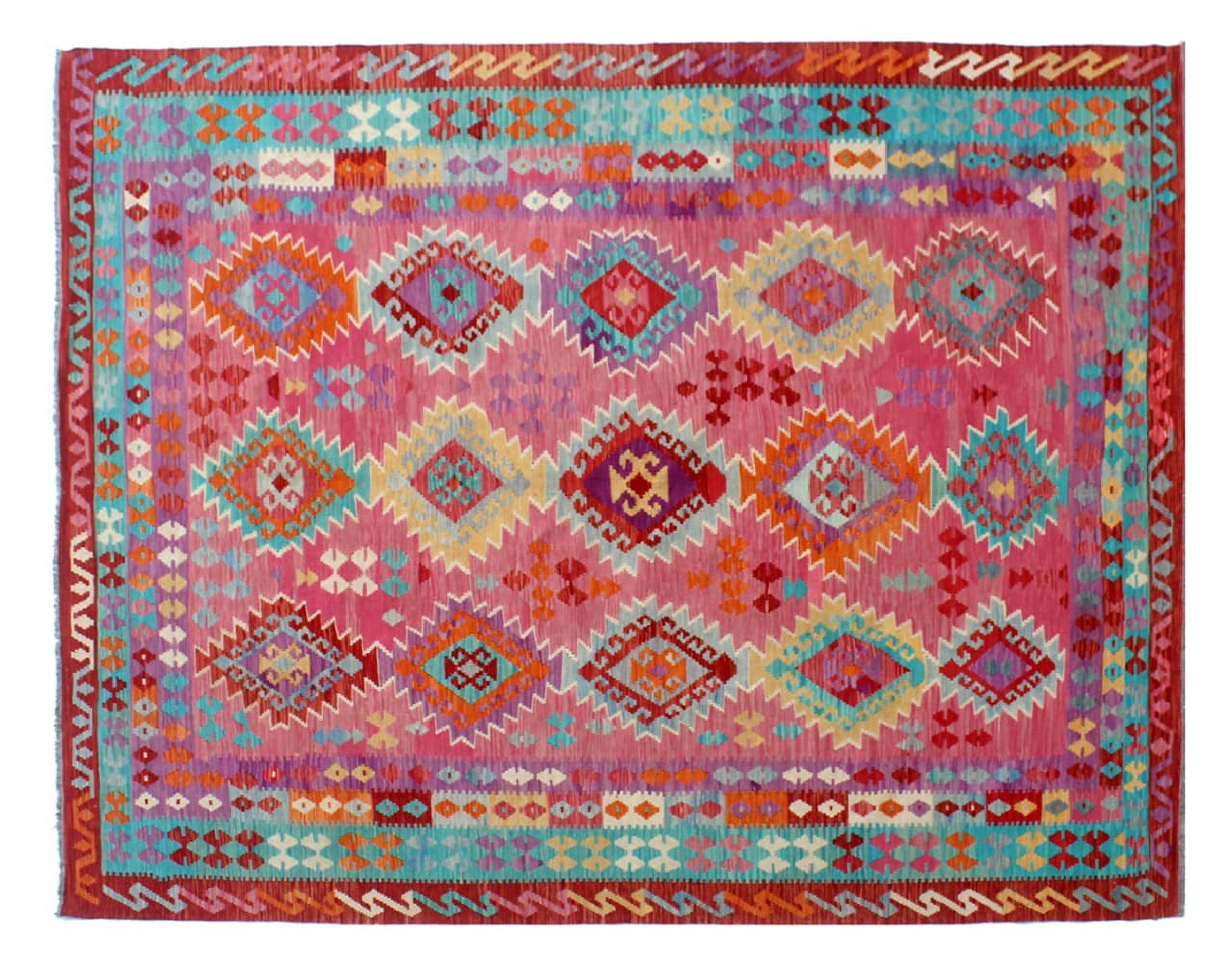 This handwoven Kilim Afghan is a wonderful and unique piece of art. Hard to believe that these modern colours and patterns have already been used centuries ago. This carpet has been woven by hand in old tradition in Afghanistan. It delivers a portion of contemporary history, which you won't find in this specific design a second time. It consists of high-grade natural wool and gives your home a personalised touch.