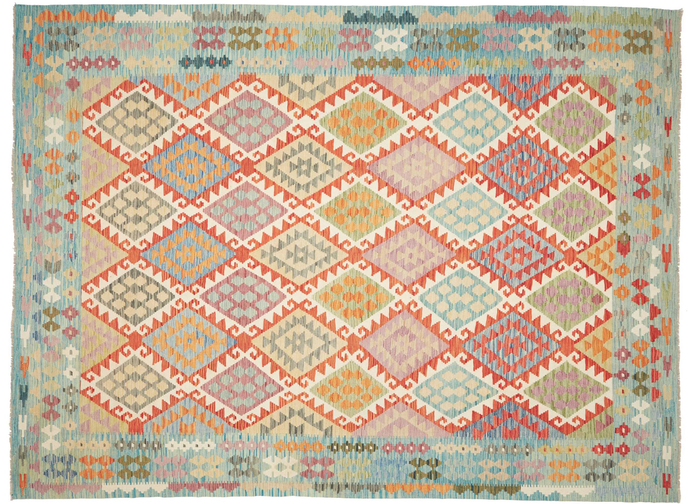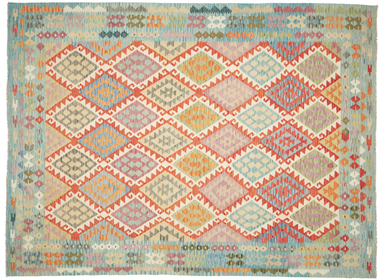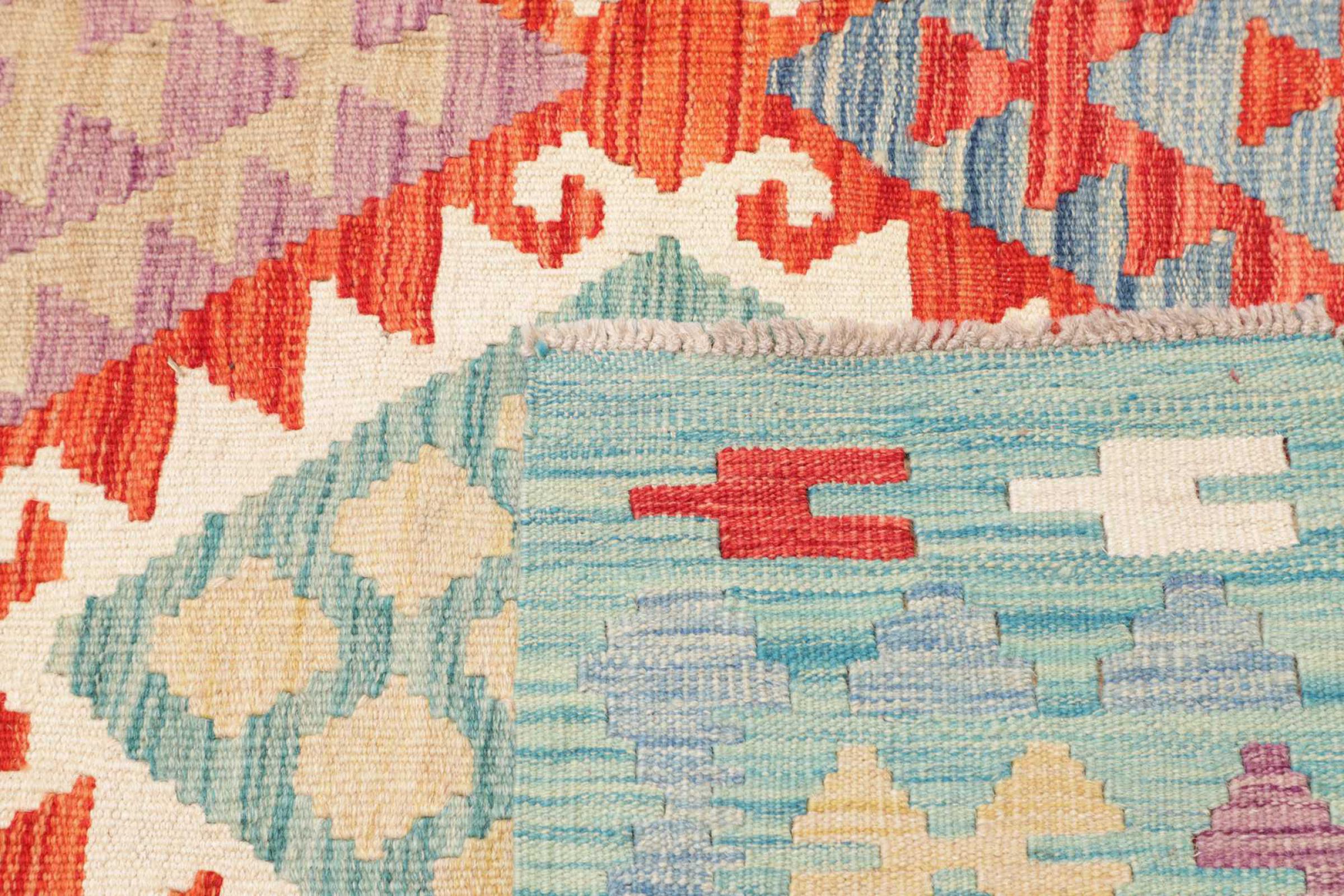 This handwoven Kilim Afghan is a wonderful and unique piece of art. Hard to believe that these modern colours and patterns have already been used centuries ago. This carpet has been woven by hand in old tradition in Afghanistan. It delivers a portion of contemporary history, which you won't find in this specific design a second time. It consists of high-grade natural wool and gives your home a personalised touch.