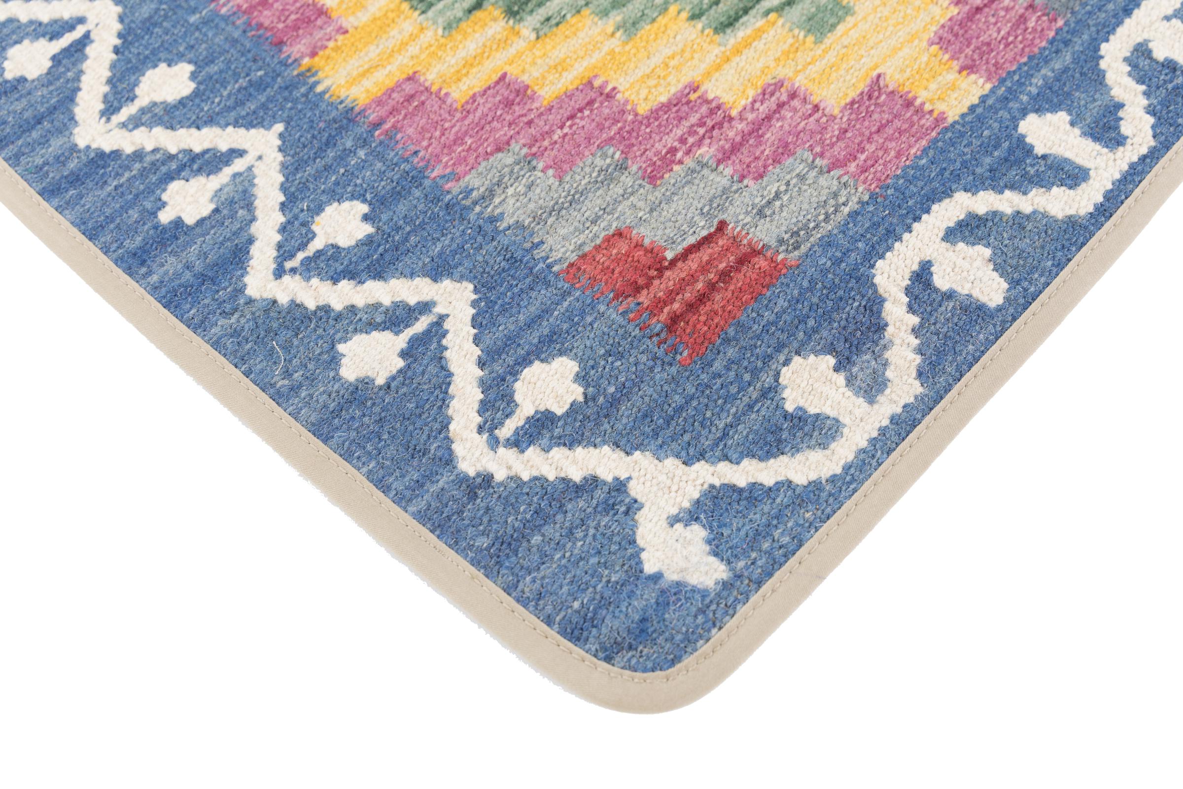 This handwoven Kilim Afghan is a wonderful and unique piece of art. Hard to believe that these modern colours and patterns have already been used centuries ago. This carpet has been woven by hand in old tradition in Afghanistan. It delivers a portion of contemporary history, which you won't find in this specific design a second time. It consists of high-grade natural wool and gives your home a personalised touch.