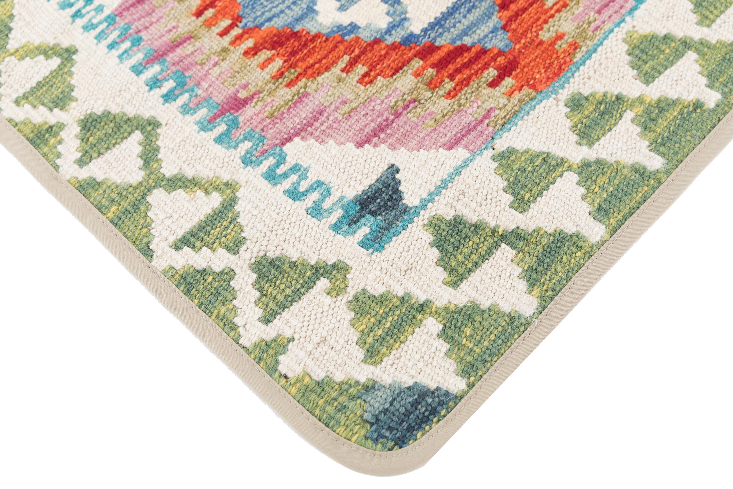 This handwoven Kilim Afghan is a wonderful and unique piece of art. Hard to believe that these modern colours and patterns have already been used centuries ago. This carpet has been woven by hand in old tradition in Afghanistan. It delivers a portion of contemporary history, which you won't find in this specific design a second time. It consists of high-grade natural wool and gives your home a personalised touch.