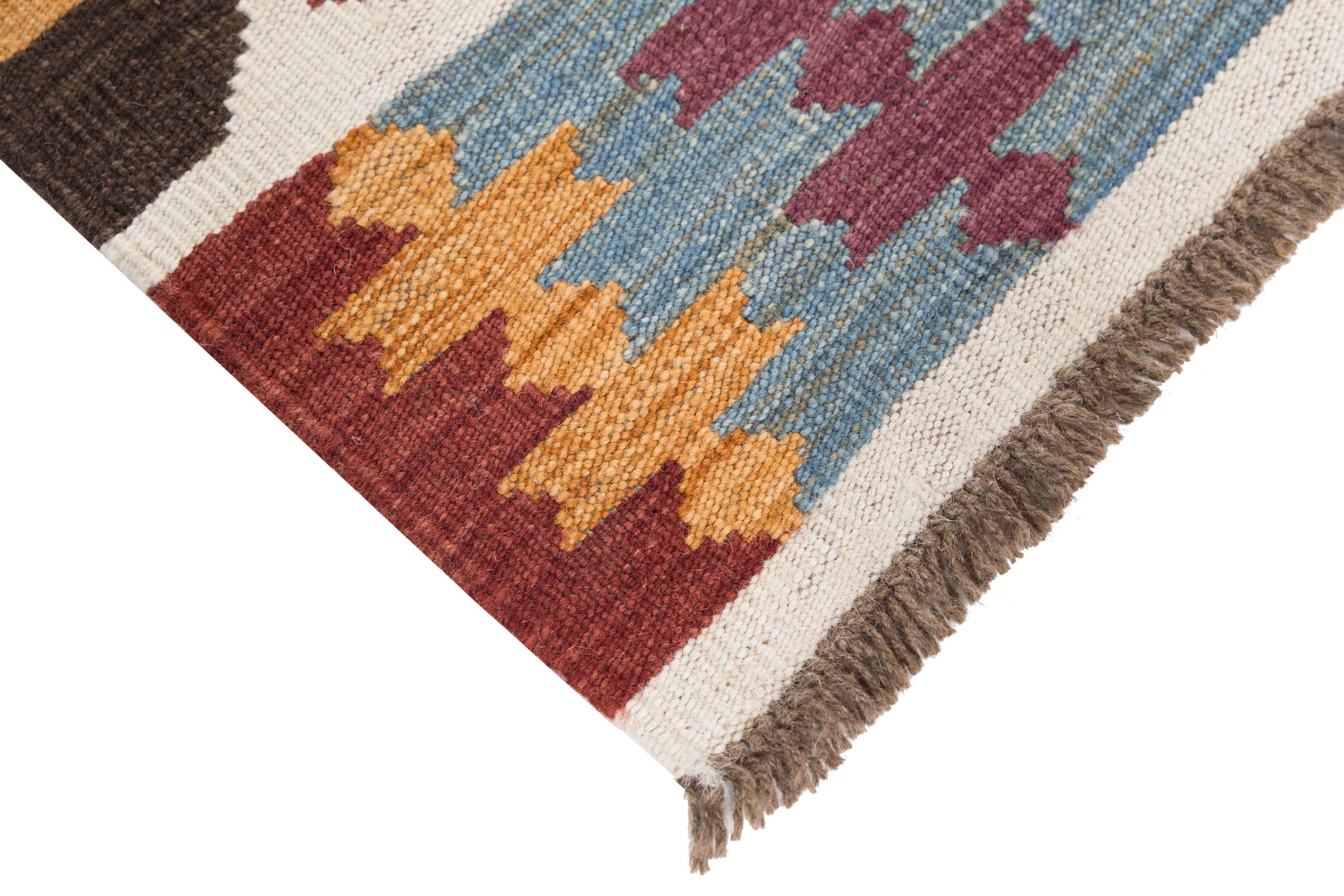 This rug was made as a flat weave by hand on a loom. Flatweave is the term used to describe rugs that have no pile. As the name promises, these rugs are woven and not knotted. This results in a flat rug with a structured surface. Flatweaves are not as soft and usually thinner than knotted rugs. At the same time they are much less complex to manufacture and can usually be laid out from both sides (front and back). Their patterns are usually geometric, which is determined by the fabric.