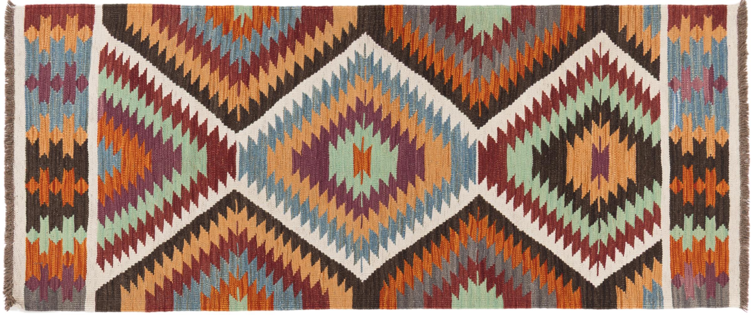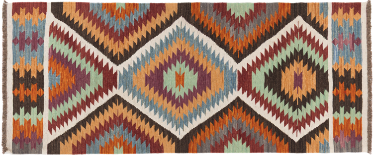 Carpet ID: 2949970049796 Size: 199x83 cm Thickness: ap. 3 mm Manufacturing: Woven by hand Pile: Handspun wool Warp: Sheep wool Origin: Afghanistan Age: New Weight: ap. 2 kg Also know as Kilim, Qilim, Chilim, Afgan, Afghán In stock: Unique - Only 1 in stock