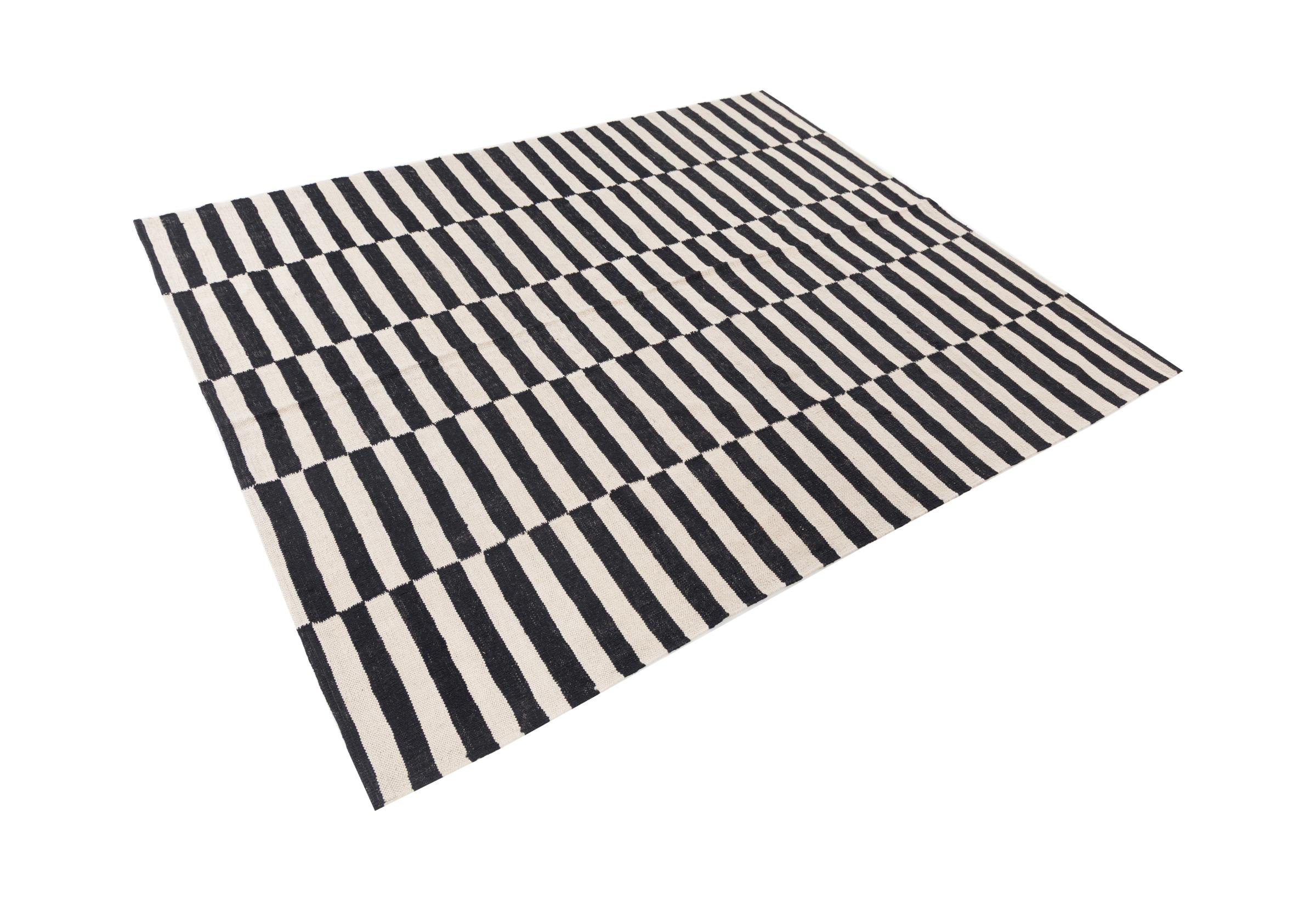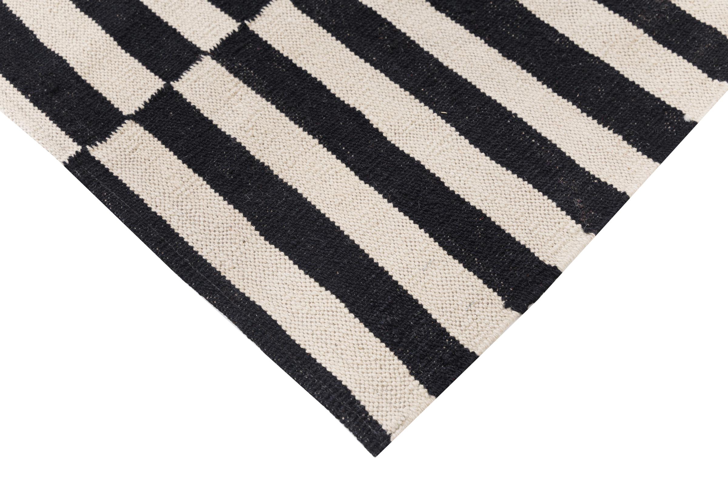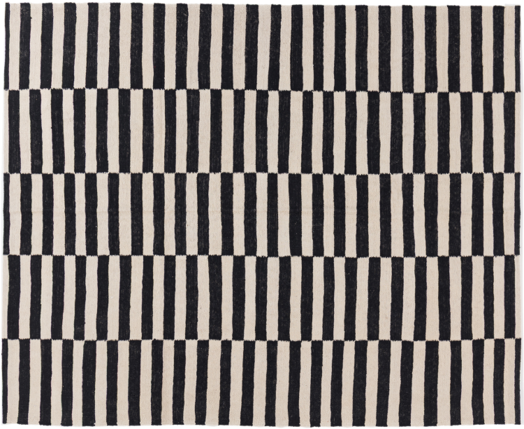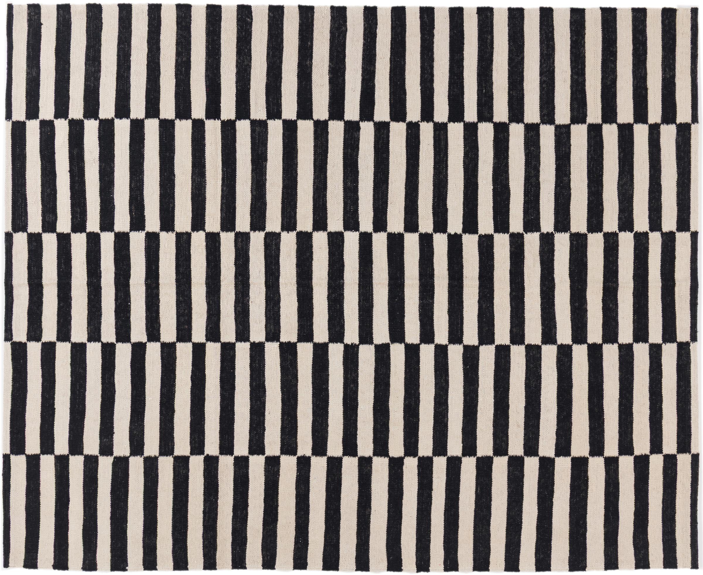 This rug was made as a flat weave by hand on a loom. Flatweave is the term used to describe rugs that have no pile. As the name promises, these rugs are woven and not knotted. This results in a flat rug with a structured surface. Flatweaves are not as soft and usually thinner than knotted rugs. At the same time they are much less complex to manufacture and can usually be laid out from both sides (front and back). Their patterns are usually geometric, which is determined by the fabric.