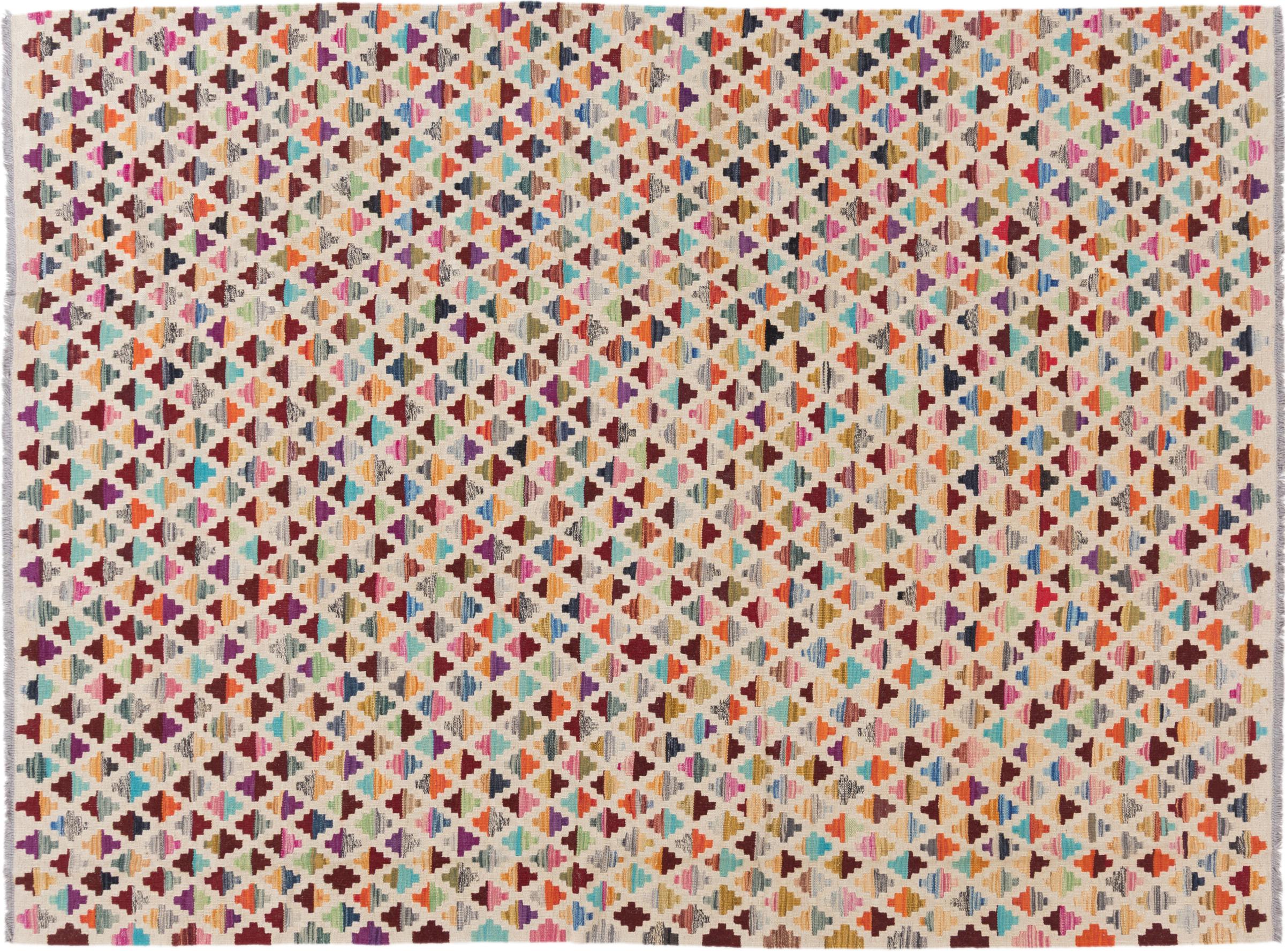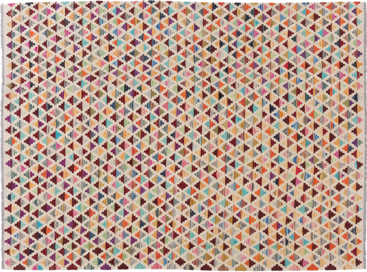 Carpet ID: 2945290053661 Size: 242x181 cm Thickness: ap. 3 mm Manufacturing: Woven by hand Pile: Handspun wool Warp: Sheep wool Origin: Afghanistan Age: New Weight: ap. 7 kg Also know as Kilim, Qilim, Chilim, Afgan, Afghán In stock: Unique - Only 1 in stock