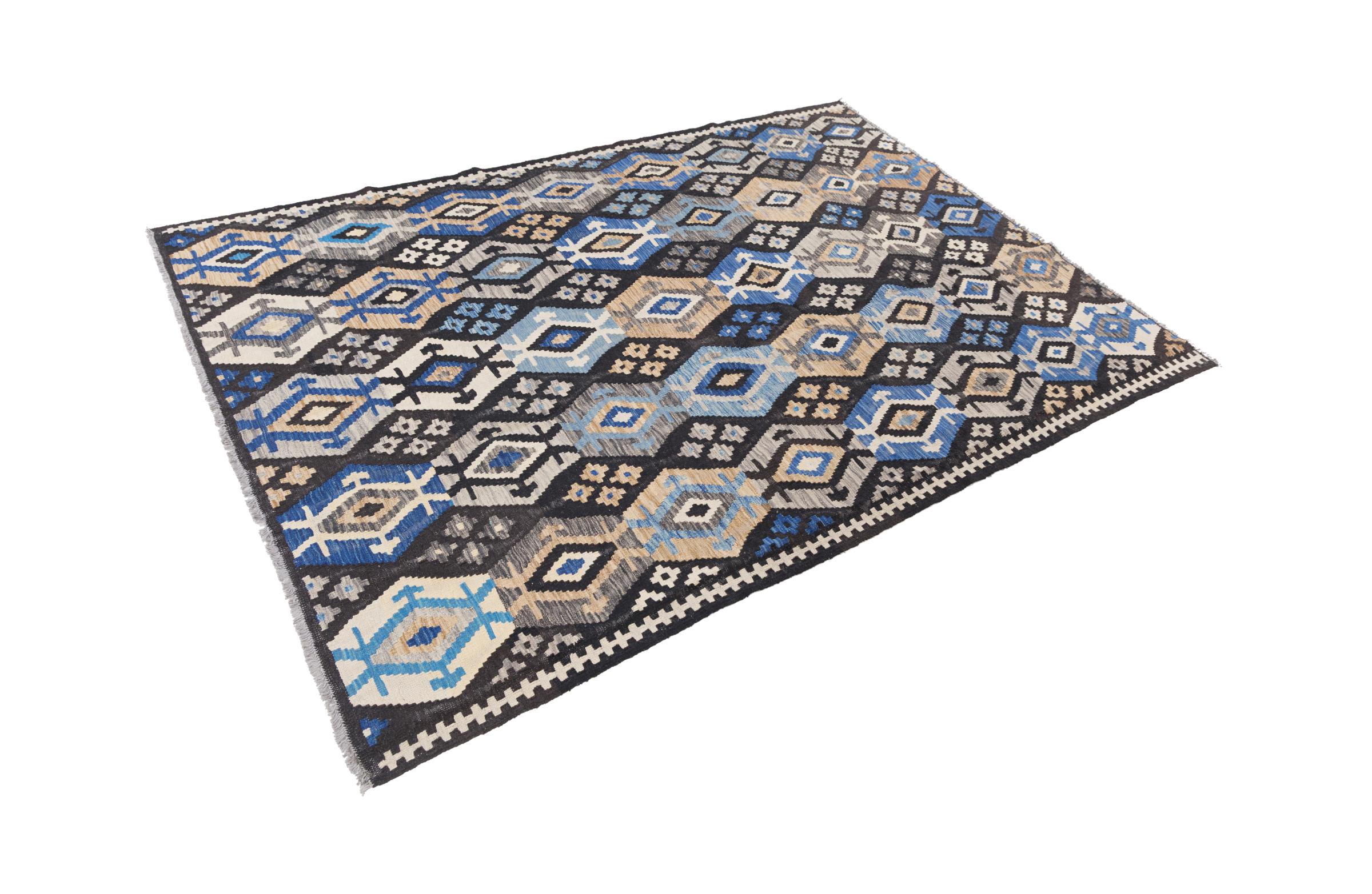 Carpet ID: 2948800051323 Size: 246x172 cm Thickness: ap. 3 mm Manufacturing: Woven by hand Pile: Handspun wool Warp: Sheep wool Origin: Afghanistan Age: New Weight: ap. 6 kg Also know as Kilim, Qilim, Chilim, Afgan, Afghán In stock: Unique - Only 1 in stock