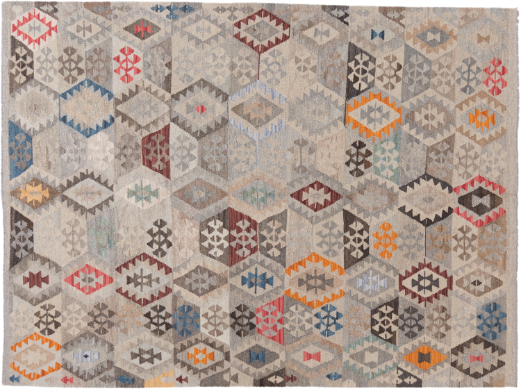 This rug was made as a flat weave by hand on a loom. Flatweave is the term used to describe rugs that have no pile. As the name promises, these rugs are woven and not knotted. This results in a flat rug with a structured surface. Flatweaves are not as soft and usually thinner than knotted rugs. At the same time they are much less complex to manufacture and can usually be laid out from both sides (front and back). Their patterns are usually geometric, which is determined by the fabric.