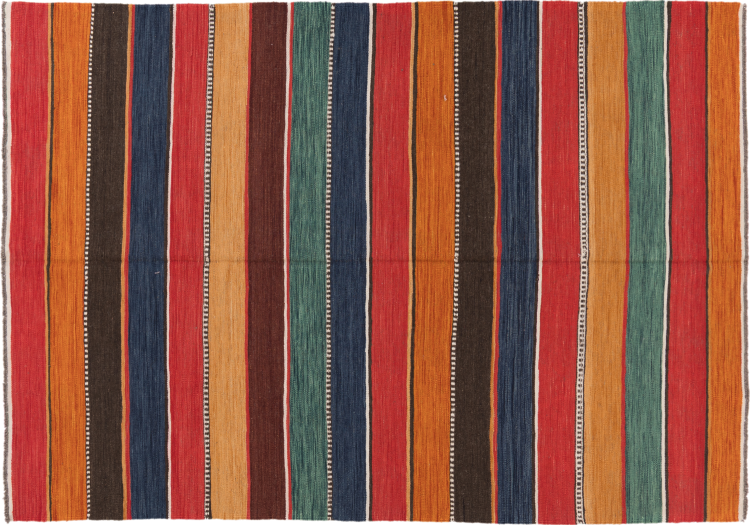 This rug was made as a flat weave by hand on a loom. Flatweave is the term used to describe rugs that have no pile. As the name promises, these rugs are woven and not knotted. This results in a flat rug with a structured surface. Flatweaves are not as soft and usually thinner than knotted rugs. At the same time they are much less complex to manufacture and can usually be laid out from both sides (front and back). Their patterns are usually geometric, which is determined by the fabric.