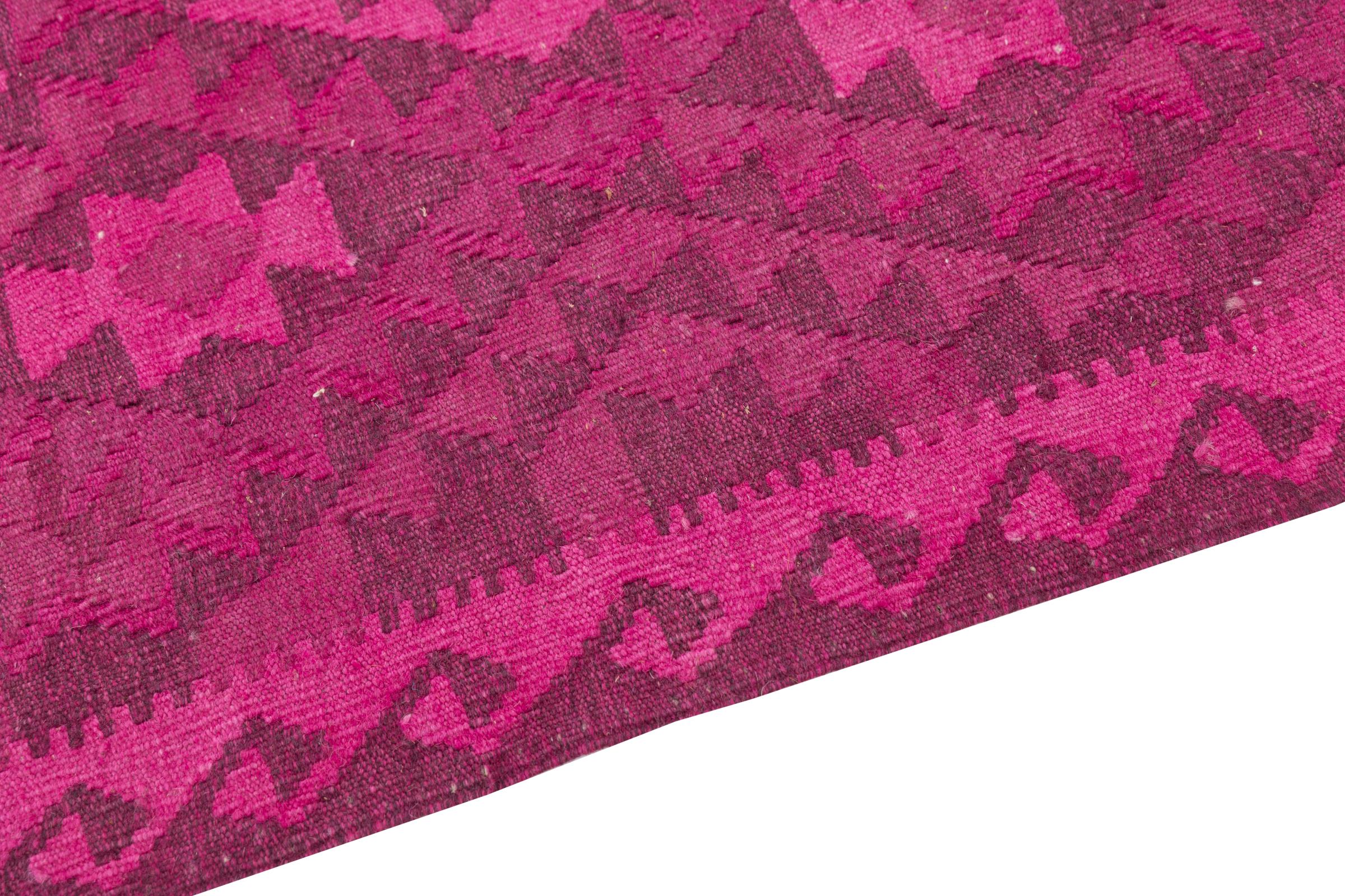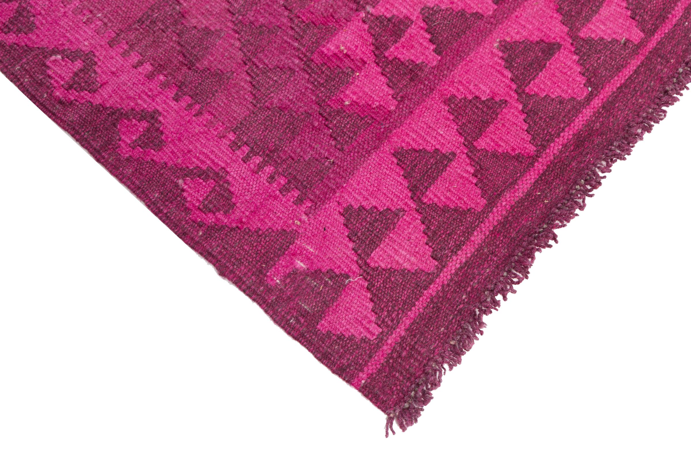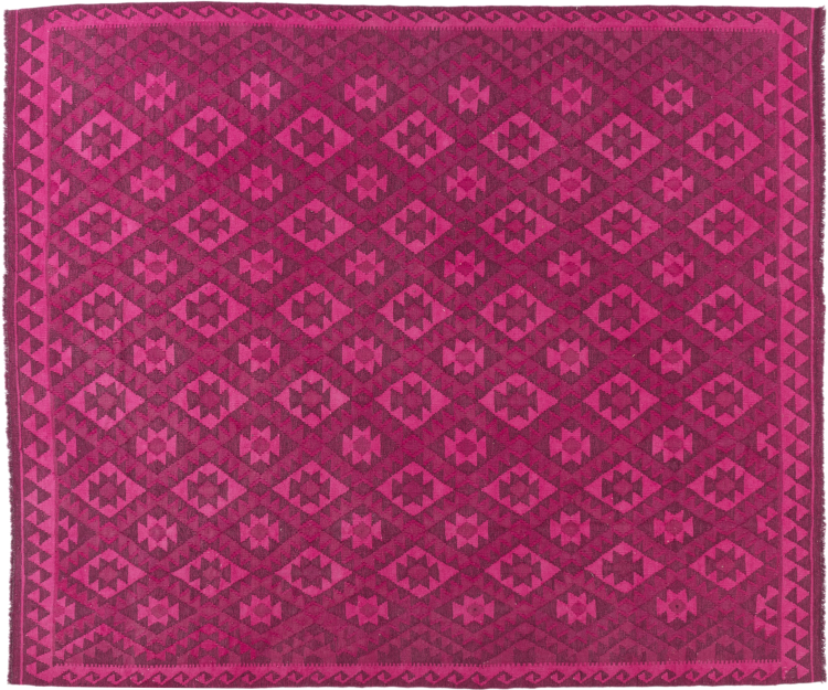 This rug was made as a flat weave by hand on a loom. Flatweave is the term used to describe rugs that have no pile. As the name promises, these rugs are woven and not knotted. This results in a flat rug with a structured surface. Flatweaves are not as soft and usually thinner than knotted rugs. At the same time they are much less complex to manufacture and can usually be laid out from both sides (front and back). Their patterns are usually geometric, which is determined by the fabric.