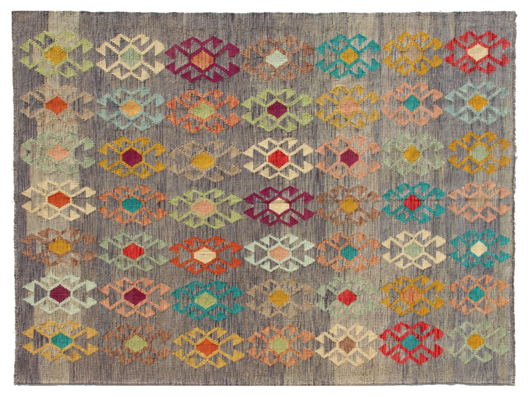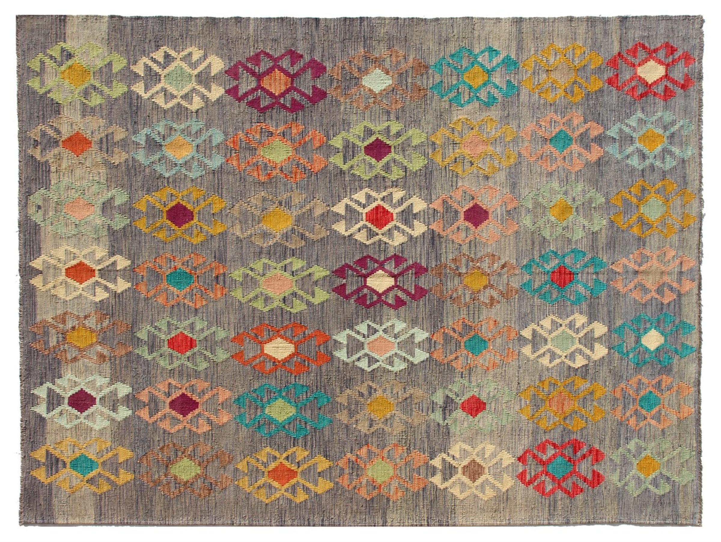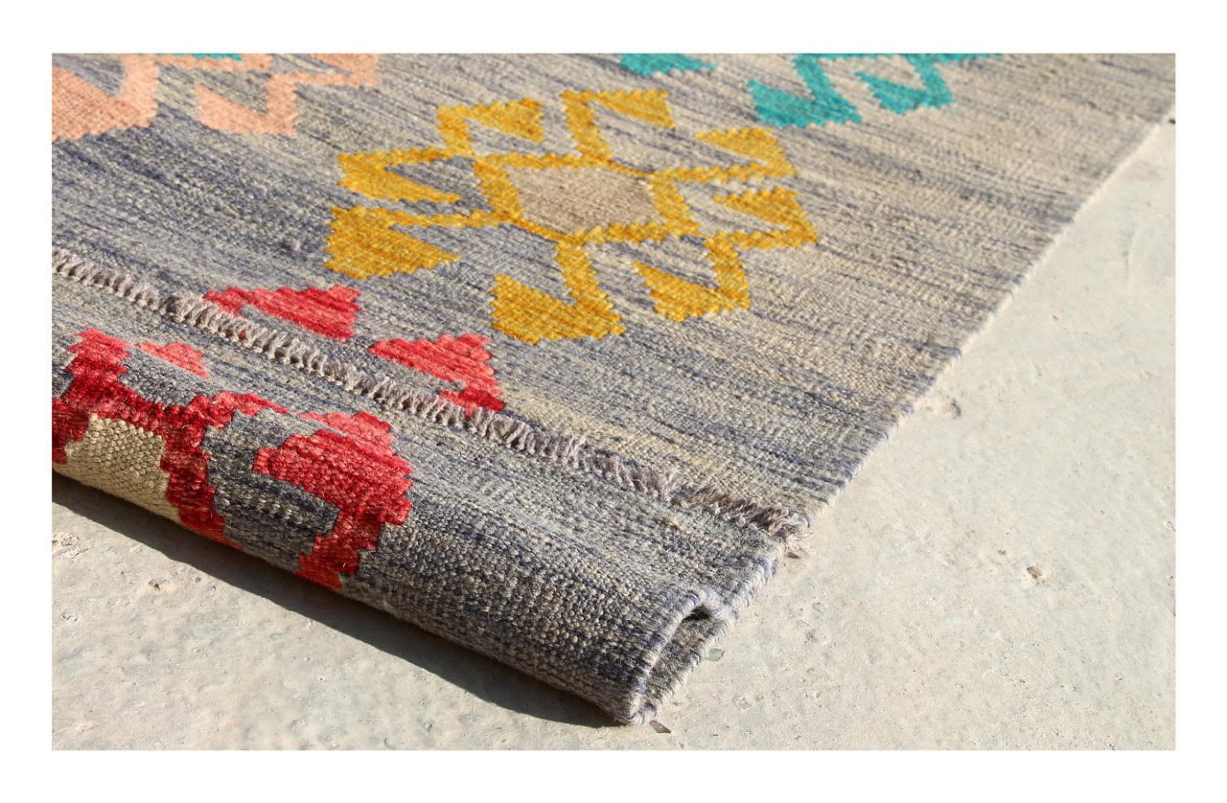 This handwoven Kilim Afghan is a wonderful and unique piece of art. Hard to believe that these modern colours and patterns have already been used centuries ago. This carpet has been woven by hand in old tradition in Afghanistan. It delivers a portion of contemporary history, which you won't find in this specific design a second time. It consists of high-grade natural wool and gives your home a personalised touch.