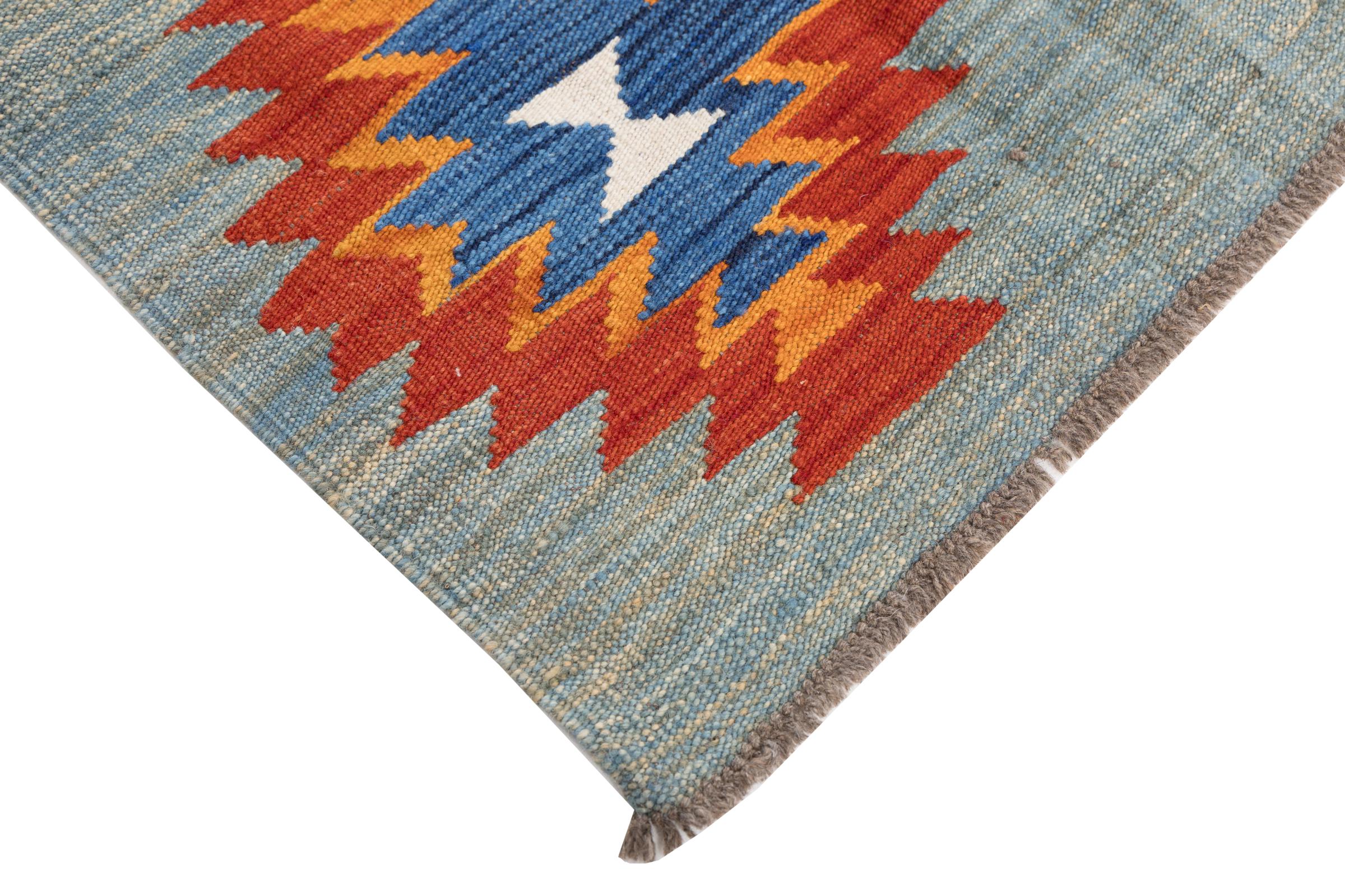 This rug was made as a flat weave by hand on a loom. Flatweave is the term used to describe rugs that have no pile. As the name promises, these rugs are woven and not knotted. This results in a flat rug with a structured surface. Flatweaves are not as soft and usually thinner than knotted rugs. At the same time they are much less complex to manufacture and can usually be laid out from both sides (front and back). Their patterns are usually geometric, which is determined by the fabric.