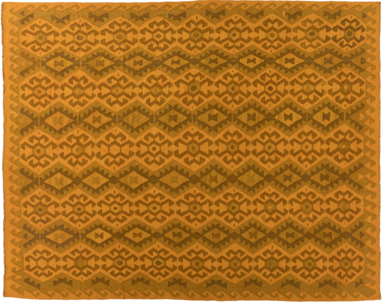 This rug was made as a flat weave by hand on a loom. Flatweave is the term used to describe rugs that have no pile. As the name promises, these rugs are woven and not knotted. This results in a flat rug with a structured surface. Flatweaves are not as soft and usually thinner than knotted rugs. At the same time they are much less complex to manufacture and can usually be laid out from both sides (front and back). Their patterns are usually geometric, which is determined by the fabric.