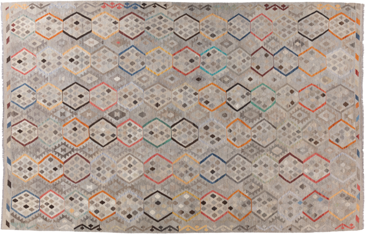 This rug was made as a flat weave by hand on a loom. Flatweave is the term used to describe rugs that have no pile. As the name promises, these rugs are woven and not knotted. This results in a flat rug with a structured surface. Flatweaves are not as soft and usually thinner than knotted rugs. At the same time they are much less complex to manufacture and can usually be laid out from both sides (front and back). Their patterns are usually geometric, which is determined by the fabric.