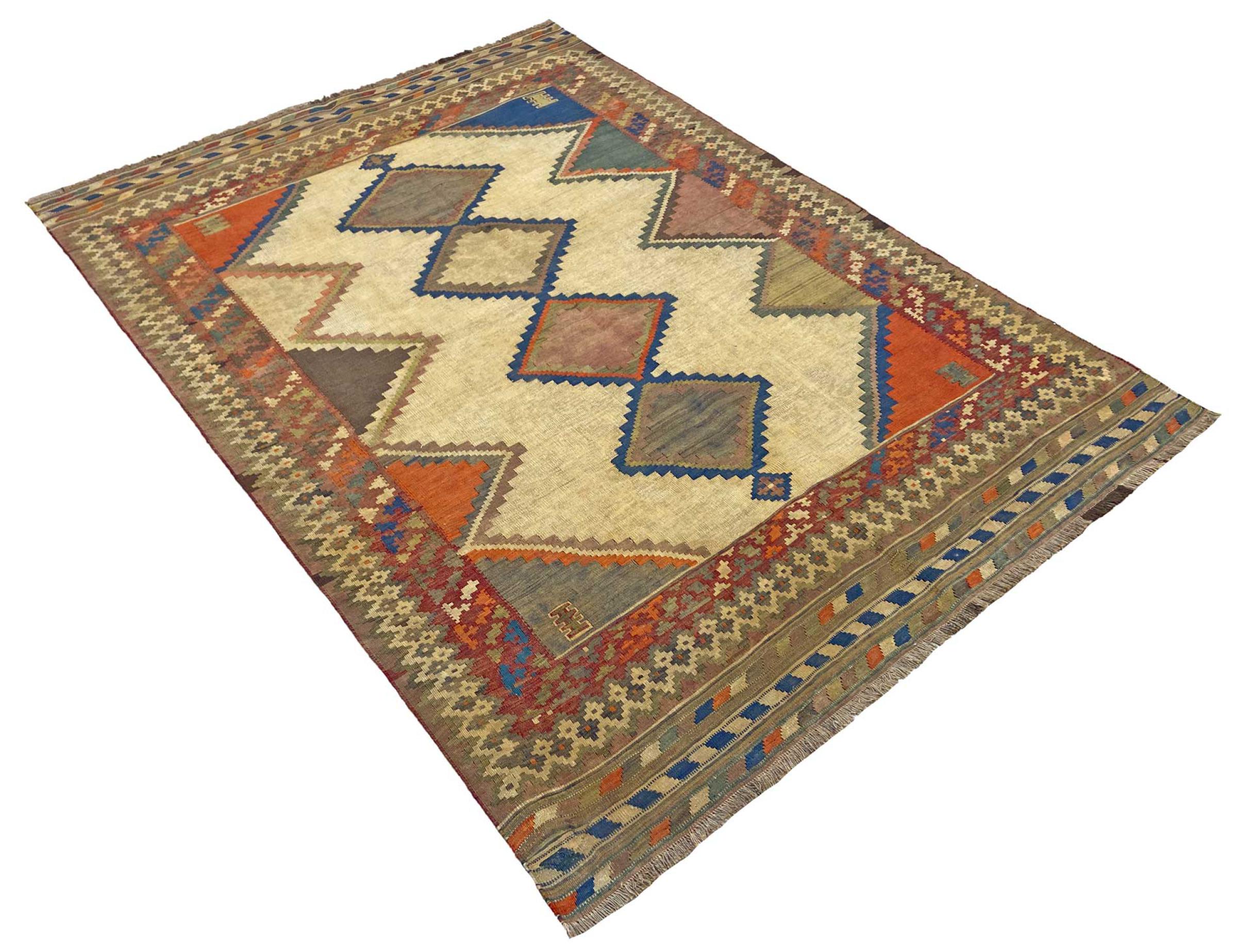 This handwoven Kilim Fars combines Persian patterns with the old tradition of flat fabrics. It represents a beautiful composition of contemporary Persian elements and a modern style. Due to the carpet's geometric patterns and its warm colours, this type of rug is extremely popular in modern interior magazines. Additionally, this Kilim can be used in many different ways. Whether you would like to use it as a bed cover or as a carpet in front of your sofa – a Kilim Fars fulfils nearly all wishes.
