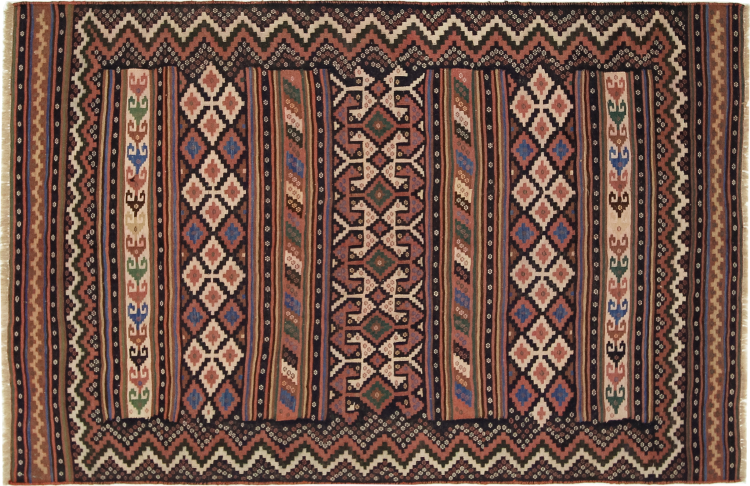 This rug was made as a flat weave by hand on a loom. Flatweave is the term used to describe rugs that have no pile. As the name promises, these rugs are woven and not knotted. This results in a flat rug with a structured surface. Flatweaves are not as soft and usually thinner than knotted rugs. At the same time they are much less complex to manufacture and can usually be laid out from both sides (front and back). Their patterns are usually geometric, which is determined by the fabric.