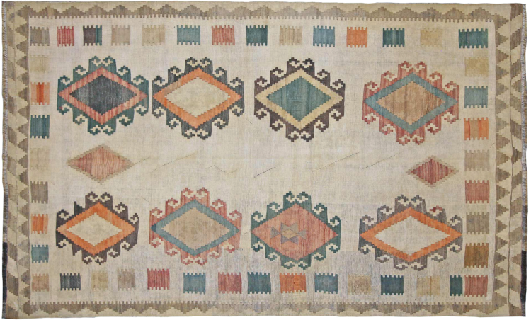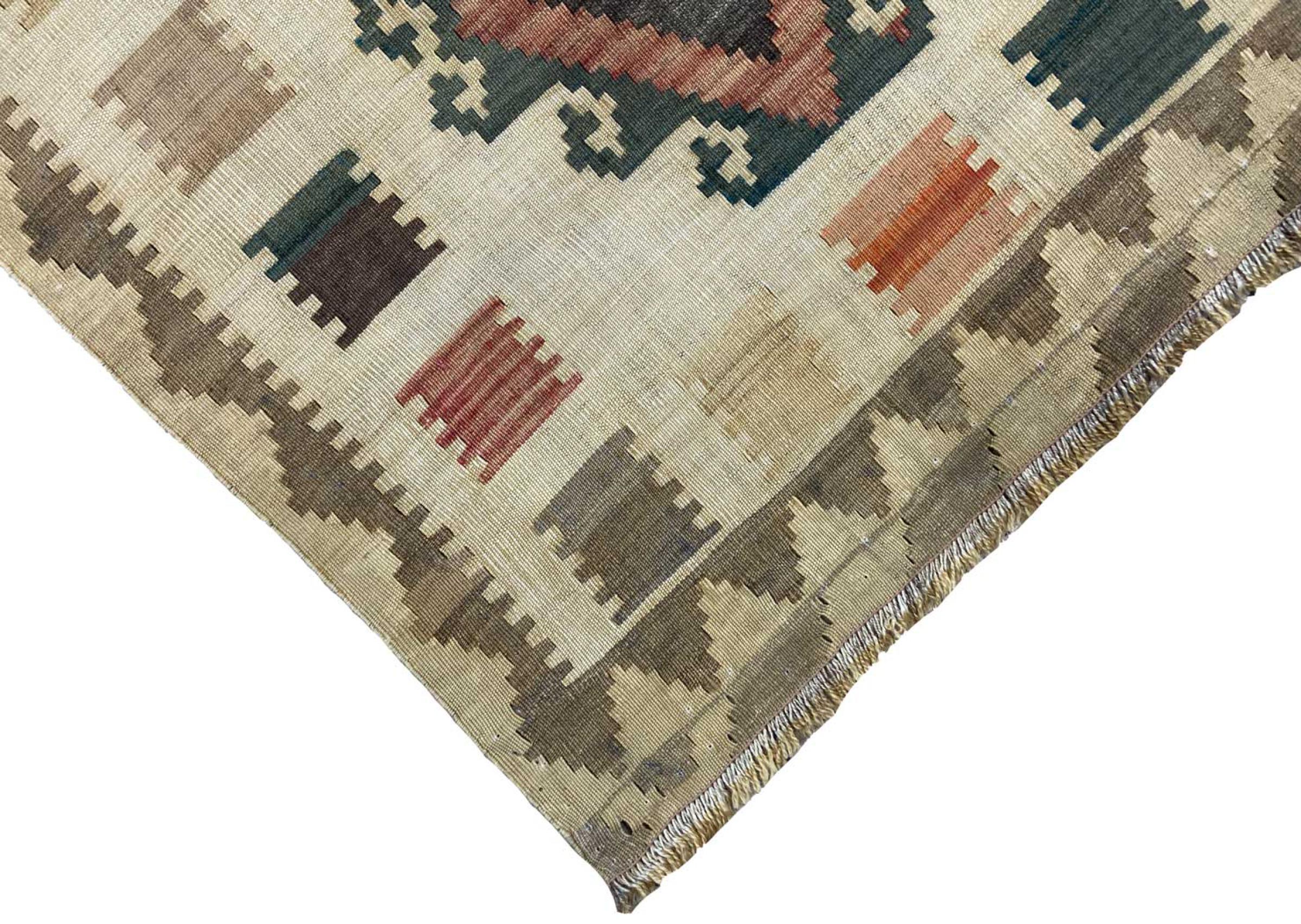 This rug was made as a flat weave by hand on a loom. Flatweave is the term used to describe rugs that have no pile. As the name promises, these rugs are woven and not knotted. This results in a flat rug with a structured surface. Flatweaves are not as soft and usually thinner than knotted rugs. At the same time they are much less complex to manufacture and can usually be laid out from both sides (front and back). Their patterns are usually geometric, which is determined by the fabric.