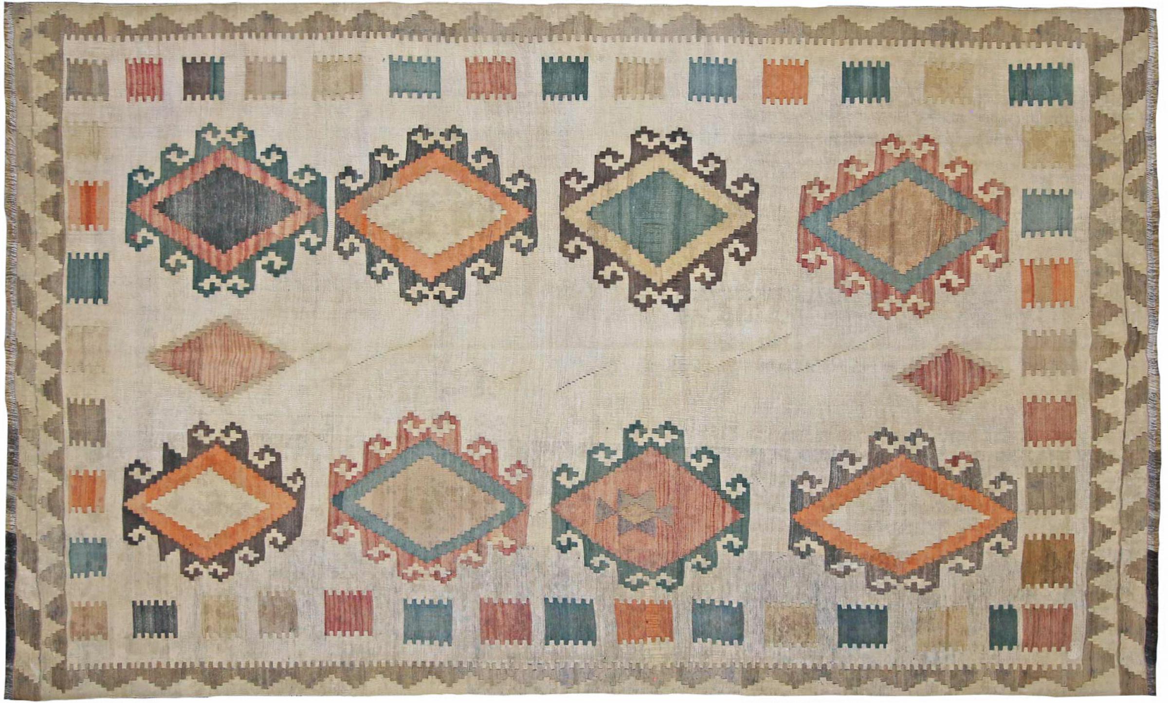 This handwoven Kilim Fars combines Persian patterns with the old tradition of flat fabrics. It represents a beautiful composition of contemporary Persian elements and a modern style. Due to the carpet's geometric patterns and its warm colours, this type of rug is extremely popular in modern interior magazines. Additionally, this Kilim can be used in many different ways. Whether you would like to use it as a bed cover or as a carpet in front of your sofa – a Kilim Fars fulfils nearly all wishes.