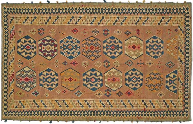 This rug was made as a flat weave by hand on a loom. Flatweave is the term used to describe rugs that have no pile. As the name promises, these rugs are woven and not knotted. This results in a flat rug with a structured surface. Flatweaves are not as soft and usually thinner than knotted rugs. At the same time they are much less complex to manufacture and can usually be laid out from both sides (front and back). Their patterns are usually geometric, which is determined by the fabric.