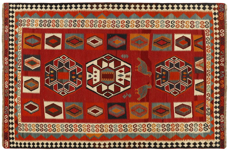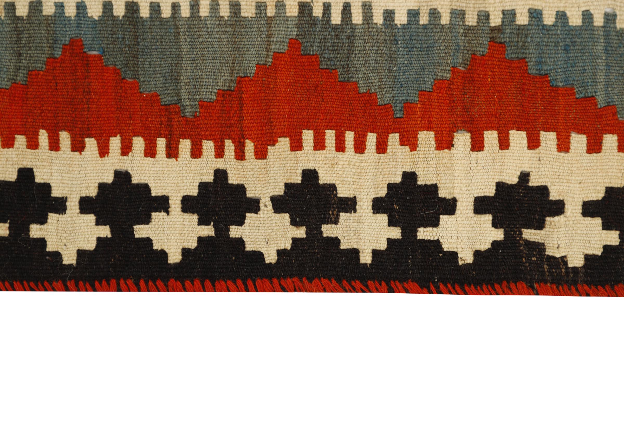 This rug was made as a flat weave by hand on a loom. Flatweave is the term used to describe rugs that have no pile. As the name promises, these rugs are woven and not knotted. This results in a flat rug with a structured surface. Flatweaves are not as soft and usually thinner than knotted rugs. At the same time they are much less complex to manufacture and can usually be laid out from both sides (front and back). Their patterns are usually geometric, which is determined by the fabric.