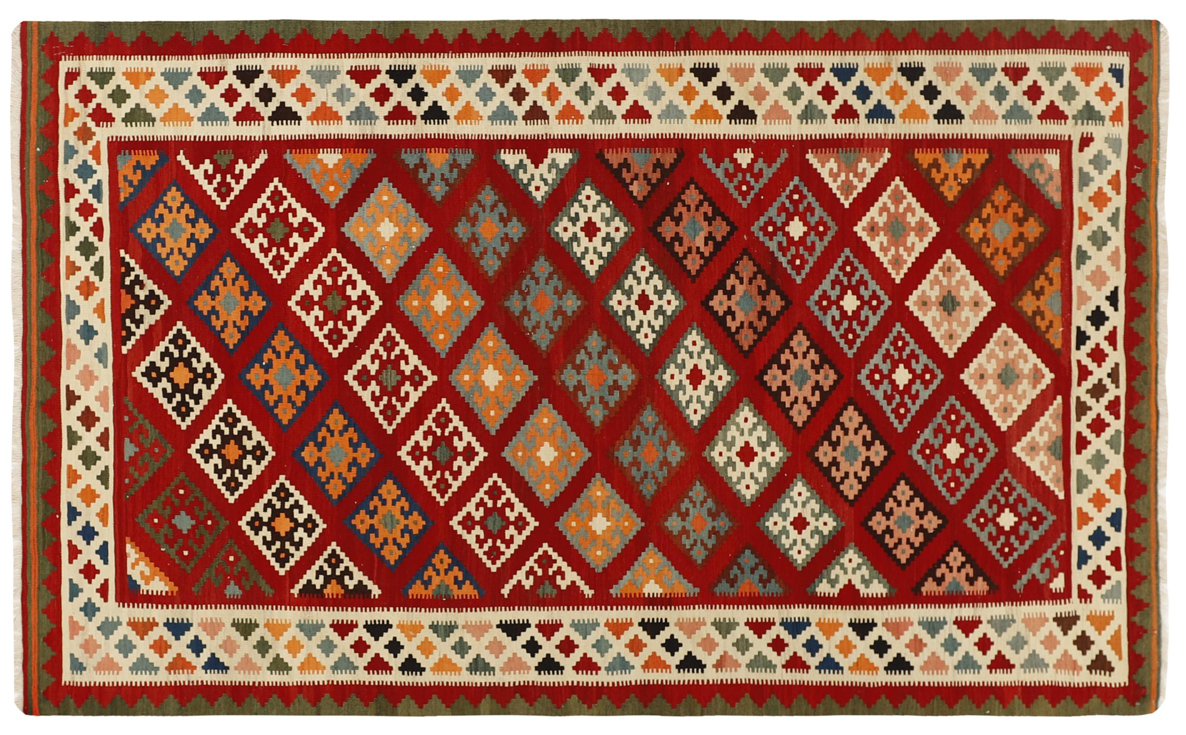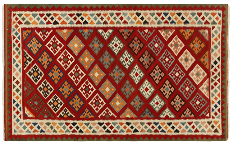 This rug was made as a flat weave by hand on a loom. Flatweave is the term used to describe rugs that have no pile. As the name promises, these rugs are woven and not knotted. This results in a flat rug with a structured surface. Flatweaves are not as soft and usually thinner than knotted rugs. At the same time they are much less complex to manufacture and can usually be laid out from both sides (front and back). Their patterns are usually geometric, which is determined by the fabric.