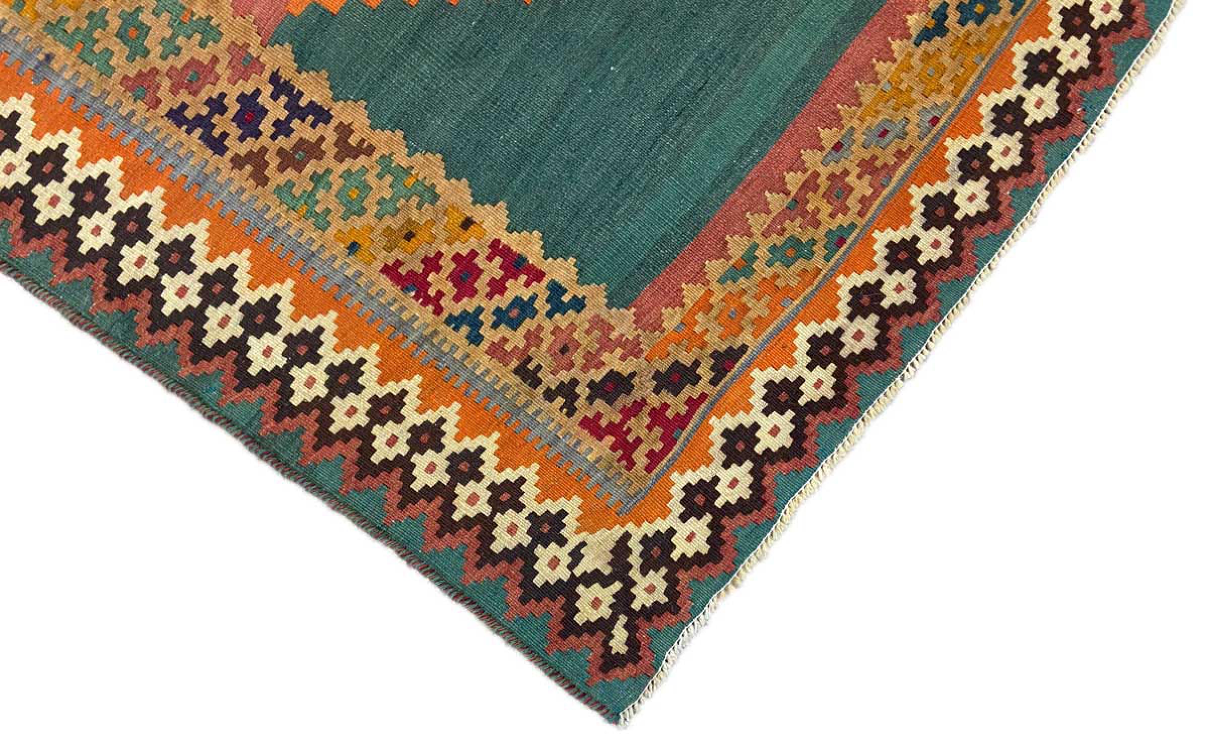This handwoven Kilim Fars combines Persian patterns with the old tradition of flat fabrics. It represents a beautiful composition of contemporary Persian elements and a modern style. Due to the carpet's geometric patterns and its warm colours, this type of rug is extremely popular in modern interior magazines. Additionally, this Kilim can be used in many different ways. Whether you would like to use it as a bed cover or as a carpet in front of your sofa – a Kilim Fars fulfils nearly all wishes.