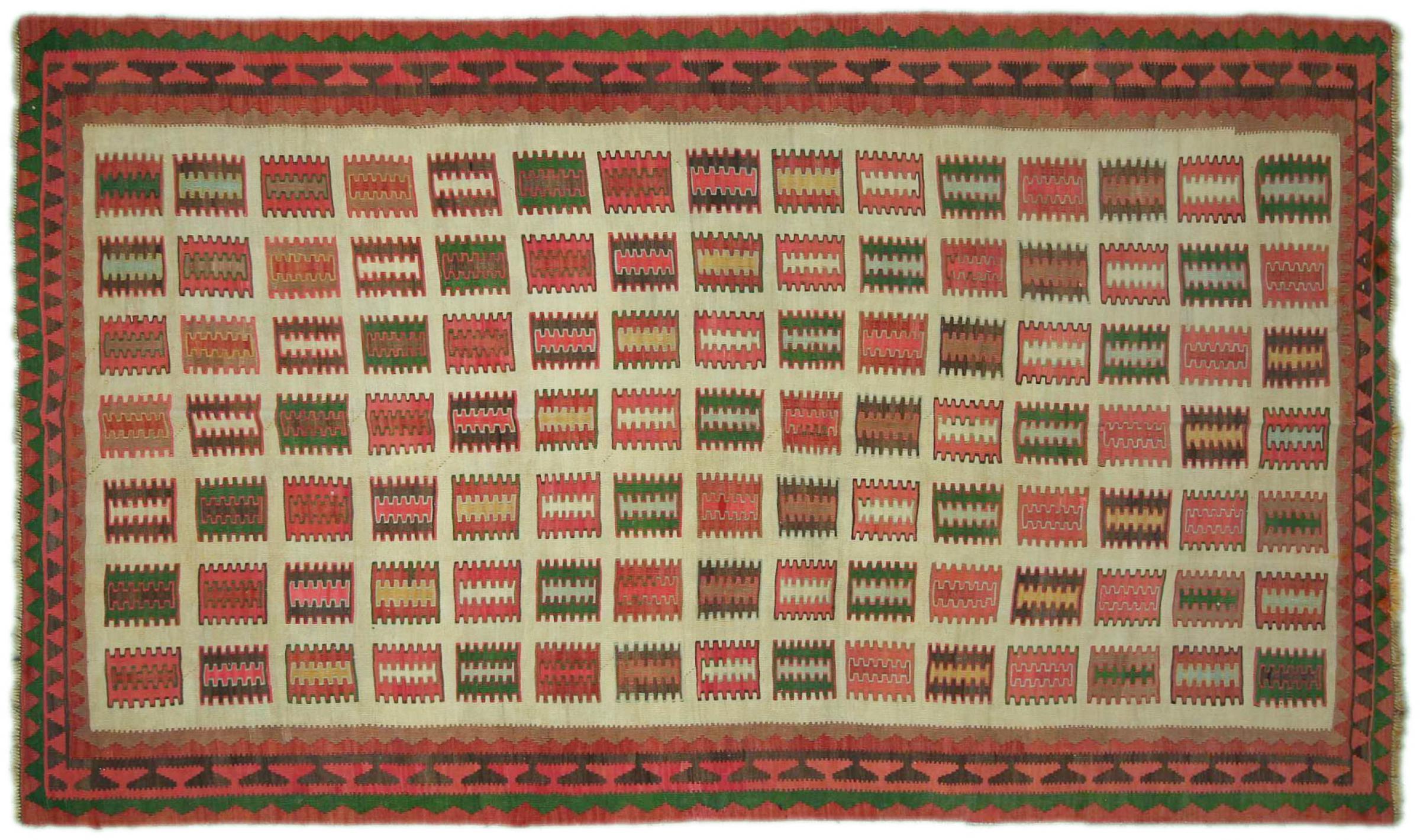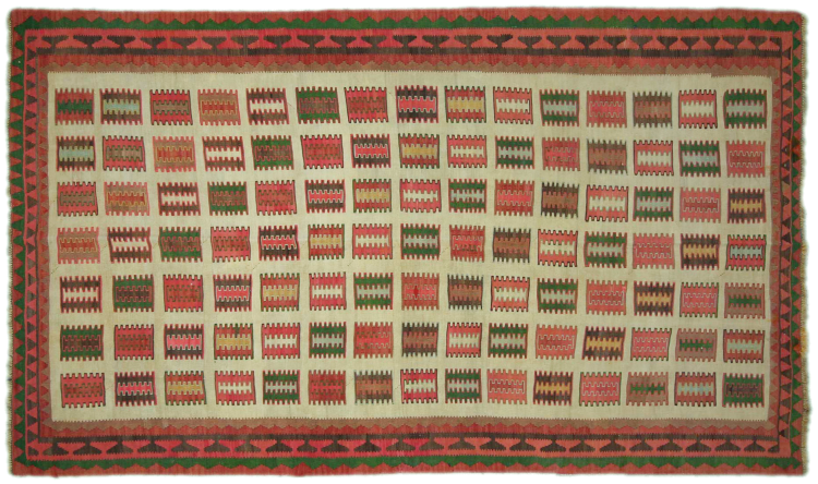 This rug was made as a flat weave by hand on a loom. Flatweave is the term used to describe rugs that have no pile. As the name promises, these rugs are woven and not knotted. This results in a flat rug with a structured surface. Flatweaves are not as soft and usually thinner than knotted rugs. At the same time they are much less complex to manufacture and can usually be laid out from both sides (front and back). Their patterns are usually geometric, which is determined by the fabric.