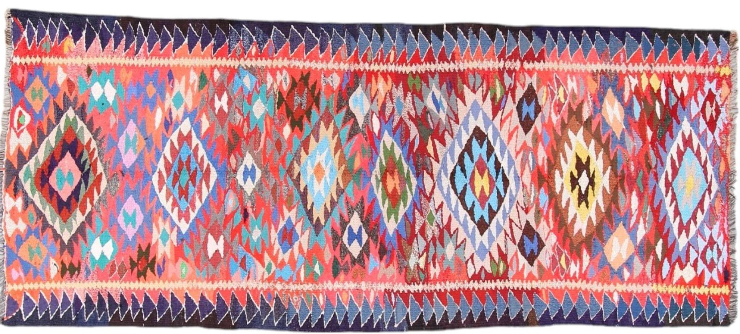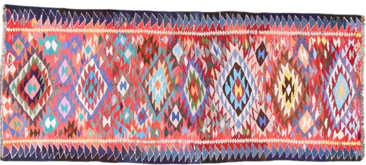 This rug was made as a flat weave by hand on a loom. Flatweave is the term used to describe rugs that have no pile. As the name promises, these rugs are woven and not knotted. This results in a flat rug with a structured surface. Flatweaves are not as soft and usually thinner than knotted rugs. At the same time they are much less complex to manufacture and can usually be laid out from both sides (front and back). Their patterns are usually geometric, which is determined by the fabric.
