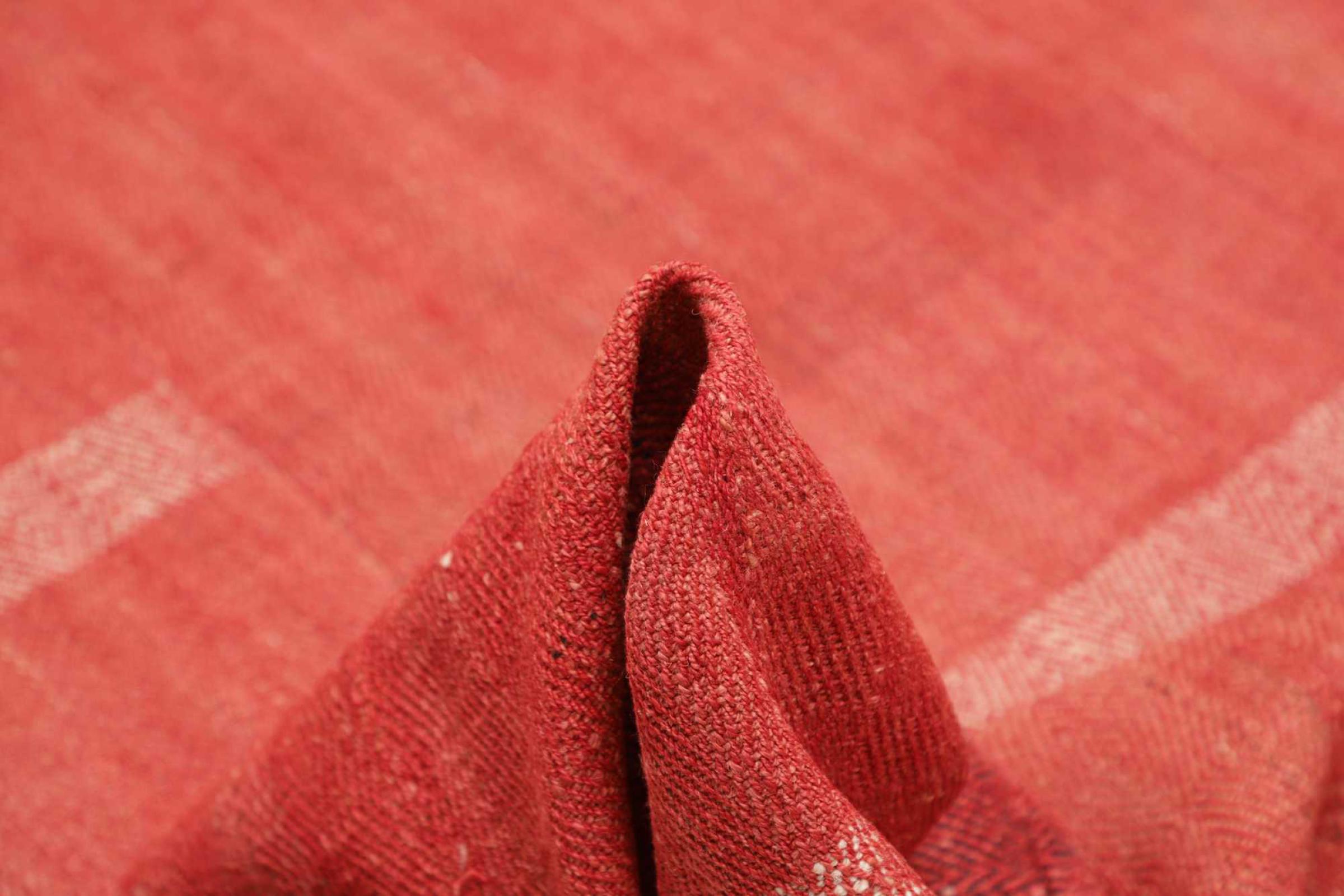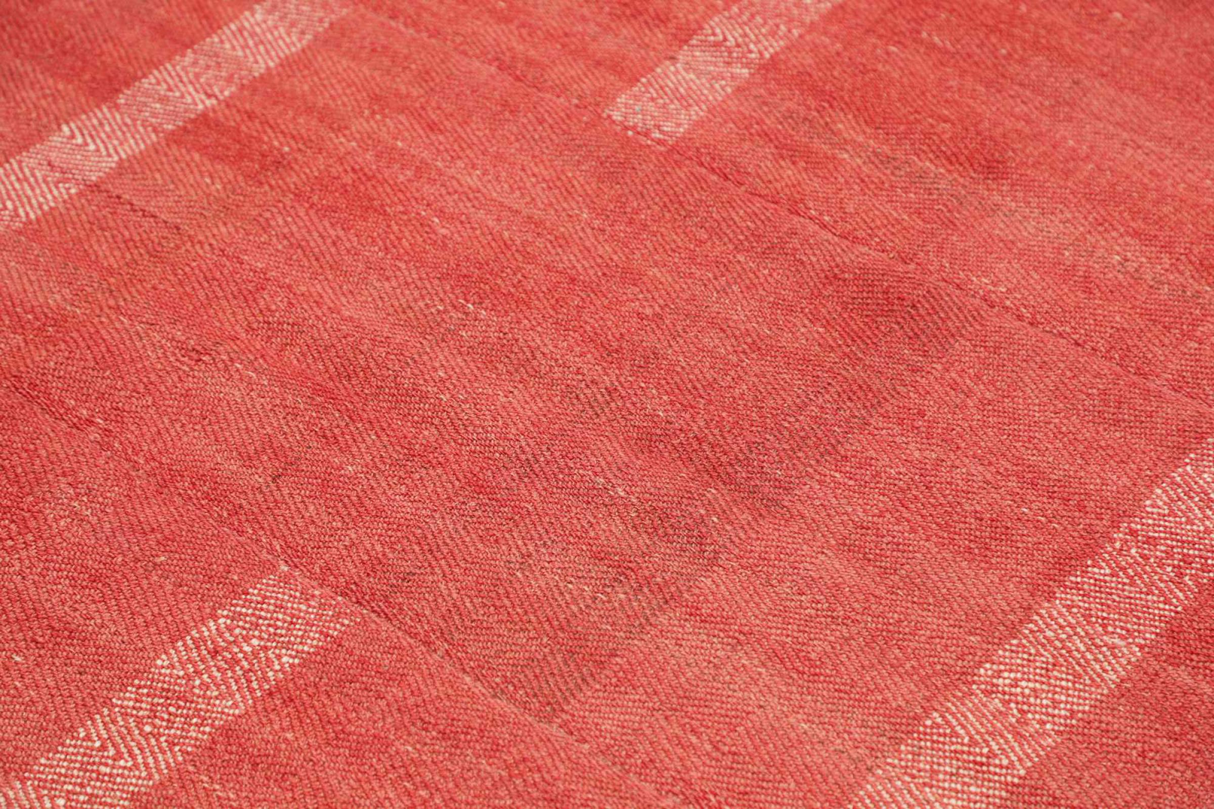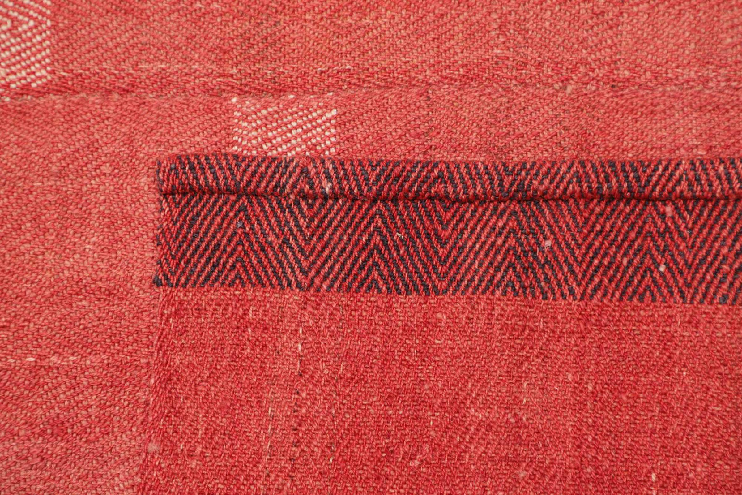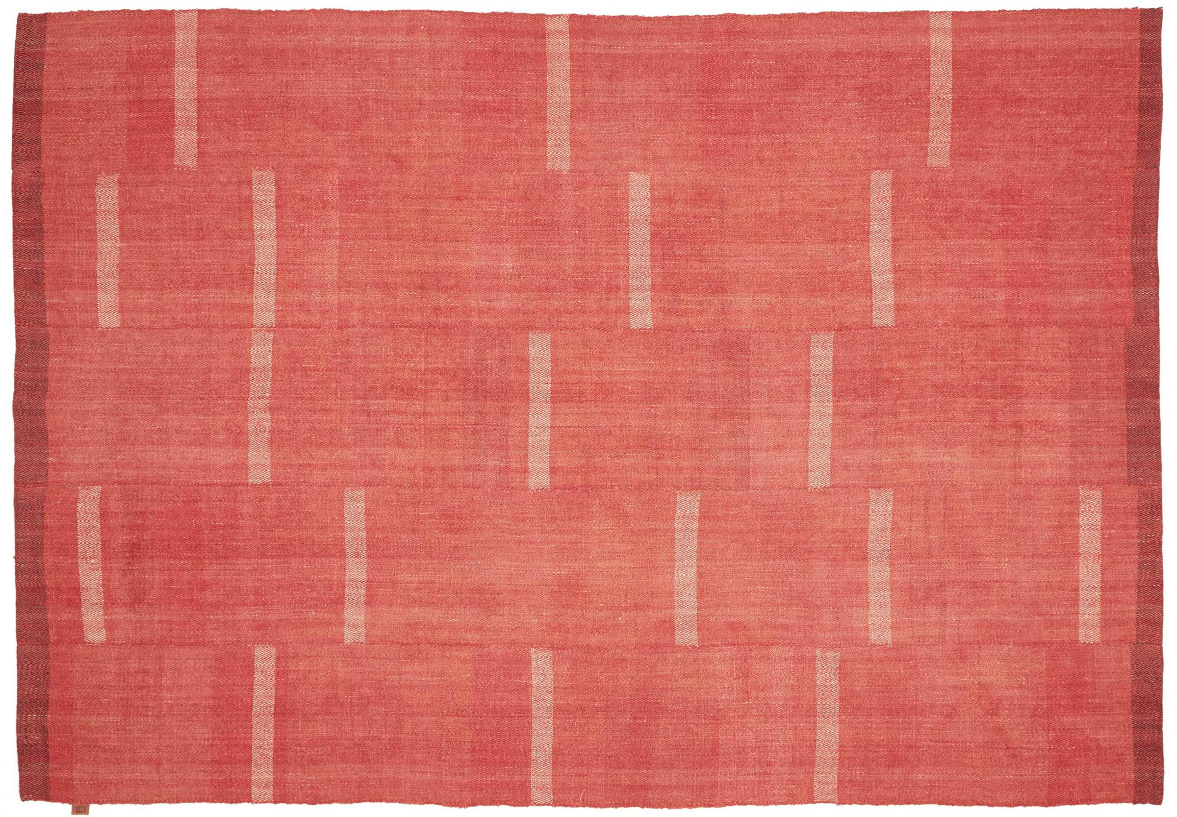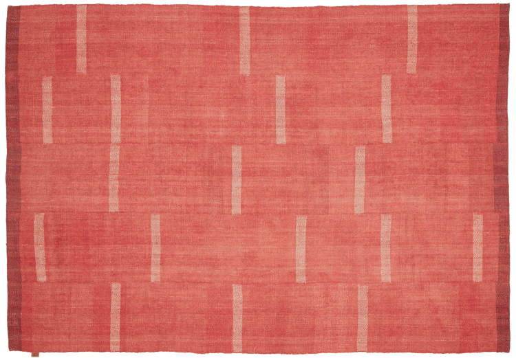 This rug was made as a flat weave by hand on a loom. Flatweave is the term used to describe rugs that have no pile. As the name promises, these rugs are woven and not knotted. This results in a flat rug with a structured surface. Flatweaves are not as soft and usually thinner than knotted rugs. At the same time they are much less complex to manufacture and can usually be laid out from both sides (front and back). Their patterns are usually geometric, which is determined by the fabric.