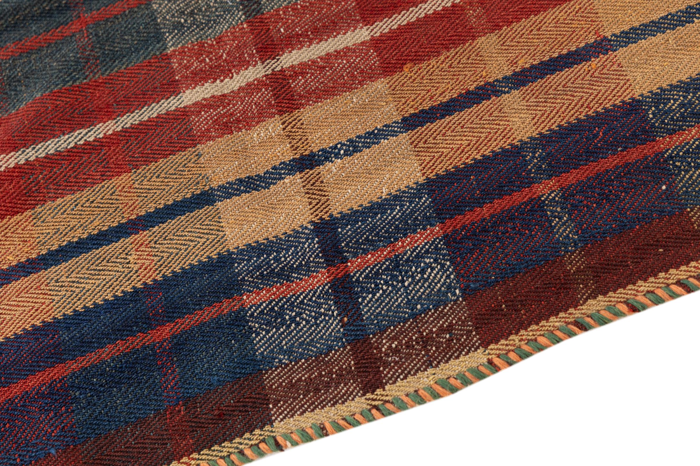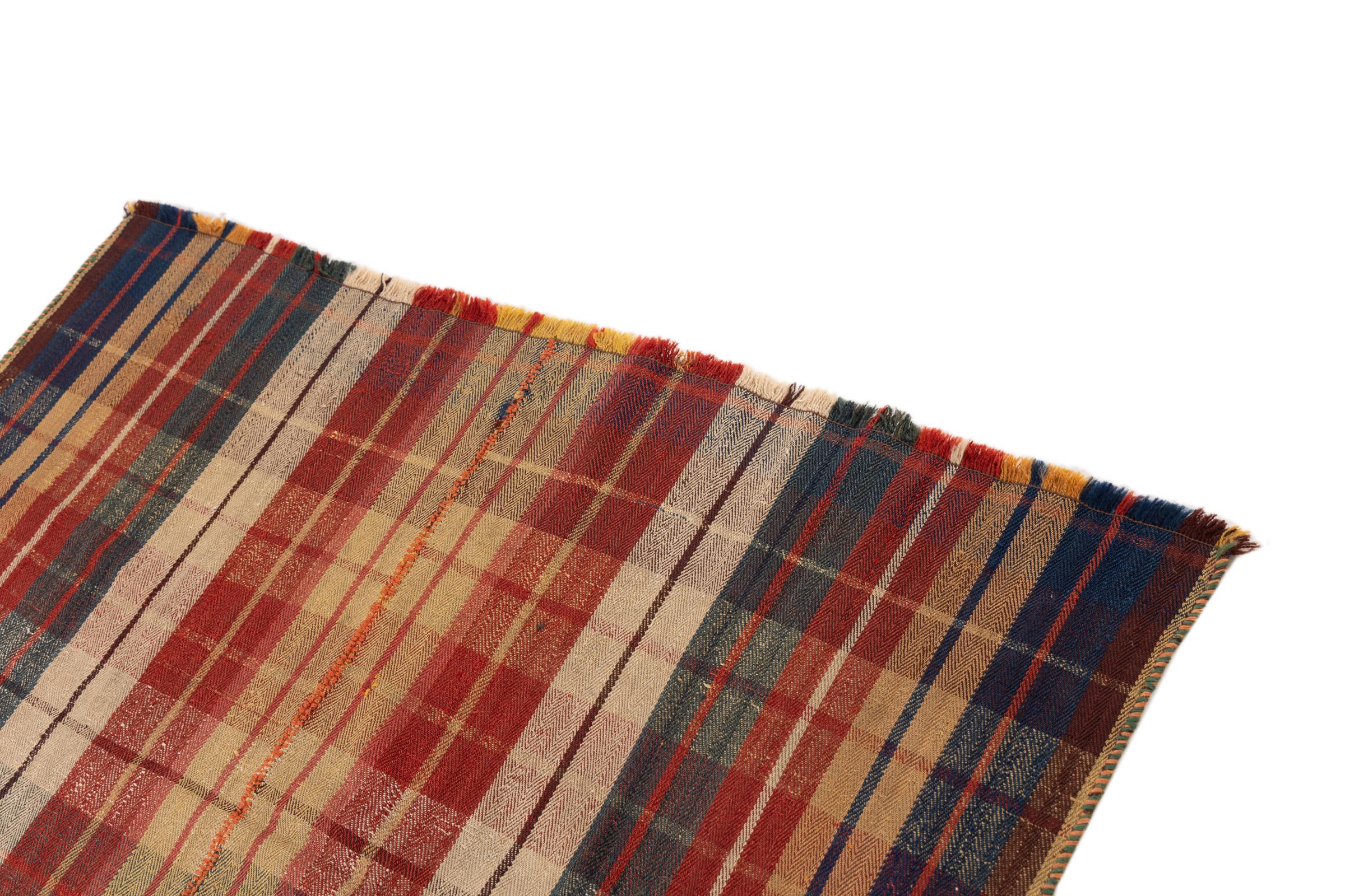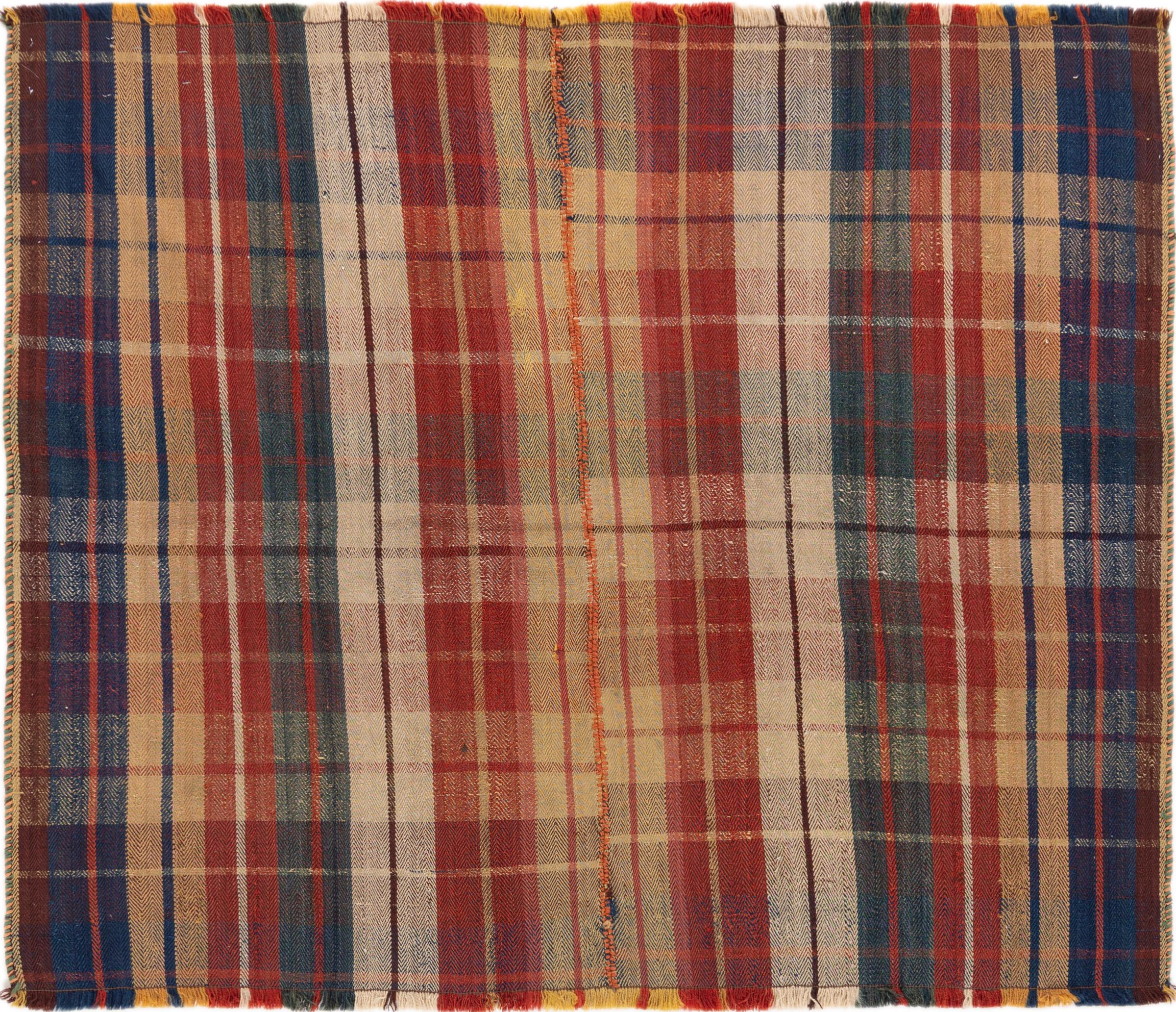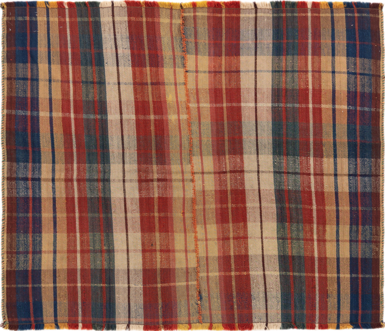 This rug was made as a flat weave by hand on a loom. Flatweave is the term used to describe rugs that have no pile. As the name promises, these rugs are woven and not knotted. This results in a flat rug with a structured surface. Flatweaves are not as soft and usually thinner than knotted rugs. At the same time they are much less complex to manufacture and can usually be laid out from both sides (front and back). Their patterns are usually geometric, which is determined by the fabric.