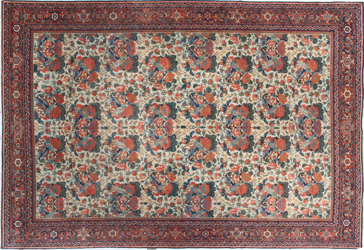 Carpet ID: 310011004991402 Size: 336x236 cm Thickness: ap. 12 mm Knot density: 160 000 - 200 000 / m² Manufacturing: Knotted by hand Pile: Handspun wool Warp: Cotton Condition / Conservation Perfect Origin: Persia Age: Antique, over 80 years Weight: ap. 28 kg Also know as Mahalat In stock: Unique - Only 1 in stock