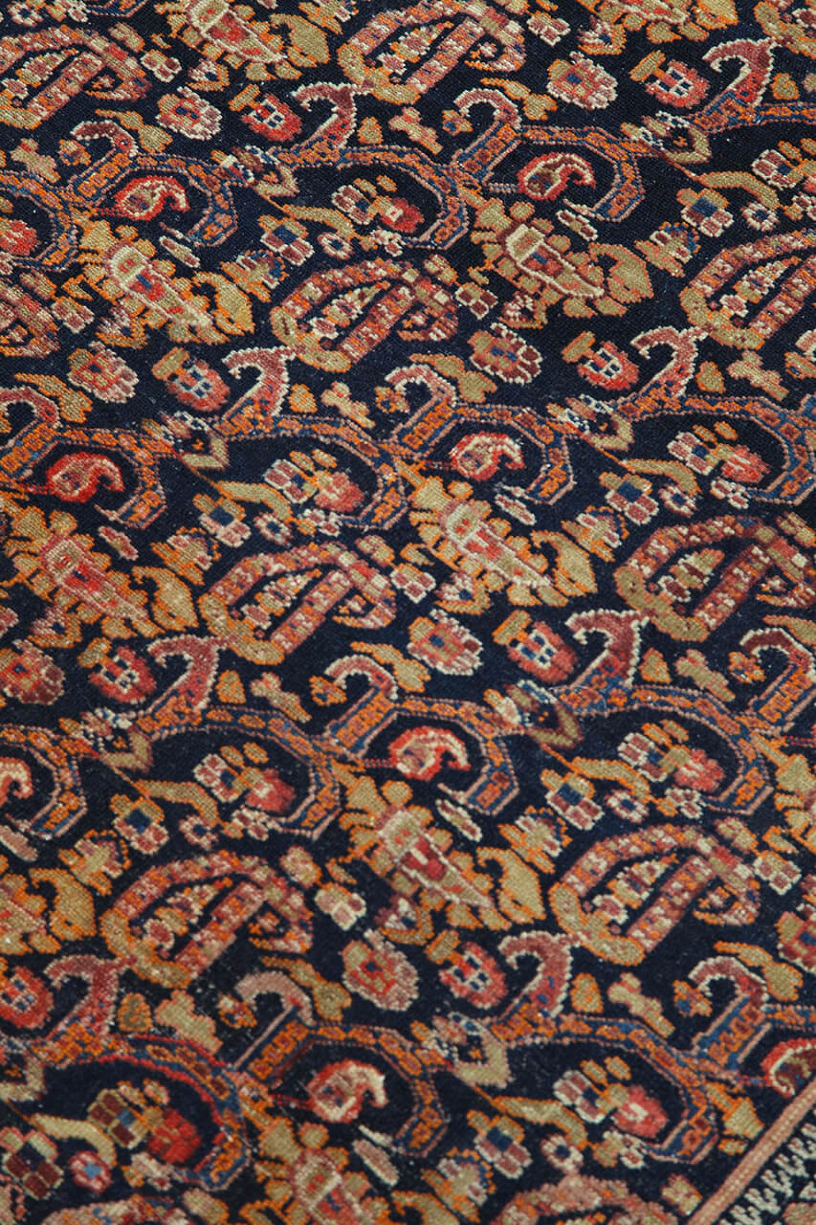 Carpet ID: 31006400464562 Size: 176x119 cm Thickness: ap. 12 mm Knot density: 200 000 - 250 000 / m² Manufacturing: Knotted by hand Pile: Handspun wool Warp: Sheep wool Condition / Conservation Perfect Origin: Persia Age: Antique, over 80 years Weight: ap. 7 kg Also know as Huseinabad In stock: Unique - Only 1 in stock