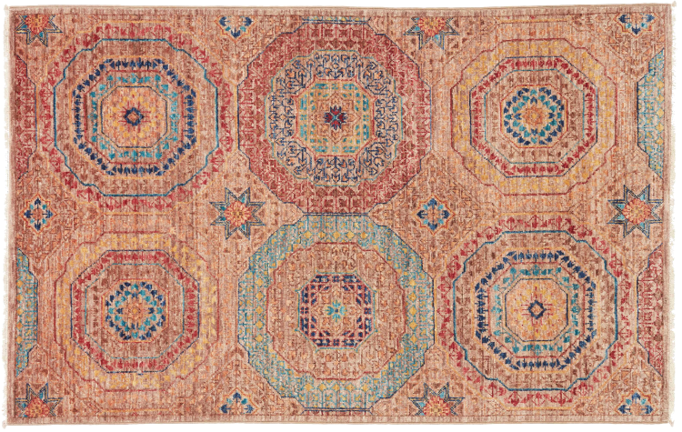 A large part of Pakistani rug production takes place in and around the cities of Lahore and Karachi. Many of the rug knotters of that time fled to Pakistan during the war with India and settled there. Today, especially hand-knotted Pakistan Bukhara rugs are well-known. Similar to the Afghan oriental rugs, Pakistani rugs are also made in dark colours and mostly have shades of red. Even the well-known elephant foot pattern (repeating octagonal pattern) can be found on a Pakistani.