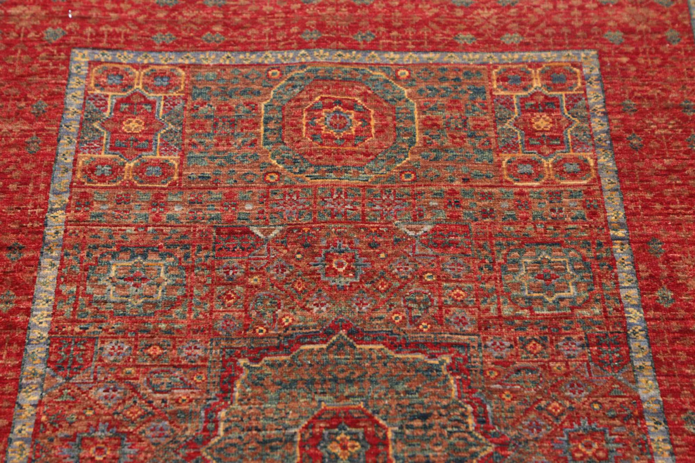 A large part of Pakistani rug production takes place in and around the cities of Lahore and Karachi. Many of the rug knotters of that time fled to Pakistan during the war with India and settled there. Today, especially hand-knotted Pakistan Bukhara rugs are well-known. Similar to the Afghan oriental rugs, Pakistani rugs are also made in dark colours and mostly have shades of red. Even the well-known elephant foot pattern (repeating octagonal pattern) can be found on a Pakistani.