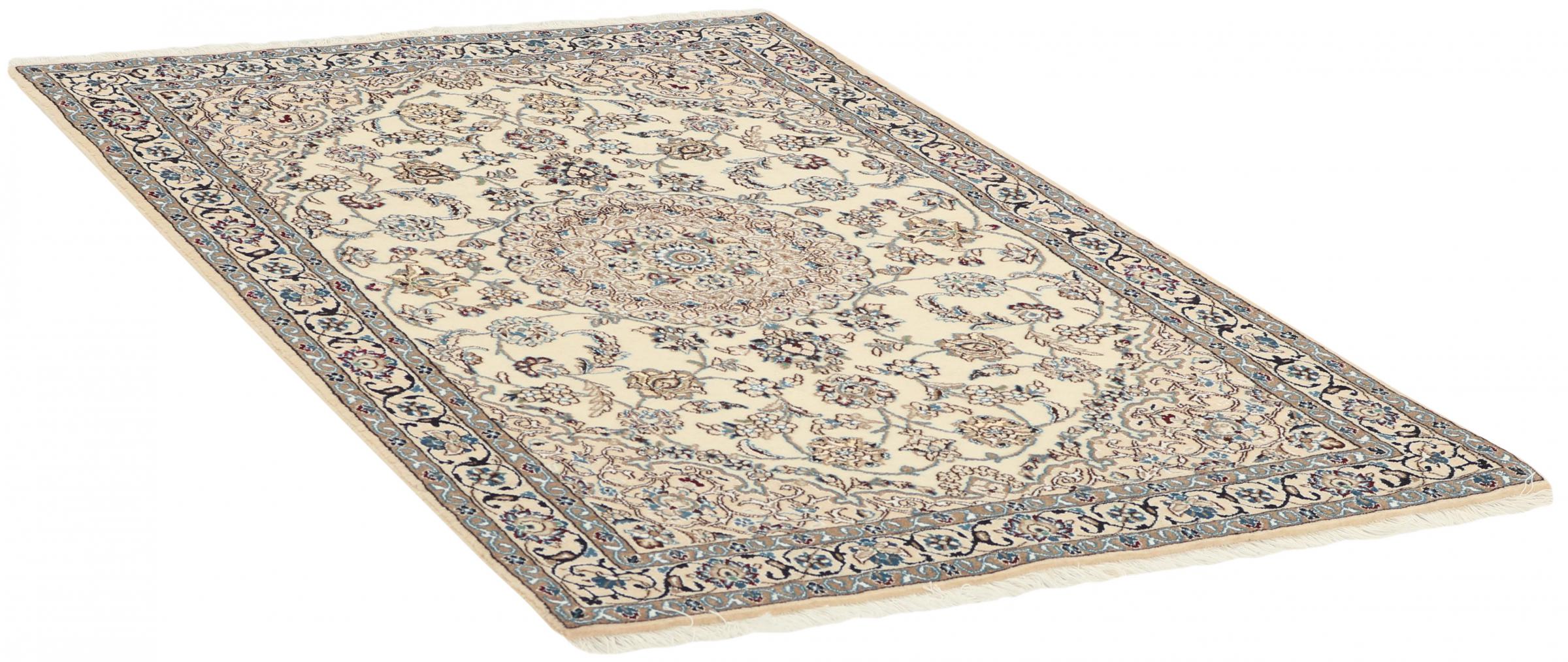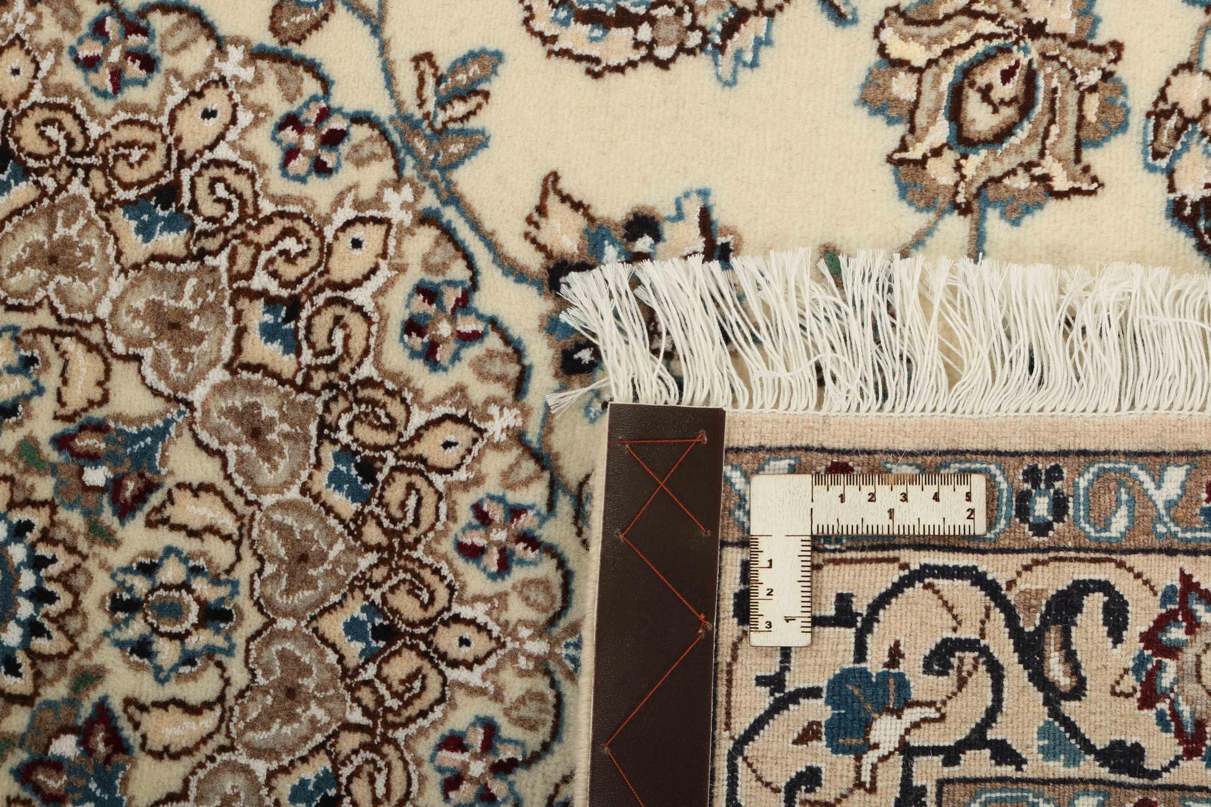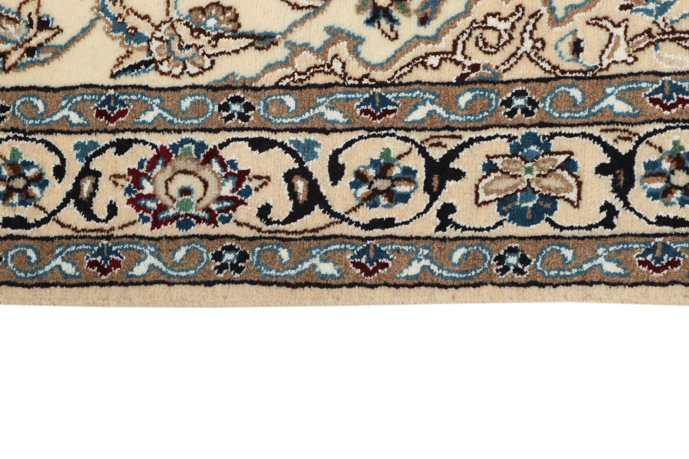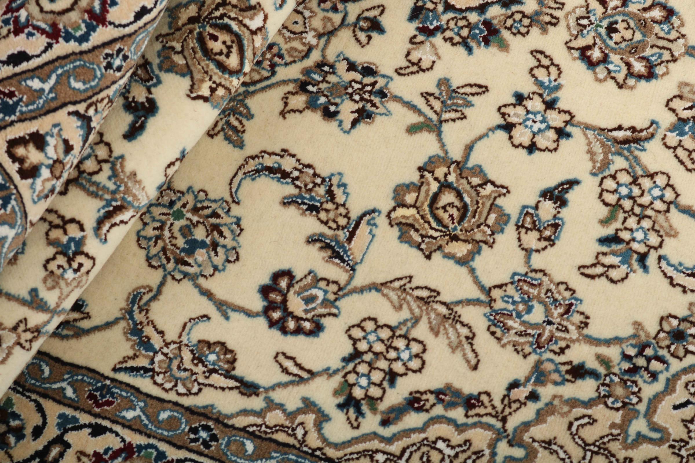This Nain rug is classified as 9La. The excellent quality, the beautiful oriental design with its curvilinear patterns will delight every buyer. This Persian rug was hand-knotted in the city of Nain, which lies on the western edge of the Dasht-e-Kavir desert, from high-quality wool and natural silk. 9La Nain rugs are significantly finer than a 12La and already show beautiful details.