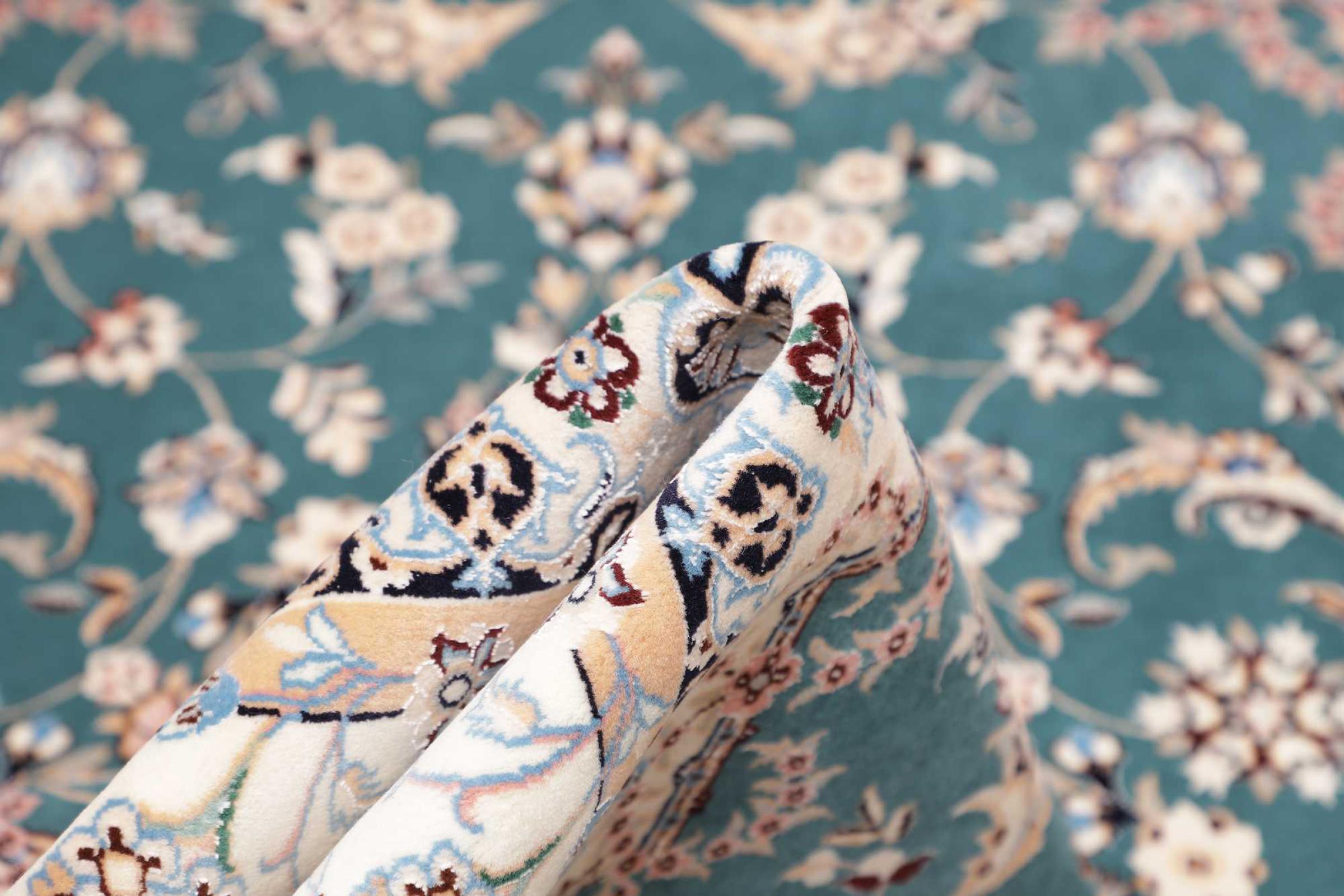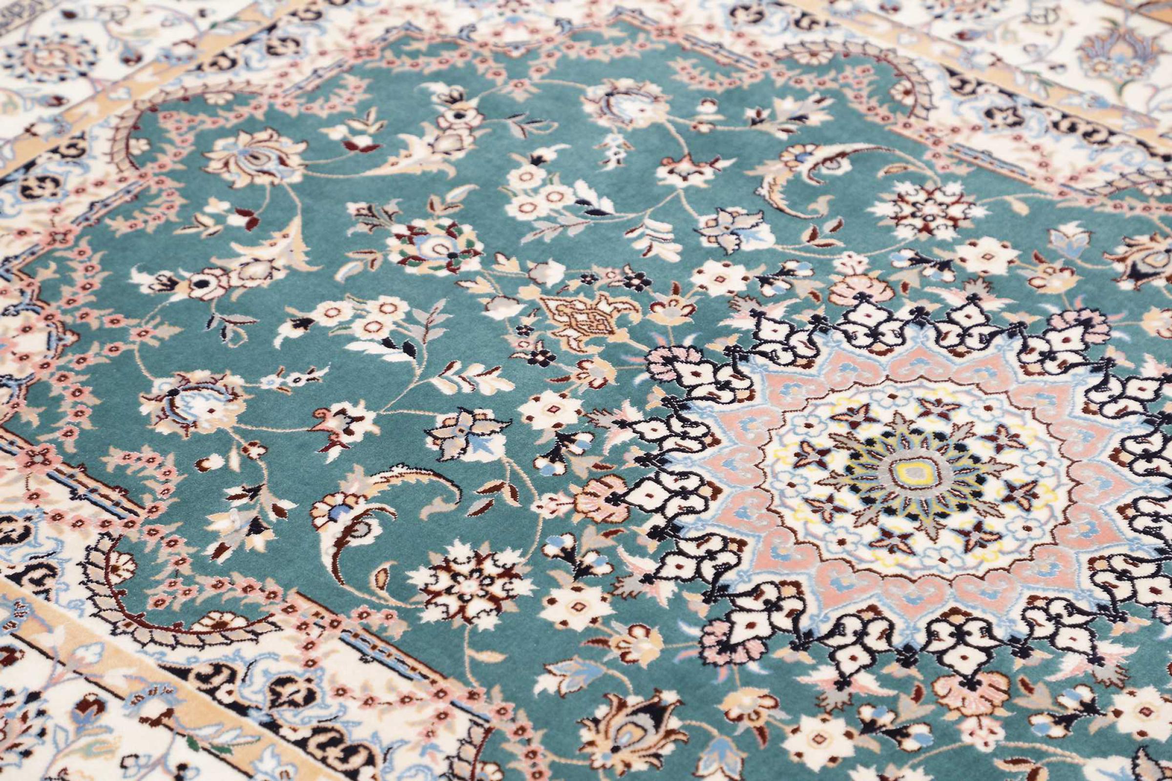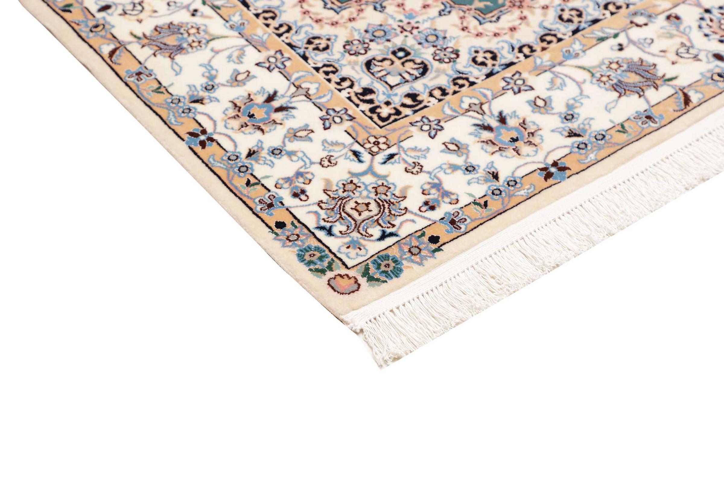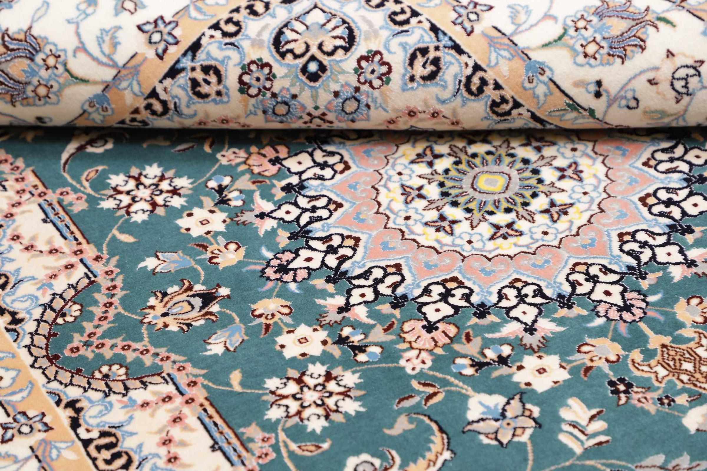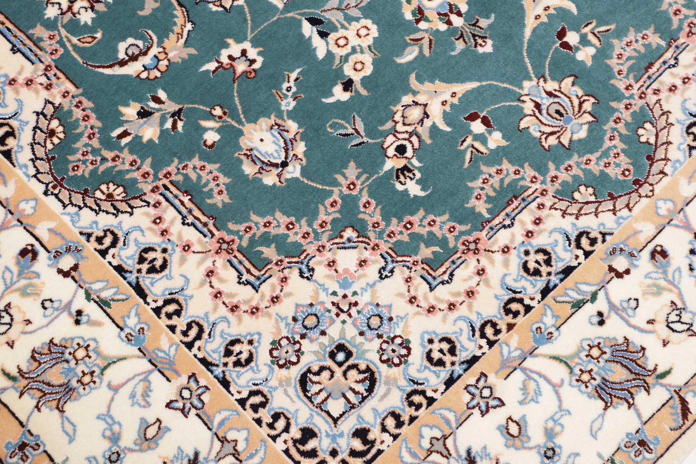 This Nain rug combines quality, tradition and an unmistakable design. It was hand-knotted from high-quality cork wool and natural silk in the desert town of the same name, Nain. Lovers of valuable rugs from Iran will love this Persian rug. With Nain rugs in the 6La and 4La classifications, you have a real work of art with an incredible level of detail that you can really lose yourself in. Nain 4La rugs are almost impossible to find today, as they are extremely elaborate to produce.