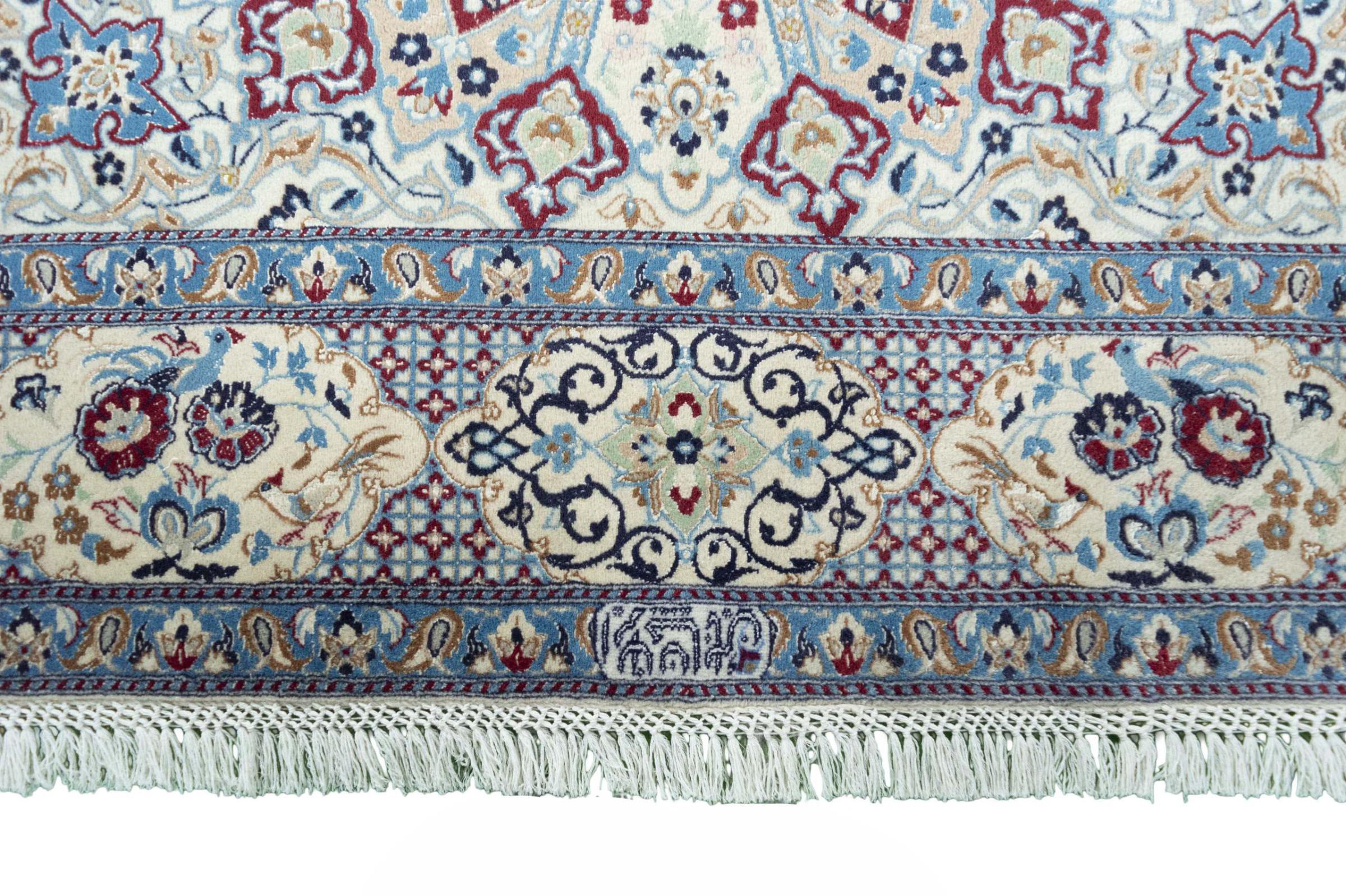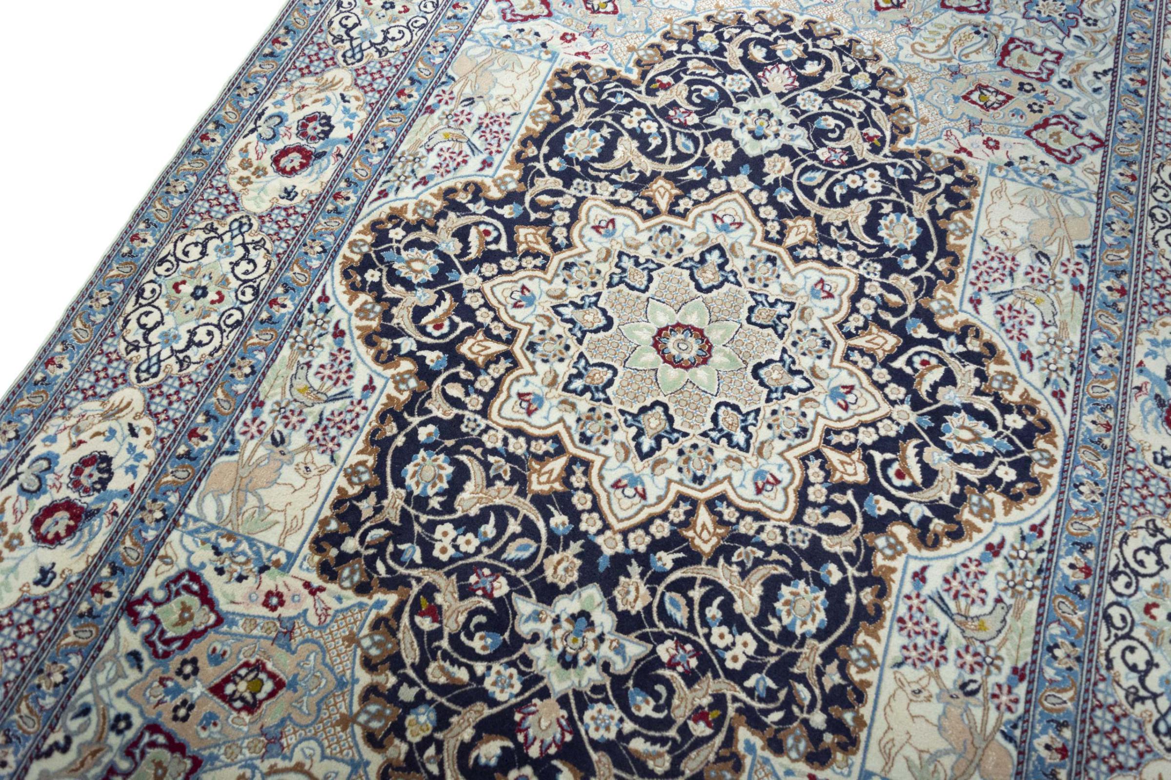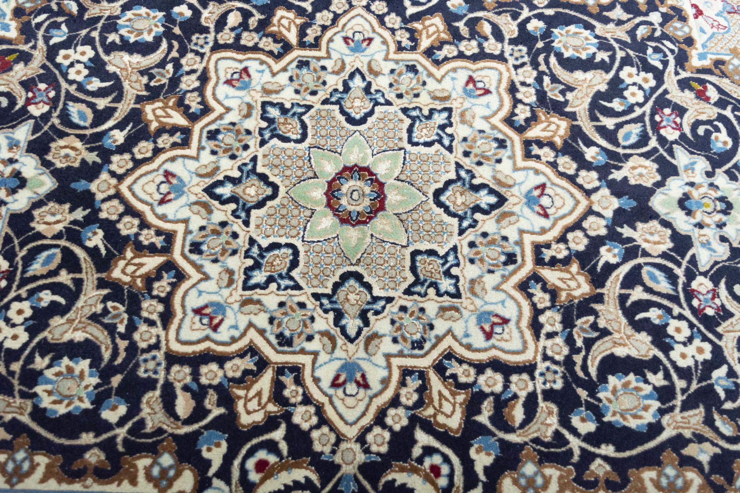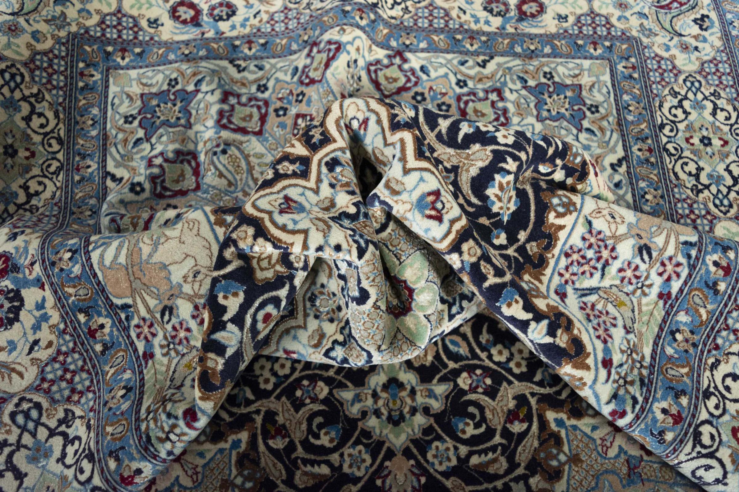 This Nain rug combines quality, tradition and an unmistakable design. It was hand-knotted from high-quality cork wool and natural silk in the desert town of the same name, Nain. Lovers of valuable rugs from Iran will love this Persian rug. With Nain rugs in the 6La and 4La classifications, you have a real work of art with an incredible level of detail that you can really lose yourself in. Nain 4La rugs are almost impossible to find today, as they are extremely elaborate to produce.