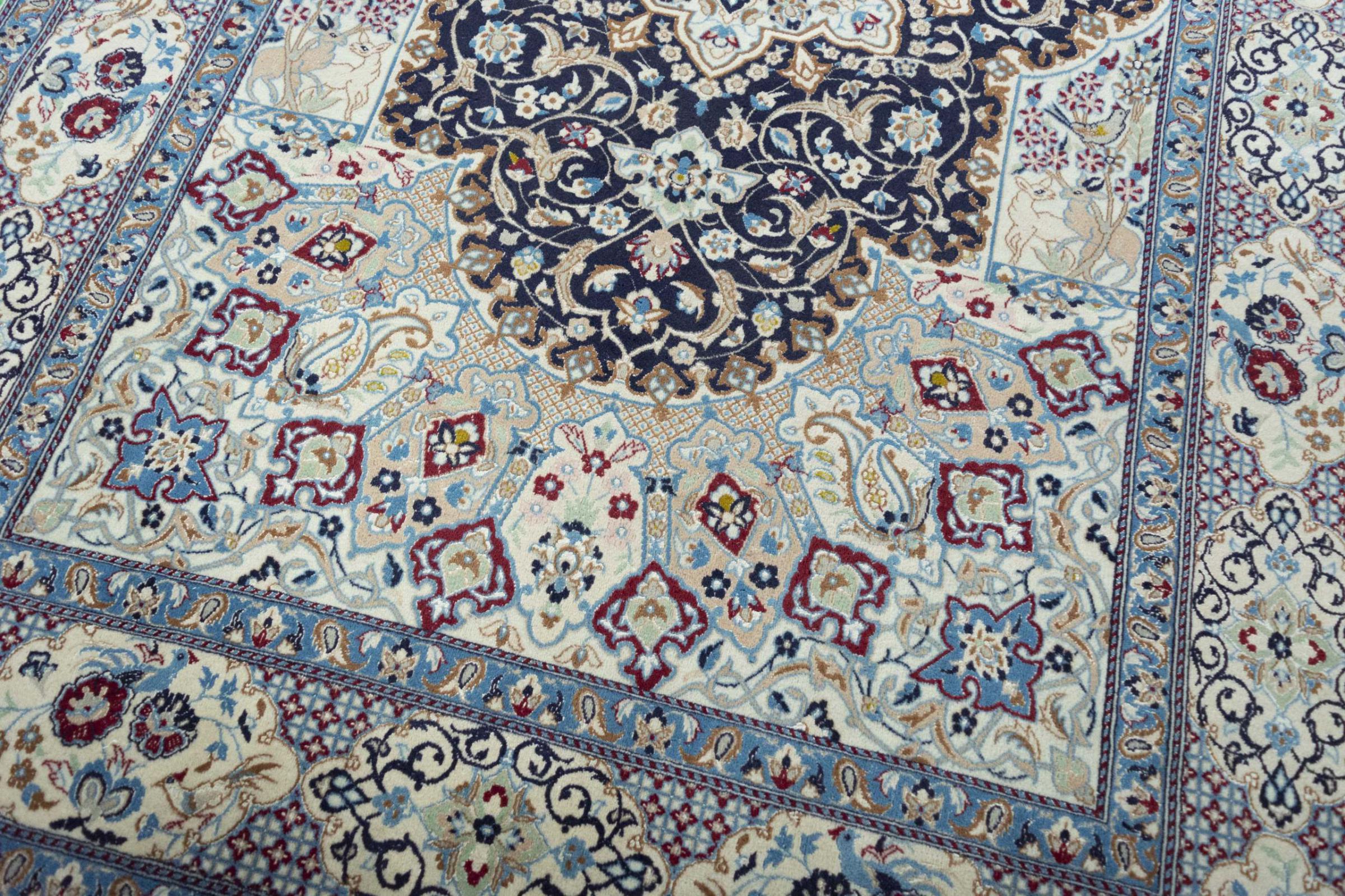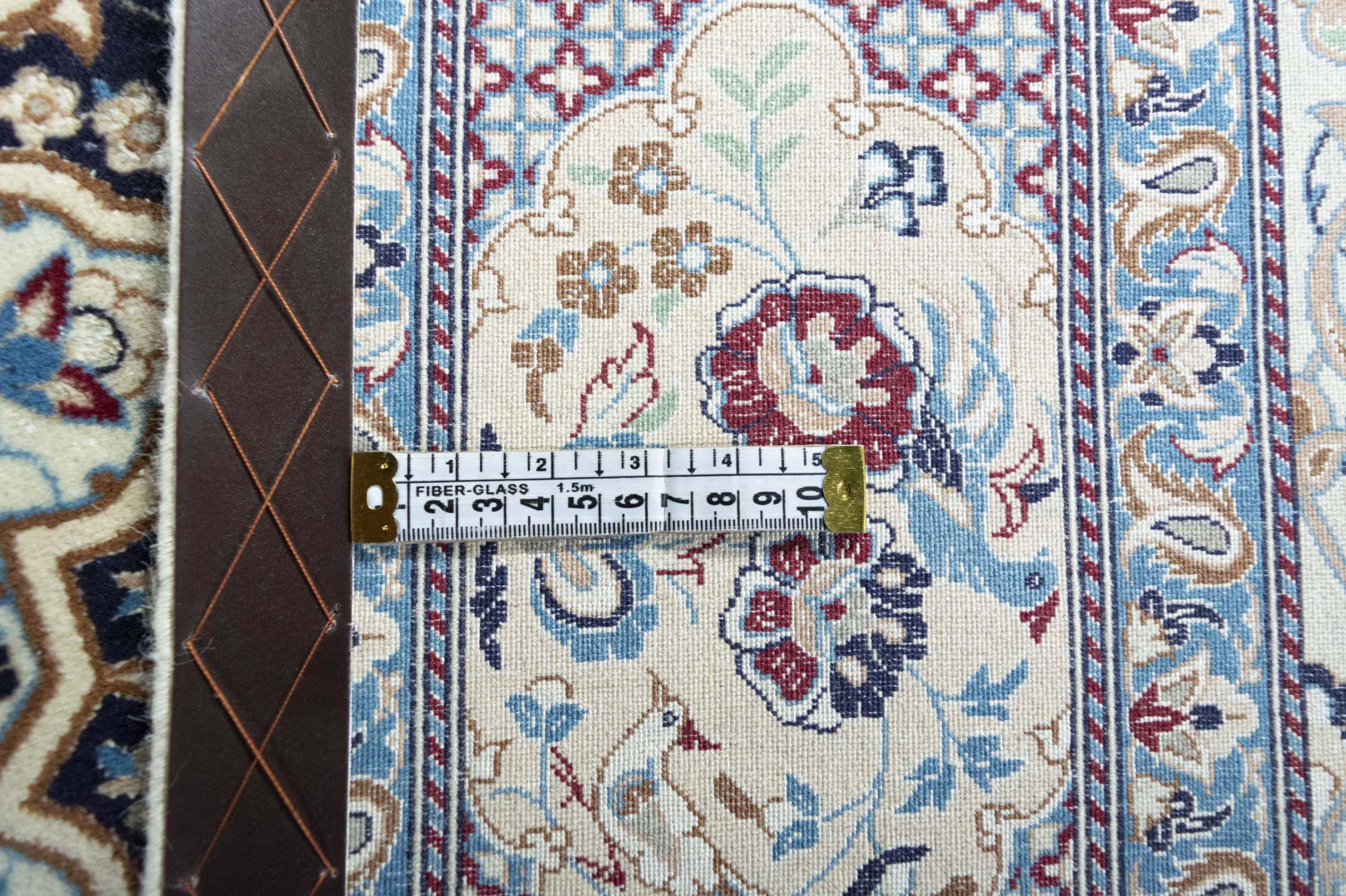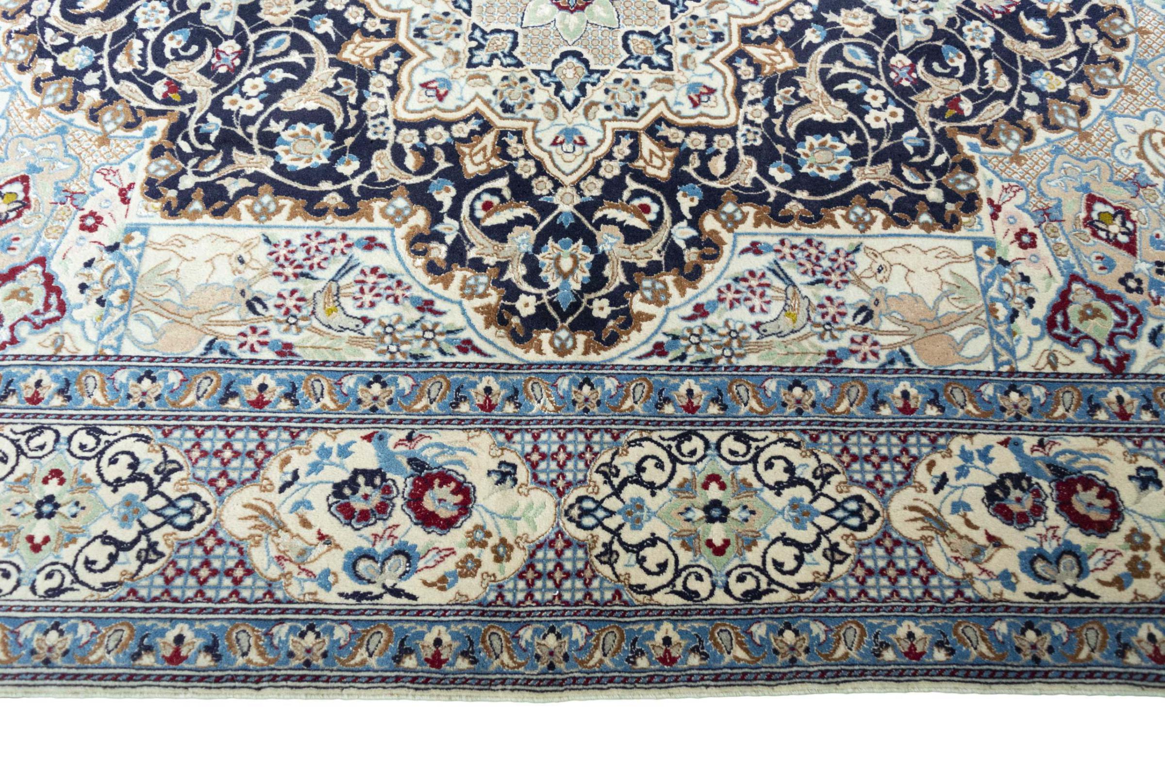 This Nain rug combines quality, tradition and an unmistakable design. It was hand-knotted from high-quality cork wool and natural silk in the desert town of the same name, Nain. Lovers of valuable rugs from Iran will love this Persian rug. With Nain rugs in the 6La and 4La classifications, you have a real work of art with an incredible level of detail that you can really lose yourself in. Nain 4La rugs are almost impossible to find today, as they are extremely elaborate to produce.