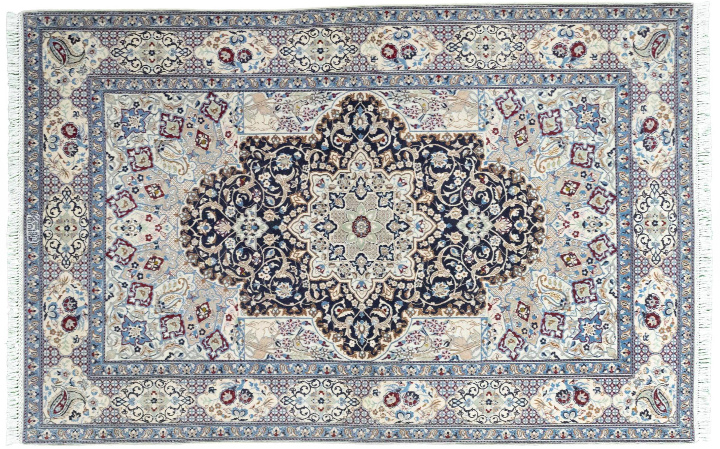 Rugs from the city of Nain, from the border of one of the largest deserts in Iran, are among the most famous Persian rugs in the world. Their typical design is characterized by floral ornaments, a medallion in the middle as well as beige and red or blue shades. Thanks to their designations 4La, 6La, 9La and 12La, the finenesses of a Nain rug can be seen at a glance. The lower the "La" number, the higher the knot density and thus the finer the rug.