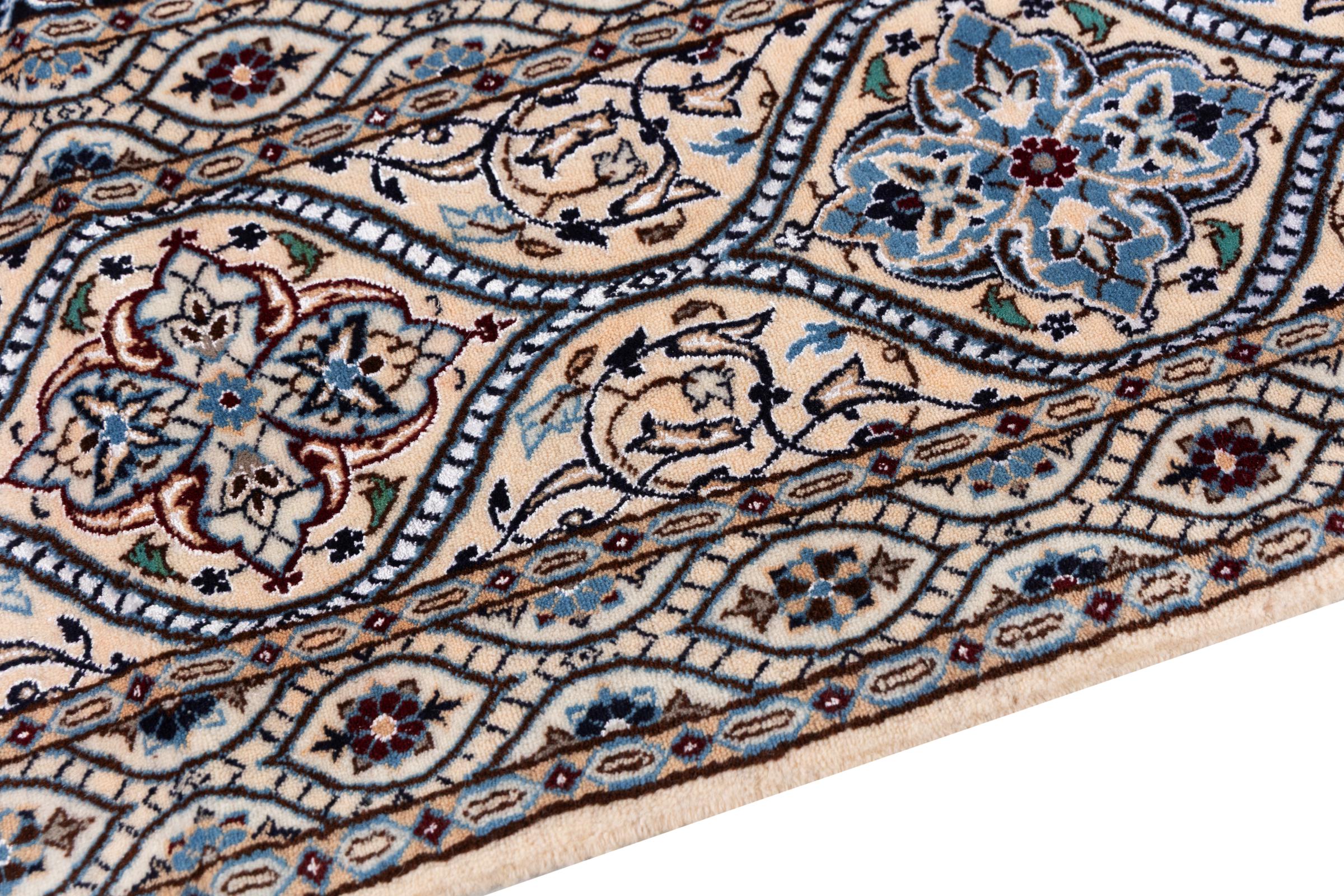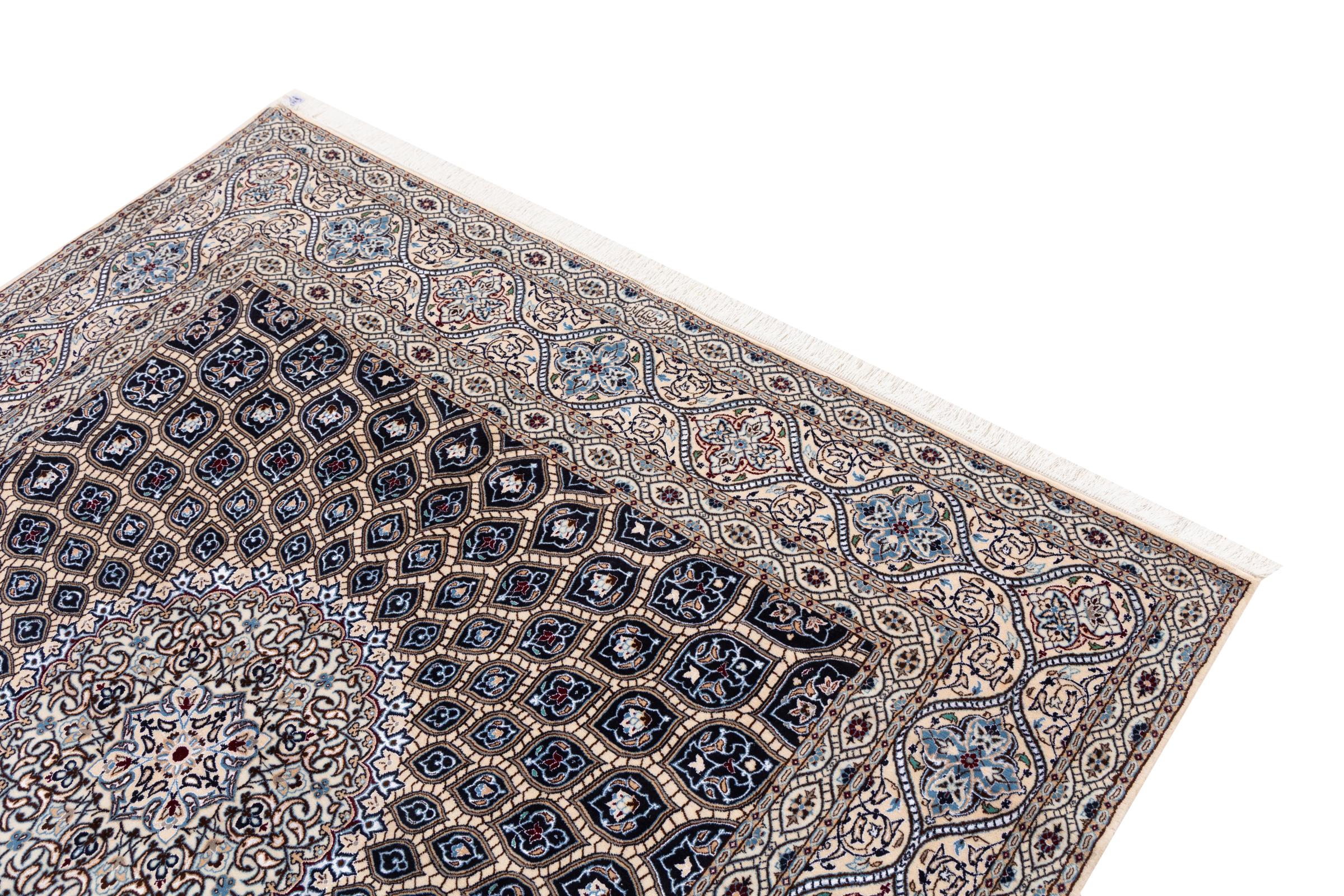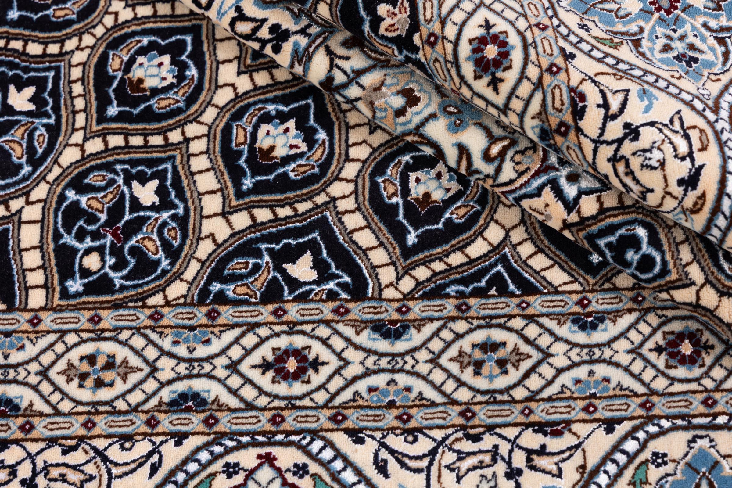 This Nain rug combines quality, tradition and an unmistakable design. It was hand-knotted from high-quality cork wool and natural silk in the desert town of the same name, Nain. Lovers of valuable rugs from Iran will love this Persian rug. With Nain rugs in the 6La and 4La classifications, you have a real work of art with an incredible level of detail that you can really lose yourself in. Nain 4La rugs are almost impossible to find today, as they are extremely elaborate to produce.